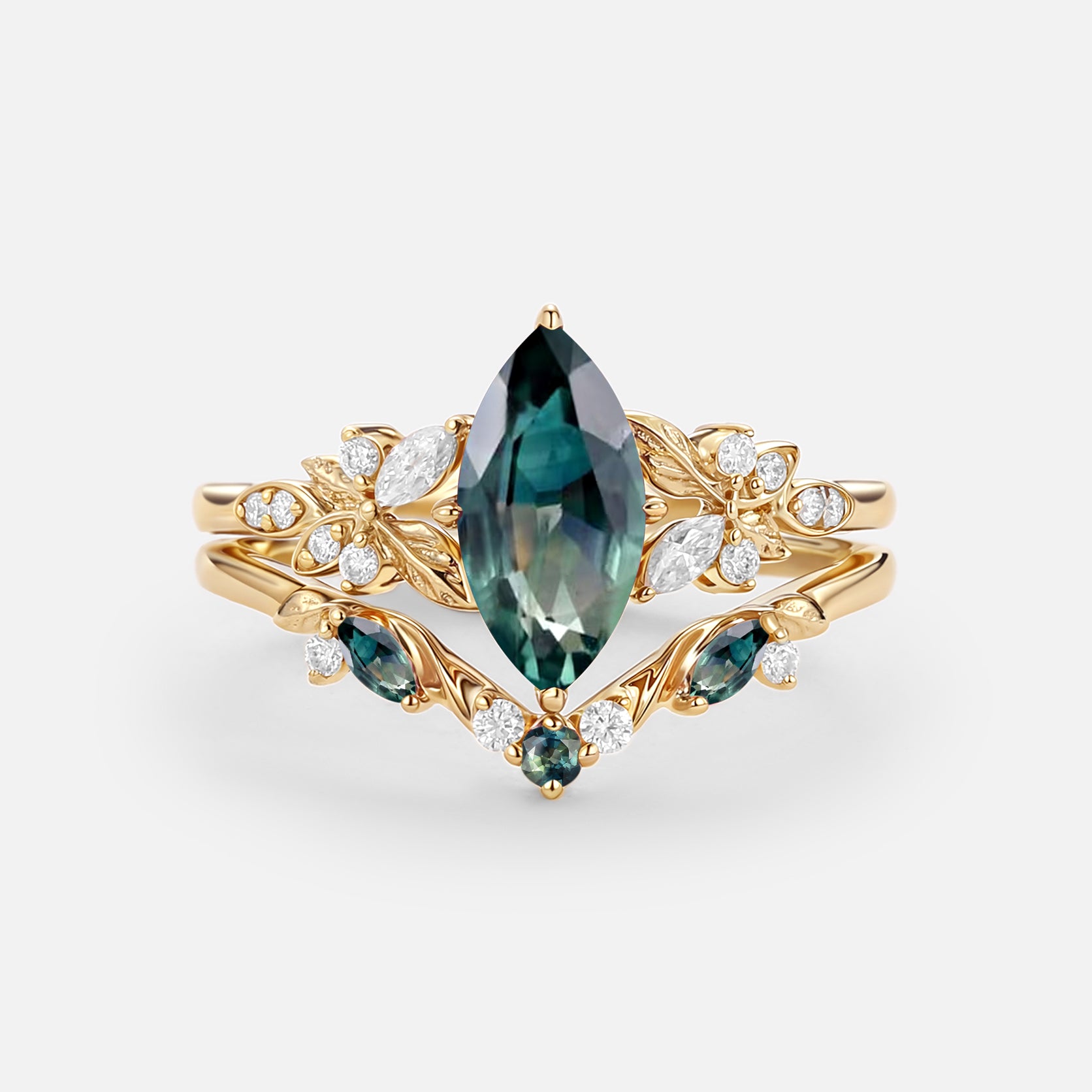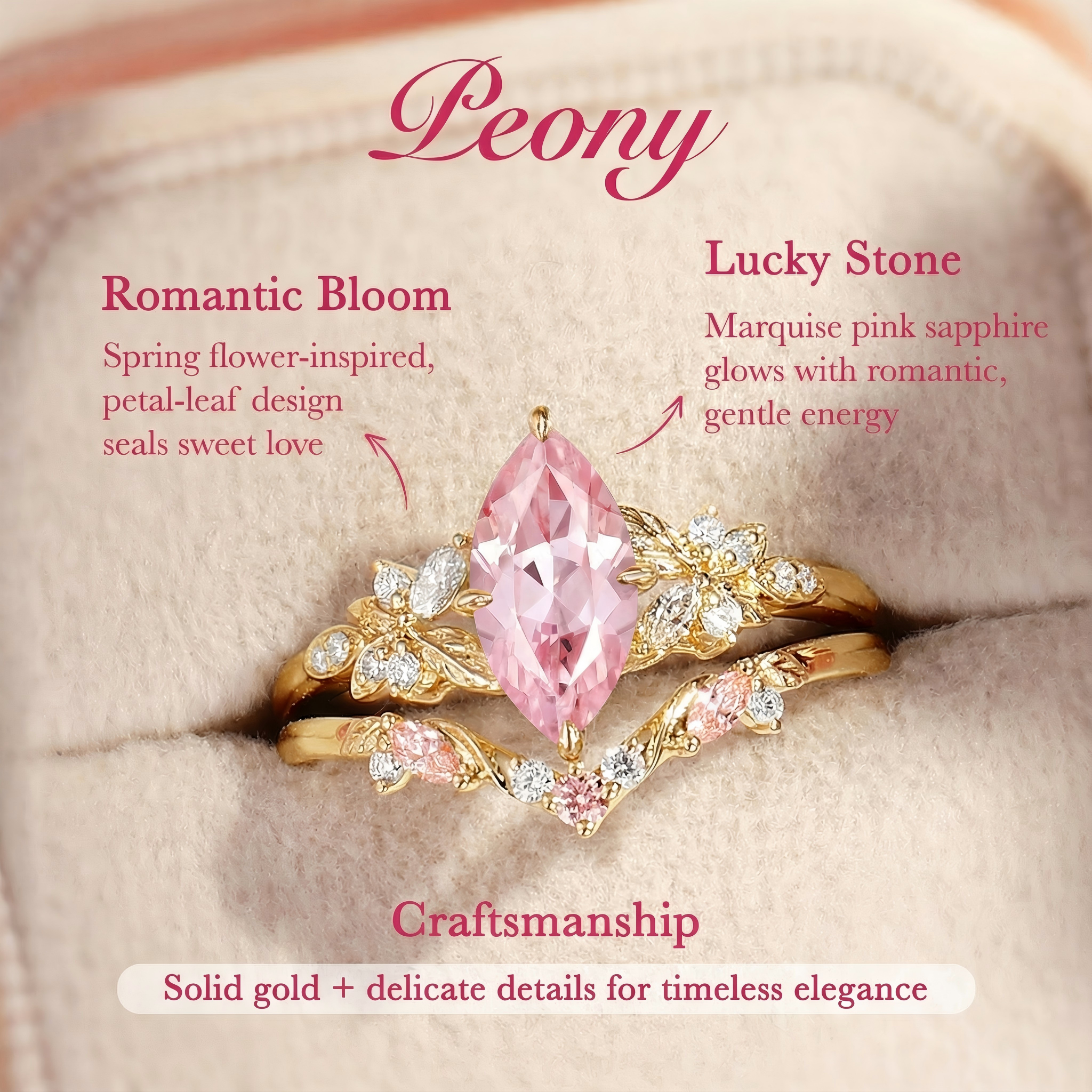 Embrace the delicate charm of the Peony engagement ring. The luminous blush-pink marquise sapphire at its core, shaped into a sleek elongated marquise, boasts brilliant facets that catch light to cast a soft, captivating sparkle with every movement. It’s gracefully secured by four slender prongs, while the two separate bands are adorned with exquisitely carved vine and leaf patterns—dotted with tiny marquise-cut pink sapphires and shimmering white moissanites that glint like crystal-clear dewdrops clinging to foliage. This intricate detailing lets the ring exude natural elegance from every angle. Named the Peony, this engagement ring set is designed to symbolize tender, enduring love and the quiet, timeless beauty of nature-inspired craftsmanship.