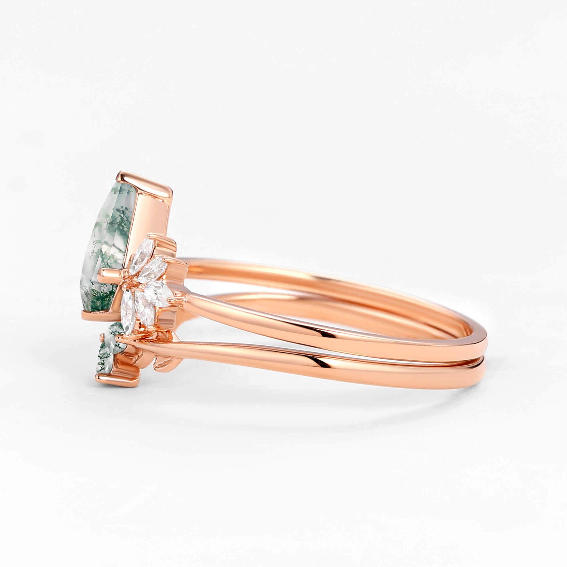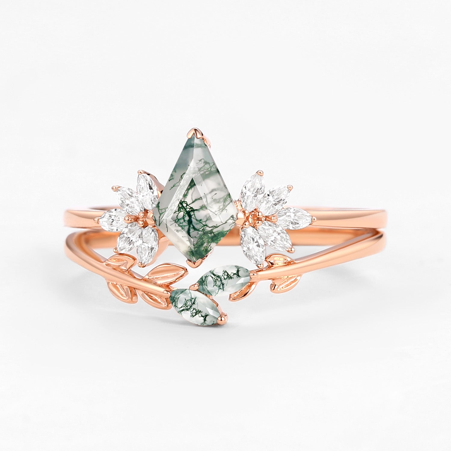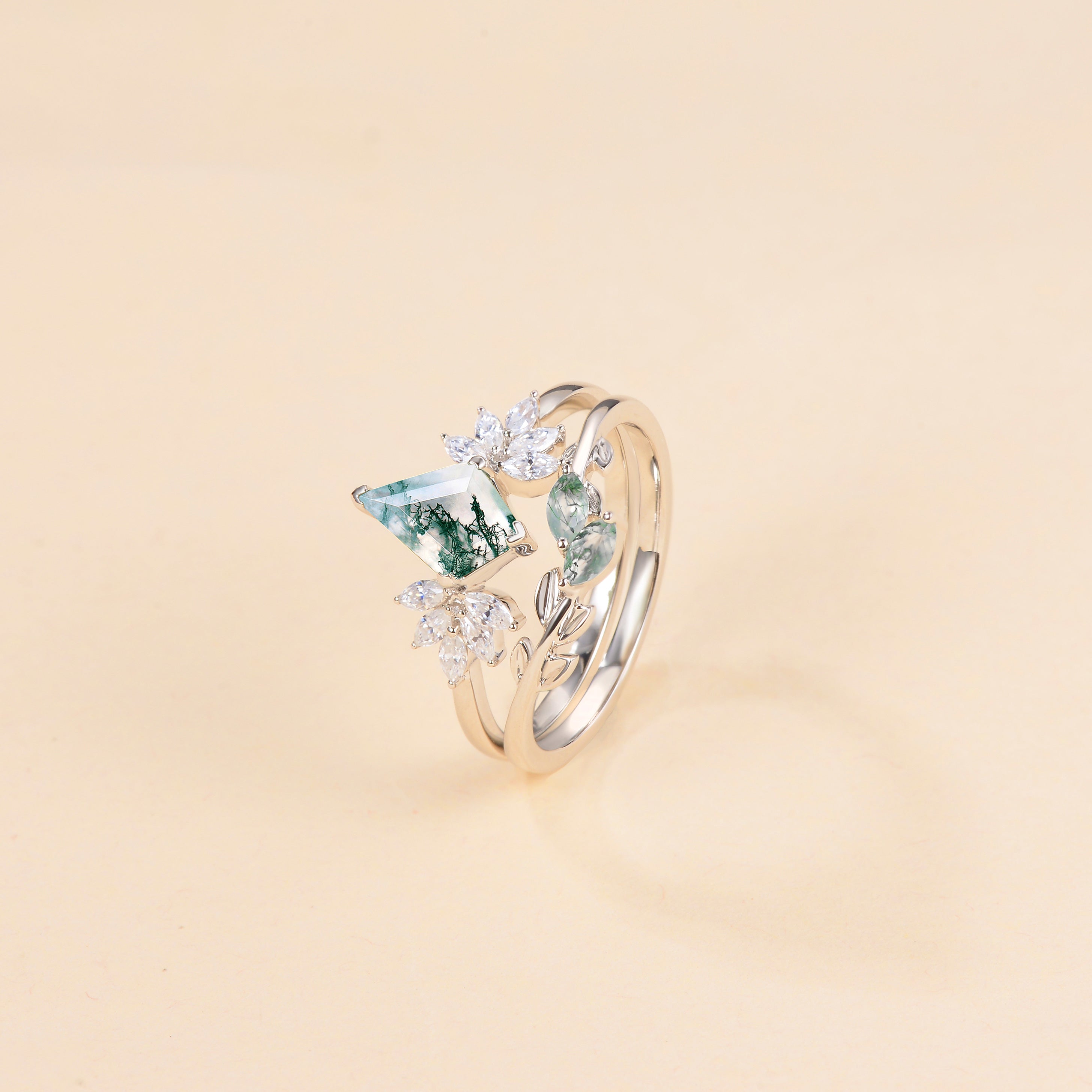 Fairy Ring - Moss Agate Leafy Forest Elves Engagement Ring Set 2pcs - Amayah