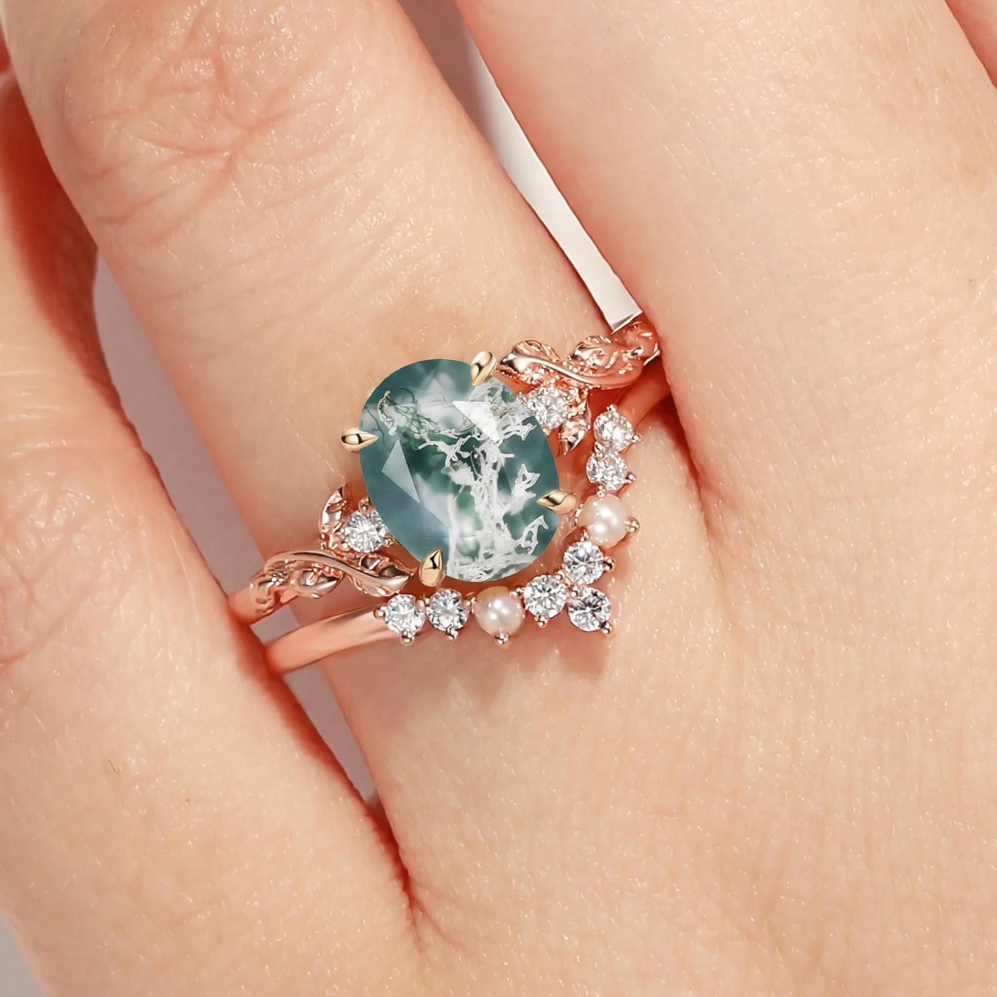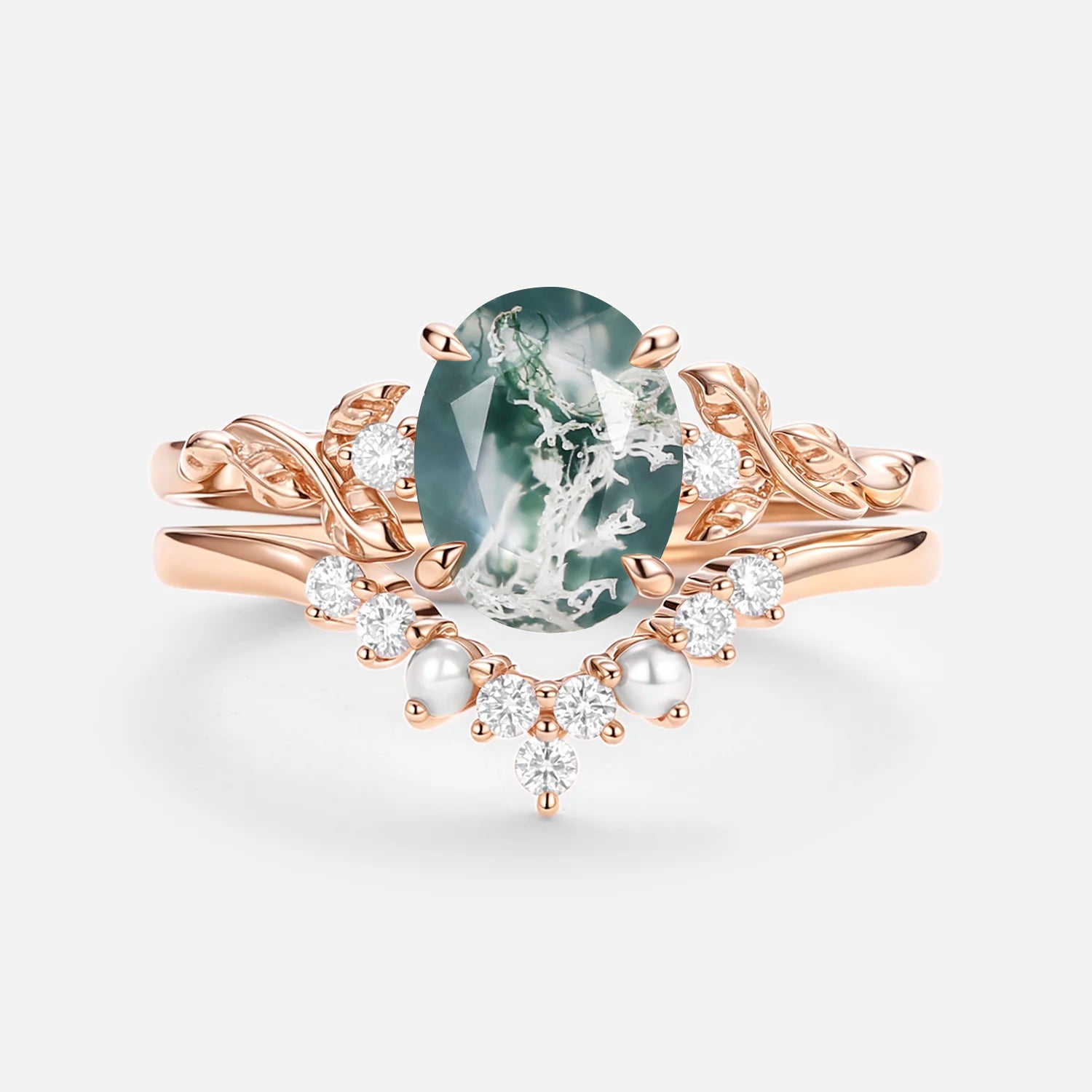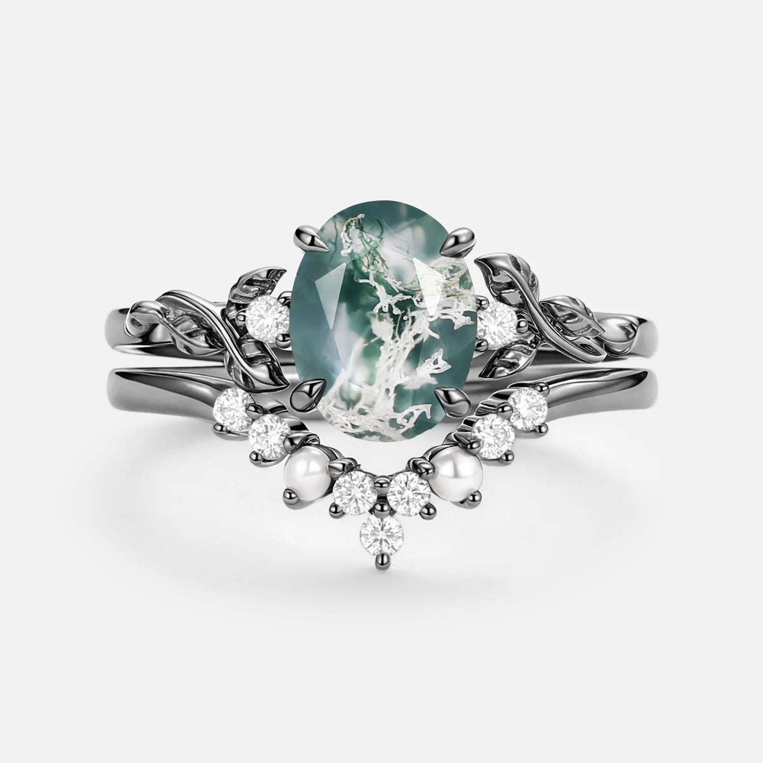 Felicegals Oval Moss Agate White Gold Leafy Ring Set 2pcs Moss Agate Engagement Ring Stacking Wedding Ring Anniversary Promise Women Gift