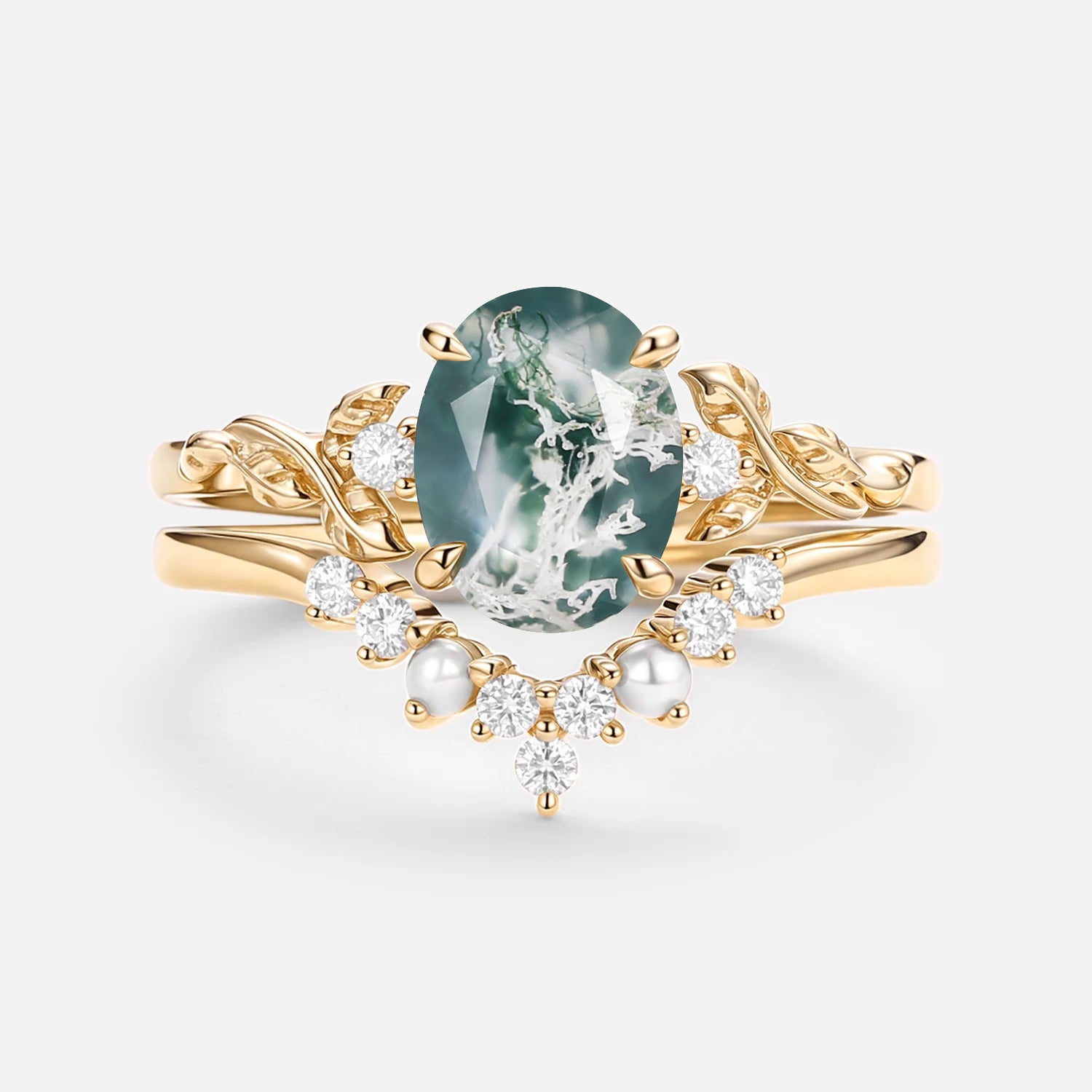 Oval Cut Nature Moss Agate Leafy Gold Ring Set 2pcs - Clover