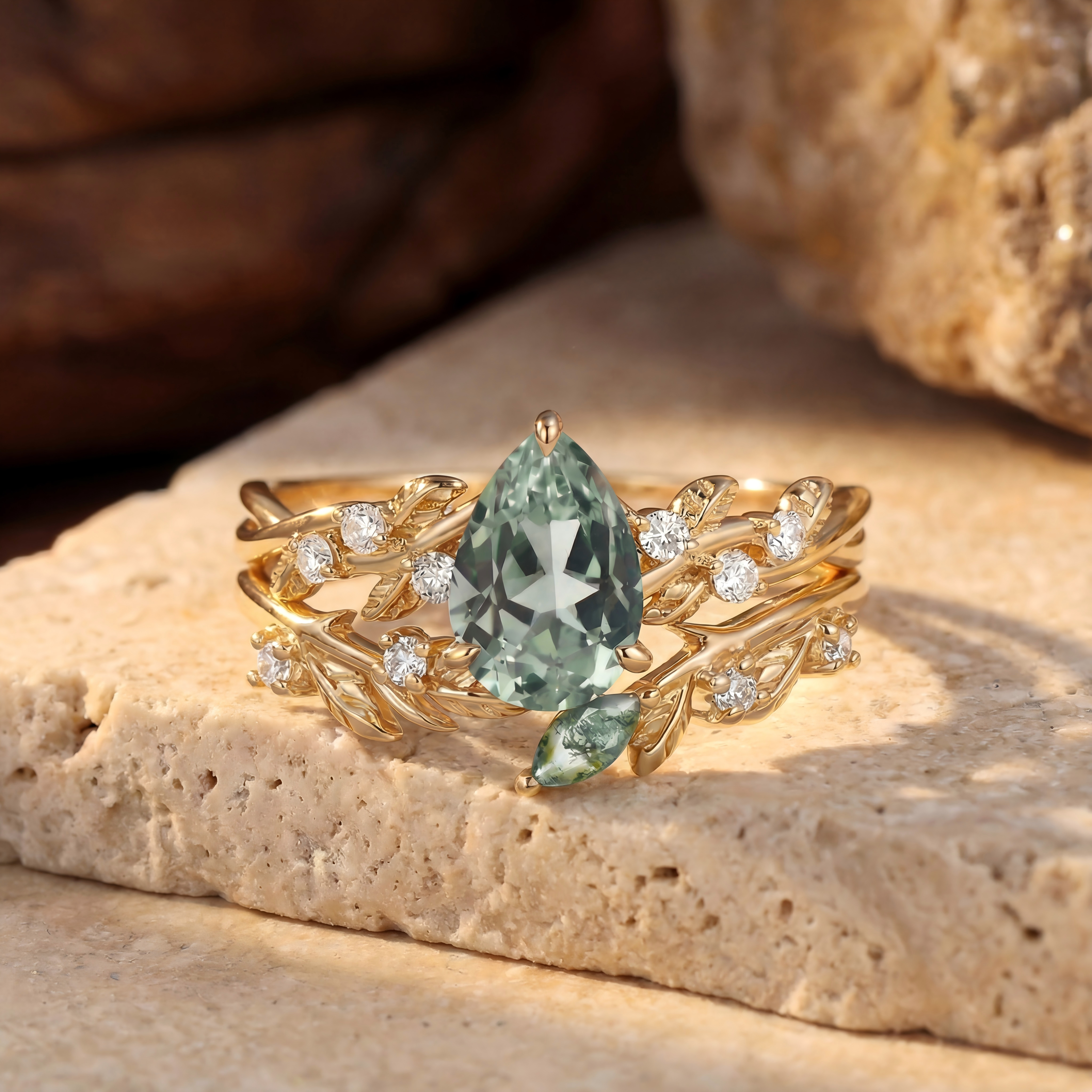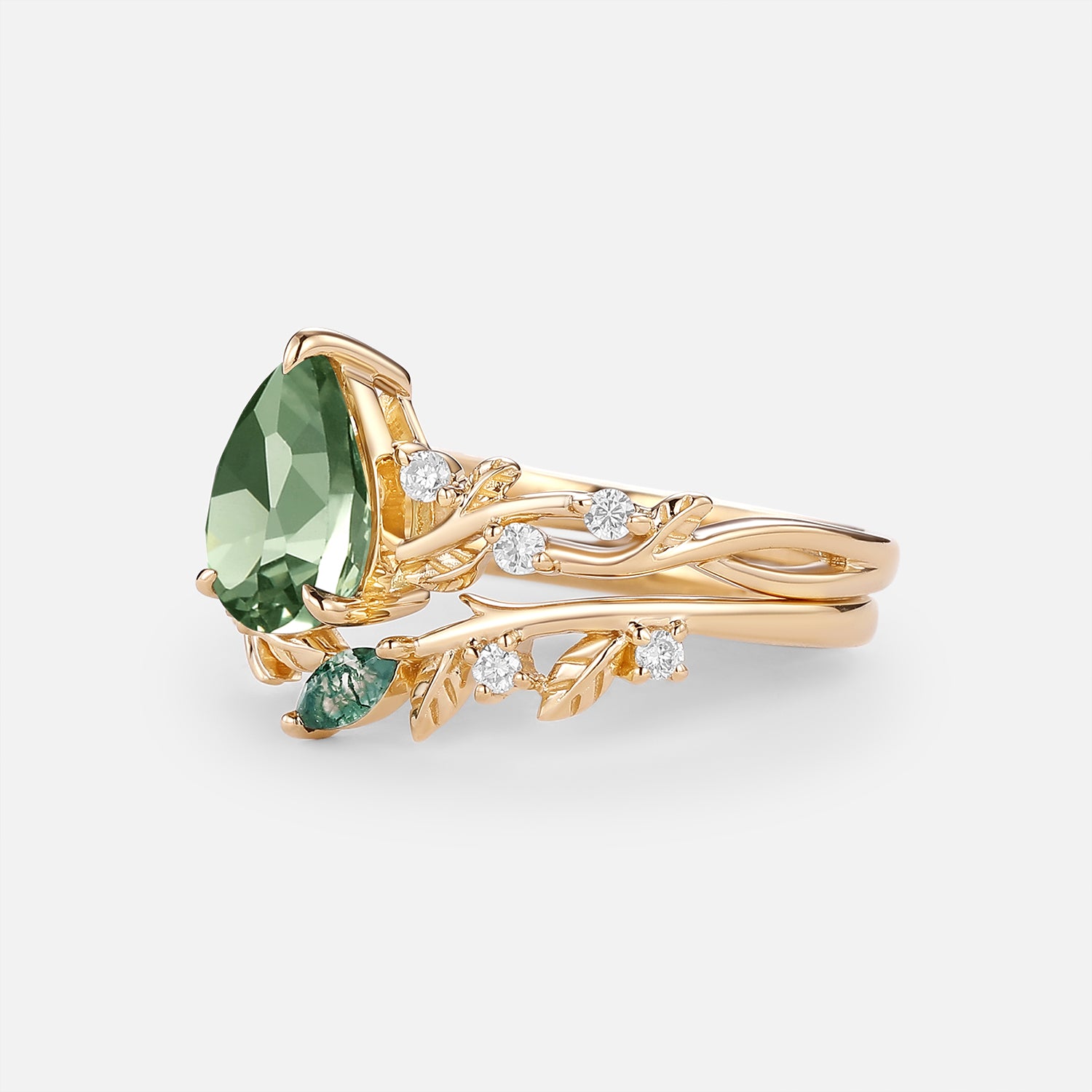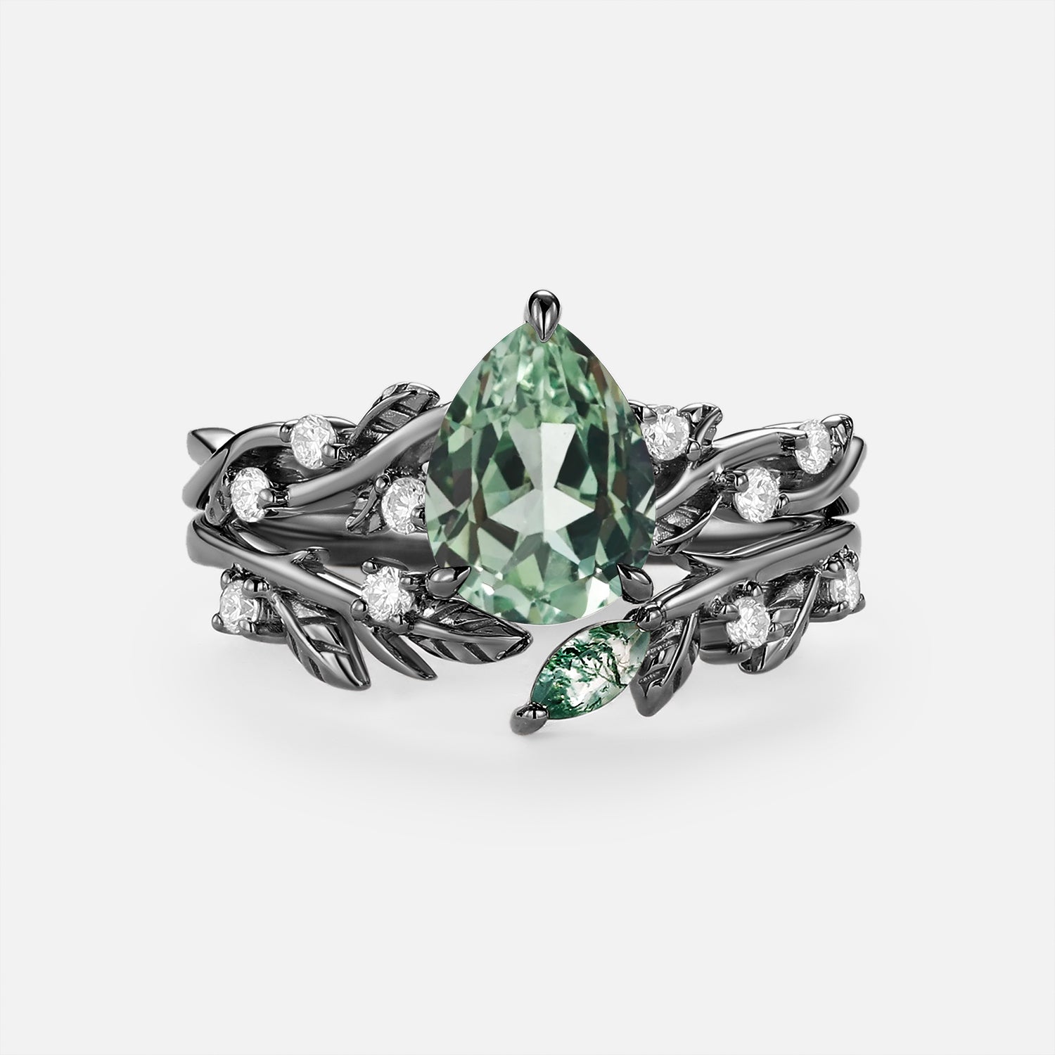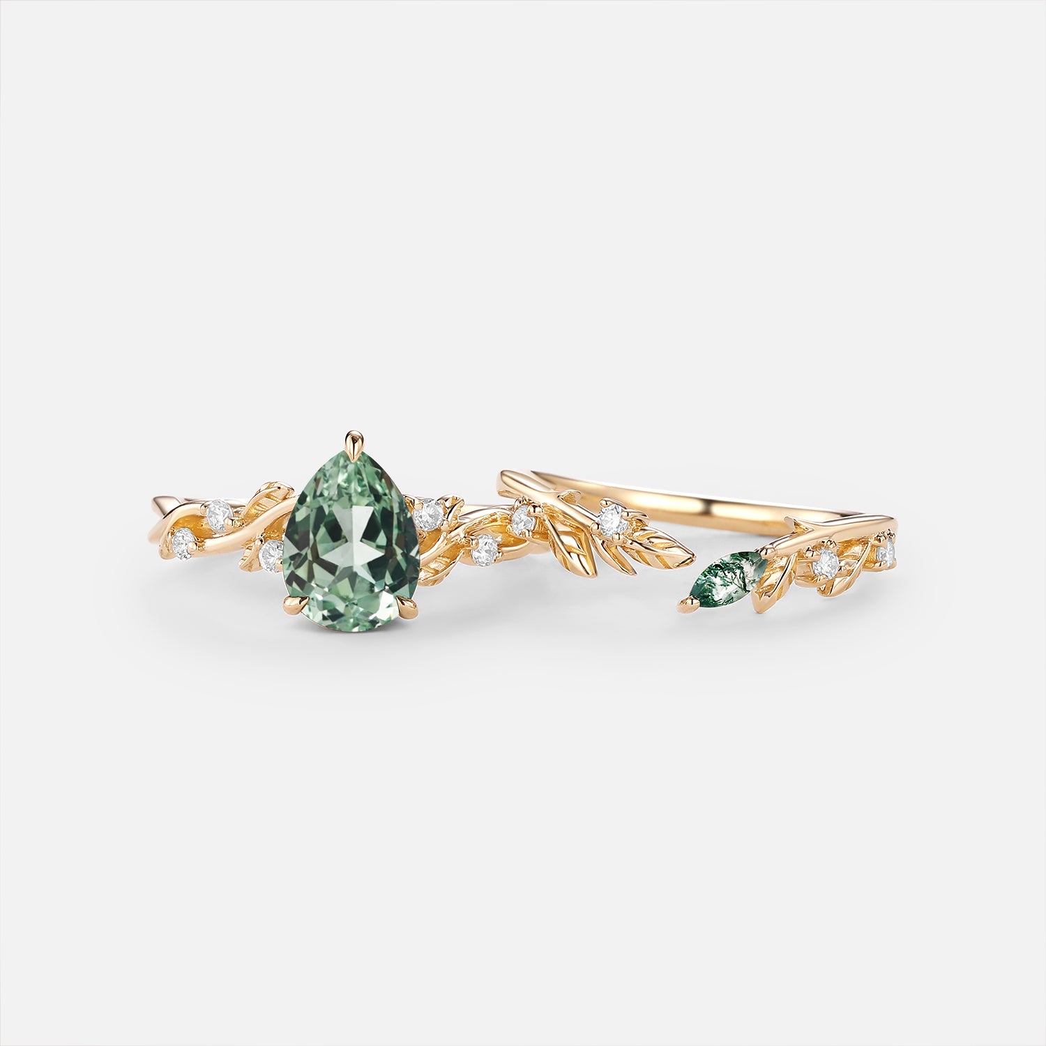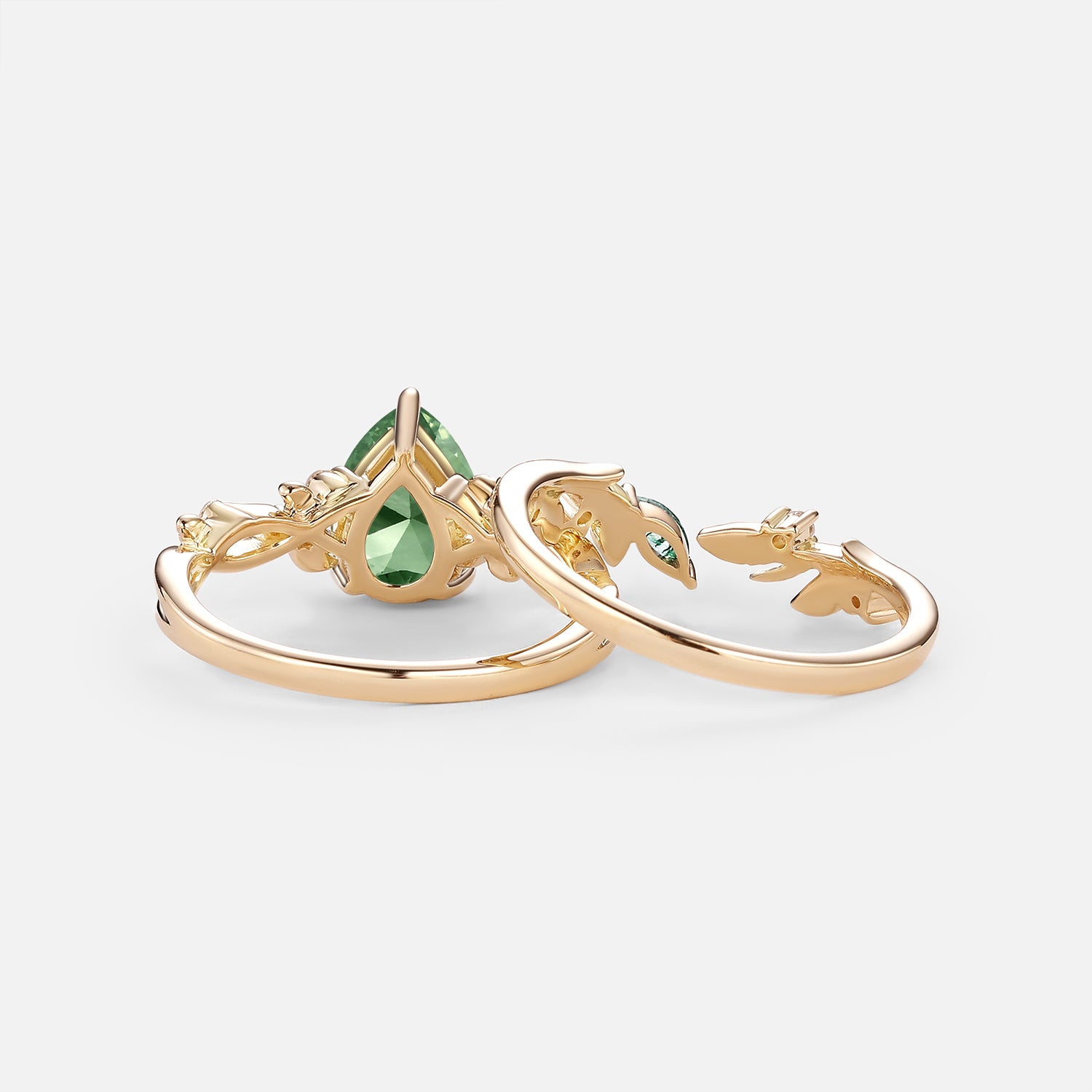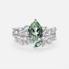 Pear Cut Leafy Lab Green Sapphire Engagement Ring Set 2pcs - Leto