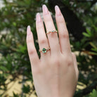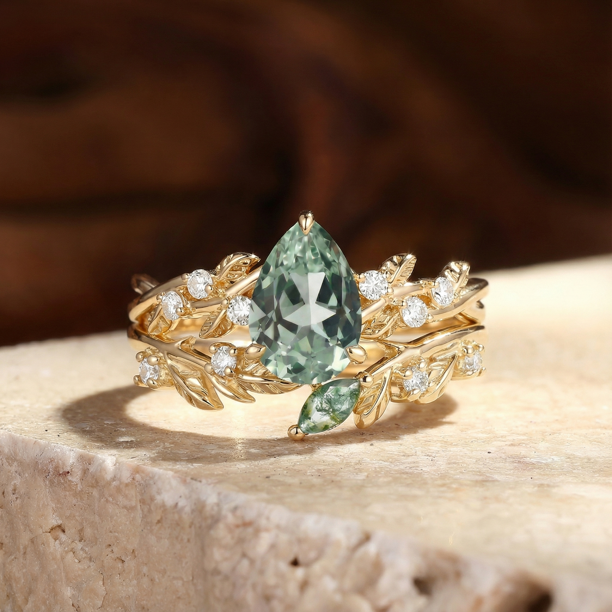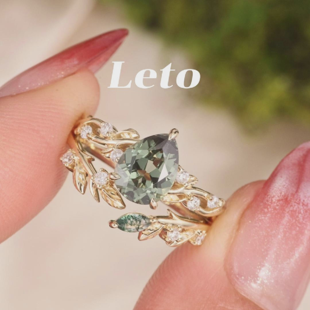 Embrace the earthy elegance of the Leto engagement ring set. The luminous lab green sapphire at its core, shaped into a sleek pear cut with dazzling, light-catching facets, casts a soft yet vivid glow with every subtle movement. It’s delicately secured by streamlined prongs, while both bands of the 2pcs set are adorned with exquisitely carved leafy patterns—echoing the graceful curl of foliage unfurling in a sunlit glade. This intricate detailing lets the ring exude understated natural charm from every angle.