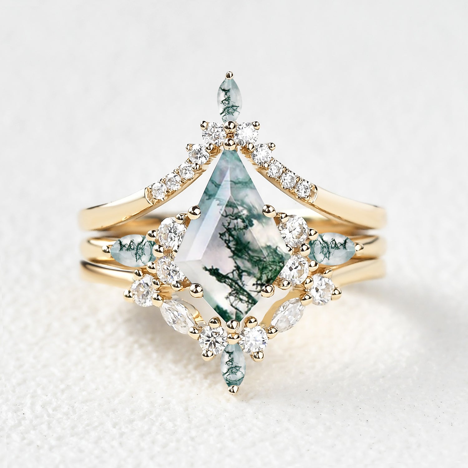 Unique Kite Cut Green Moss Agate Chevron Engagement Ring Set 3pcs - Tessa