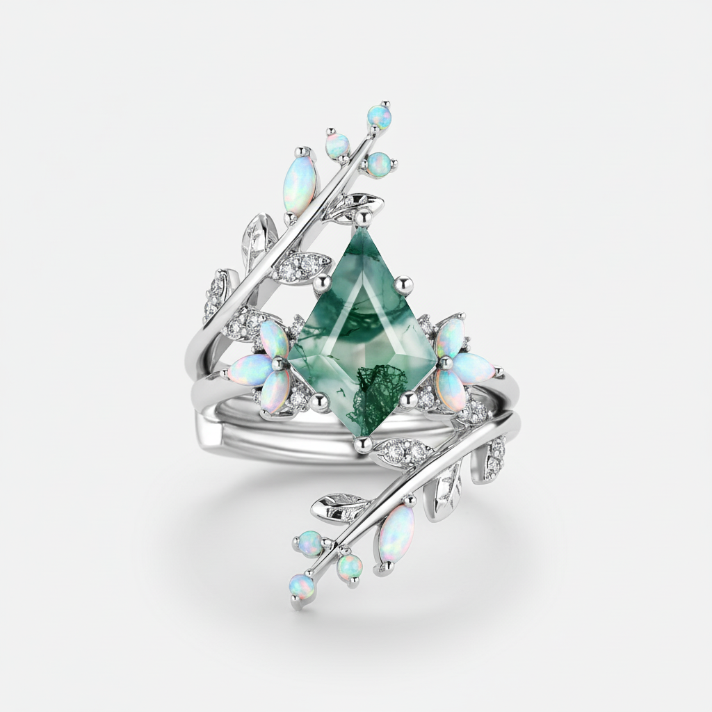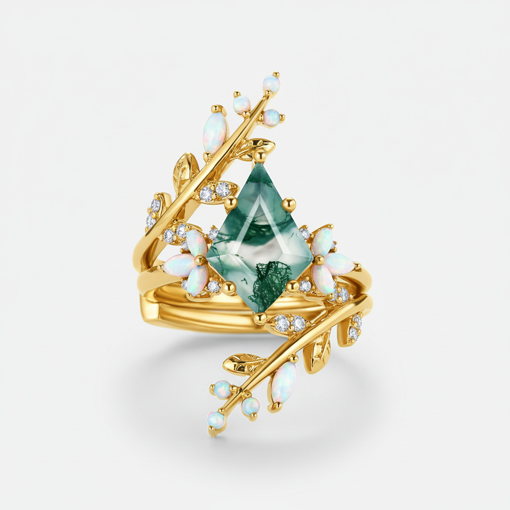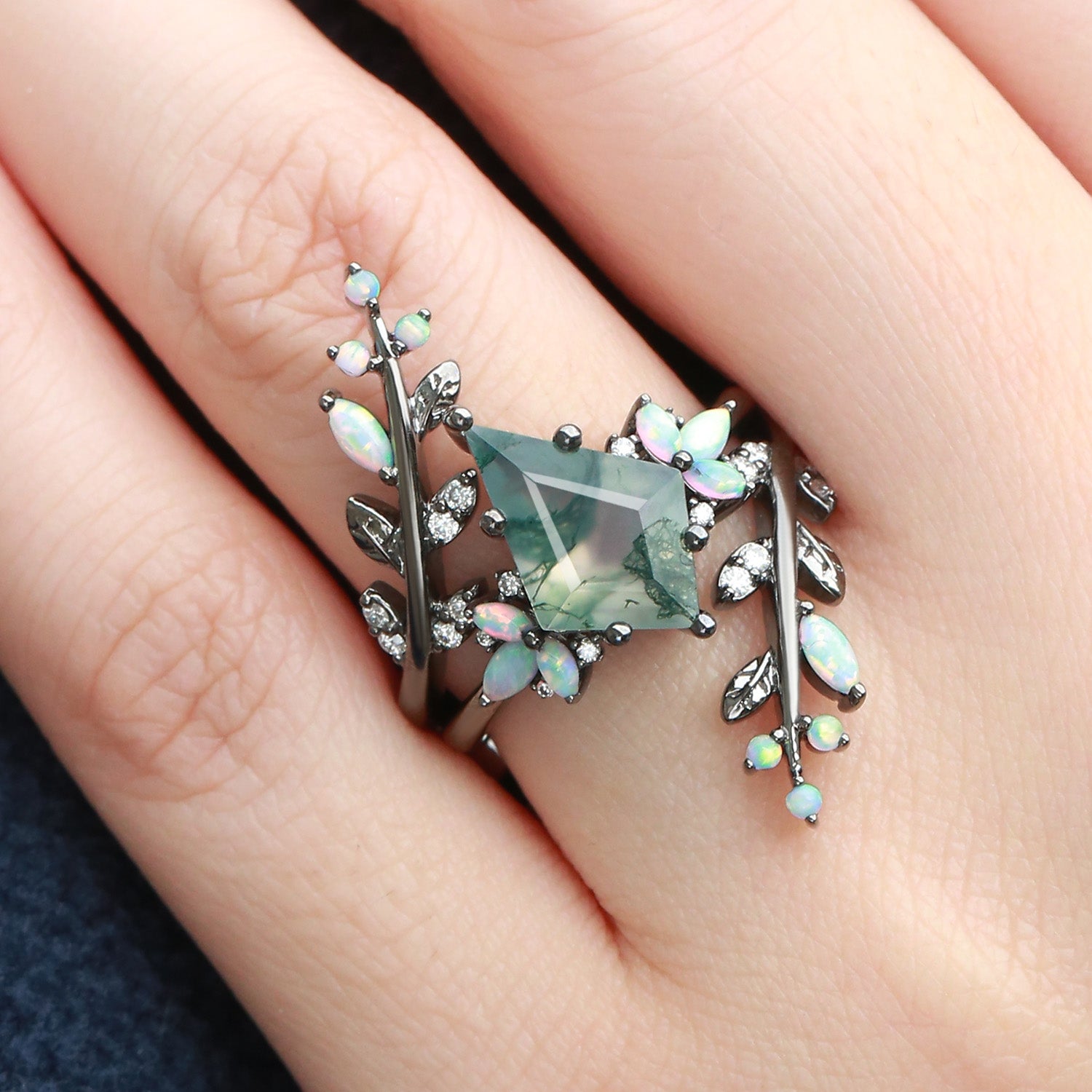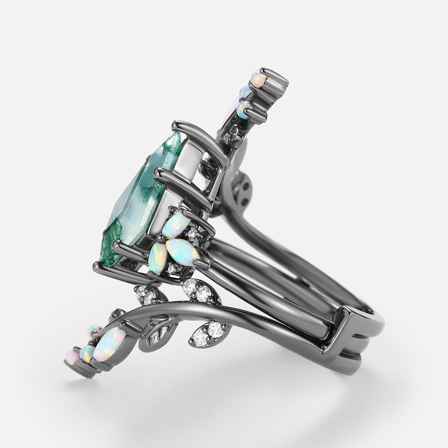 Kite Cut Black Gold Moss Agate & Opal Cage Leafy Engagement Ring 2pcs - Knight