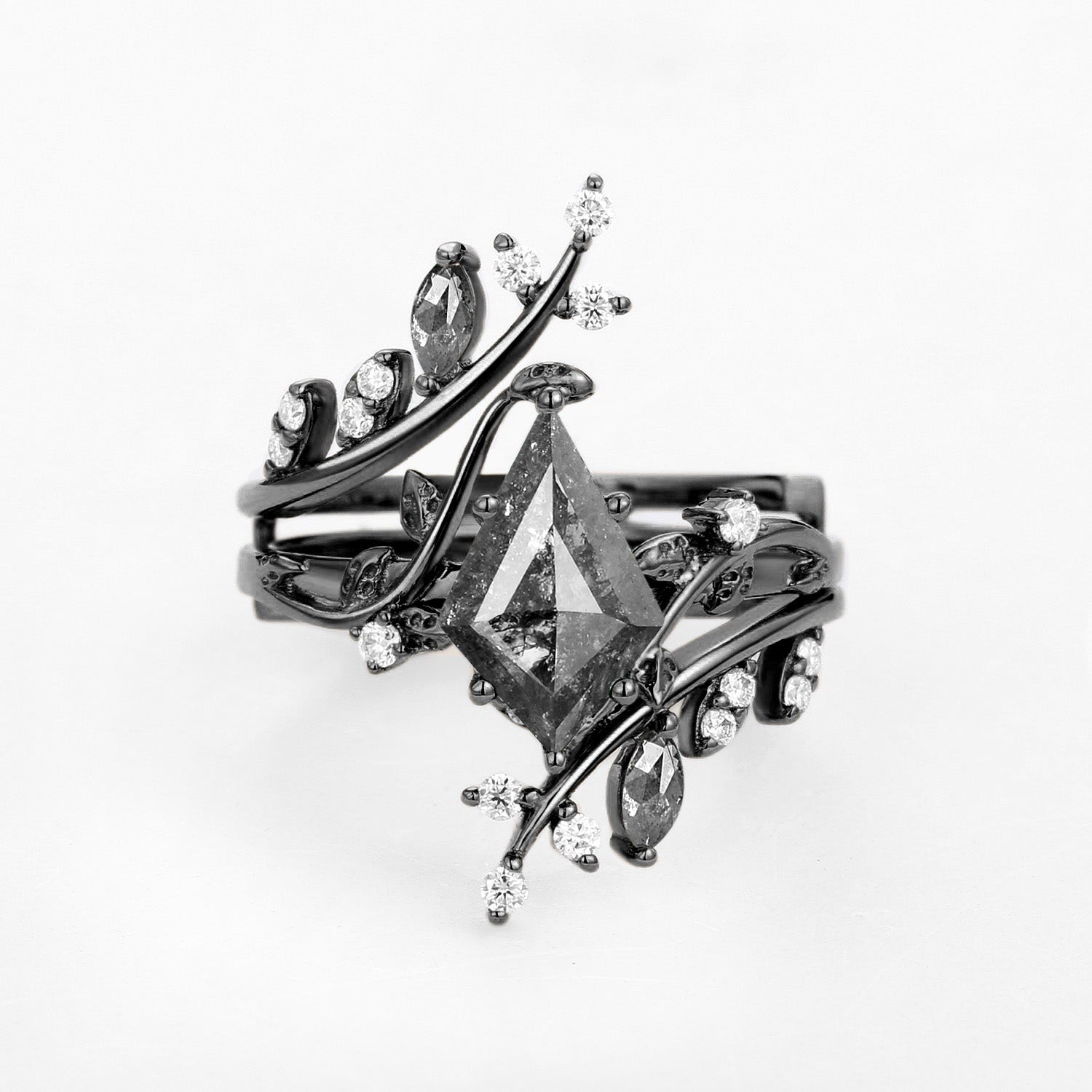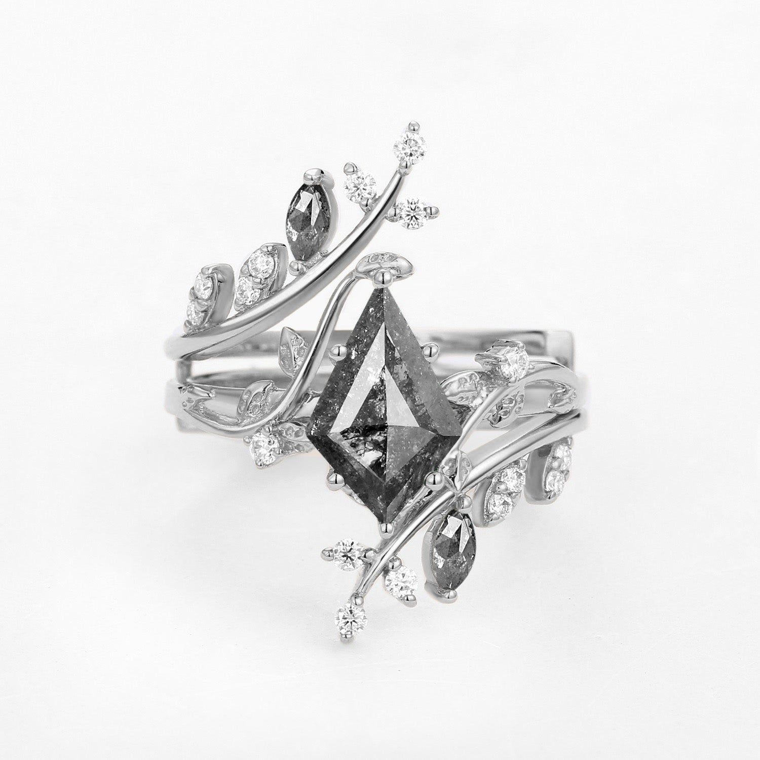 Nature Inspired - Unique Kite Salt and Pepper Diamonds Cage Leafy Ring 2pcs - Knight