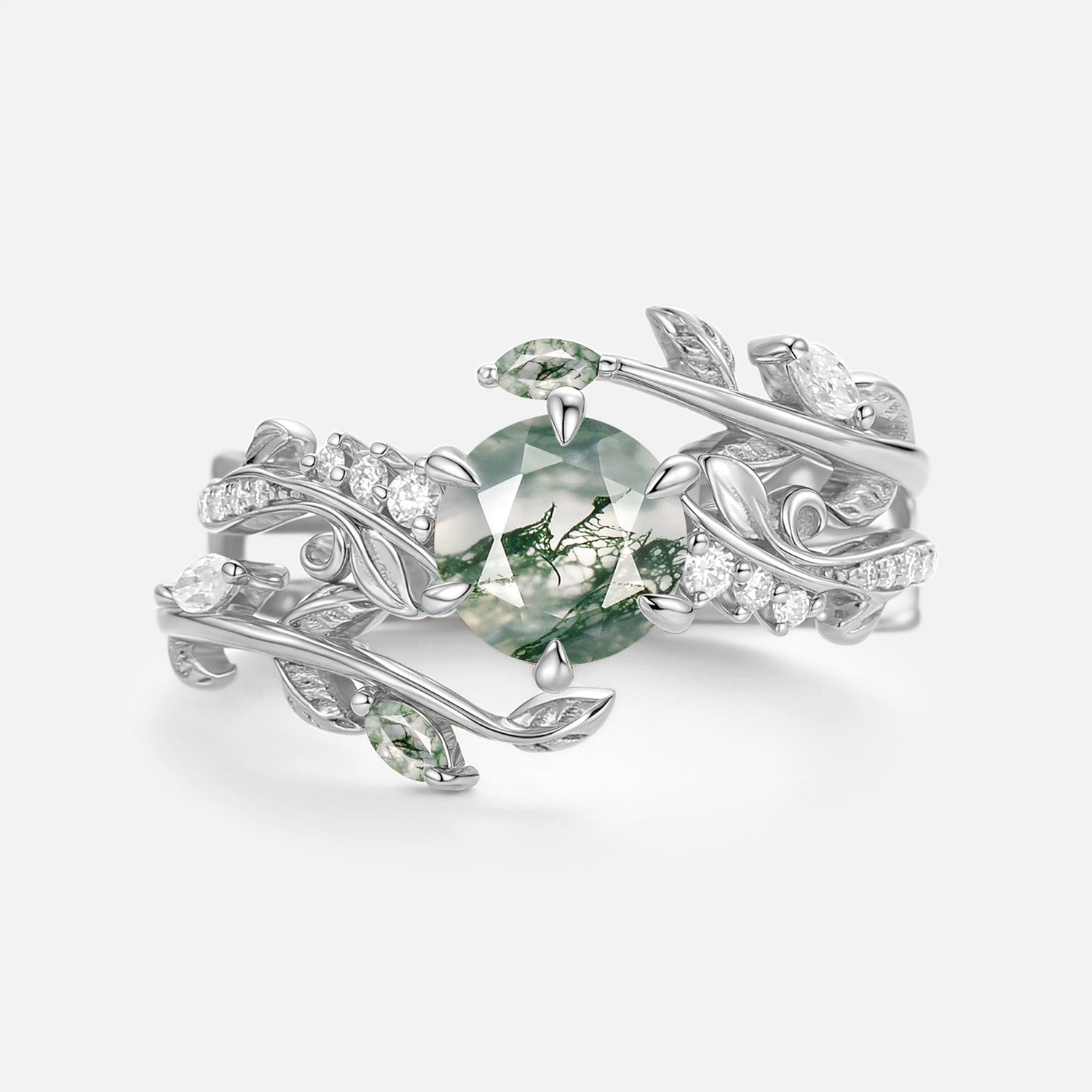 Round Cut Vine Moss Agate Engagement Ring Sets 2pcs - Twine
