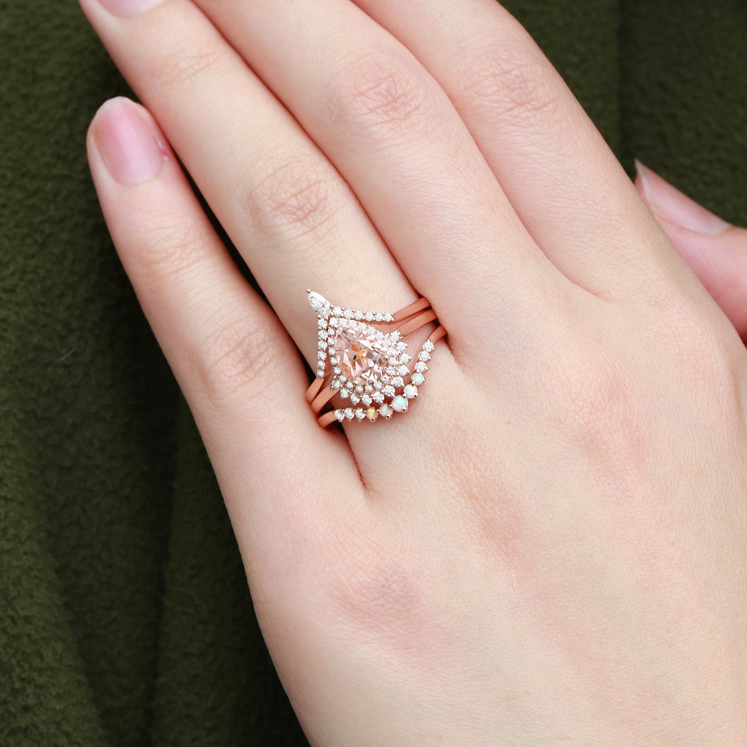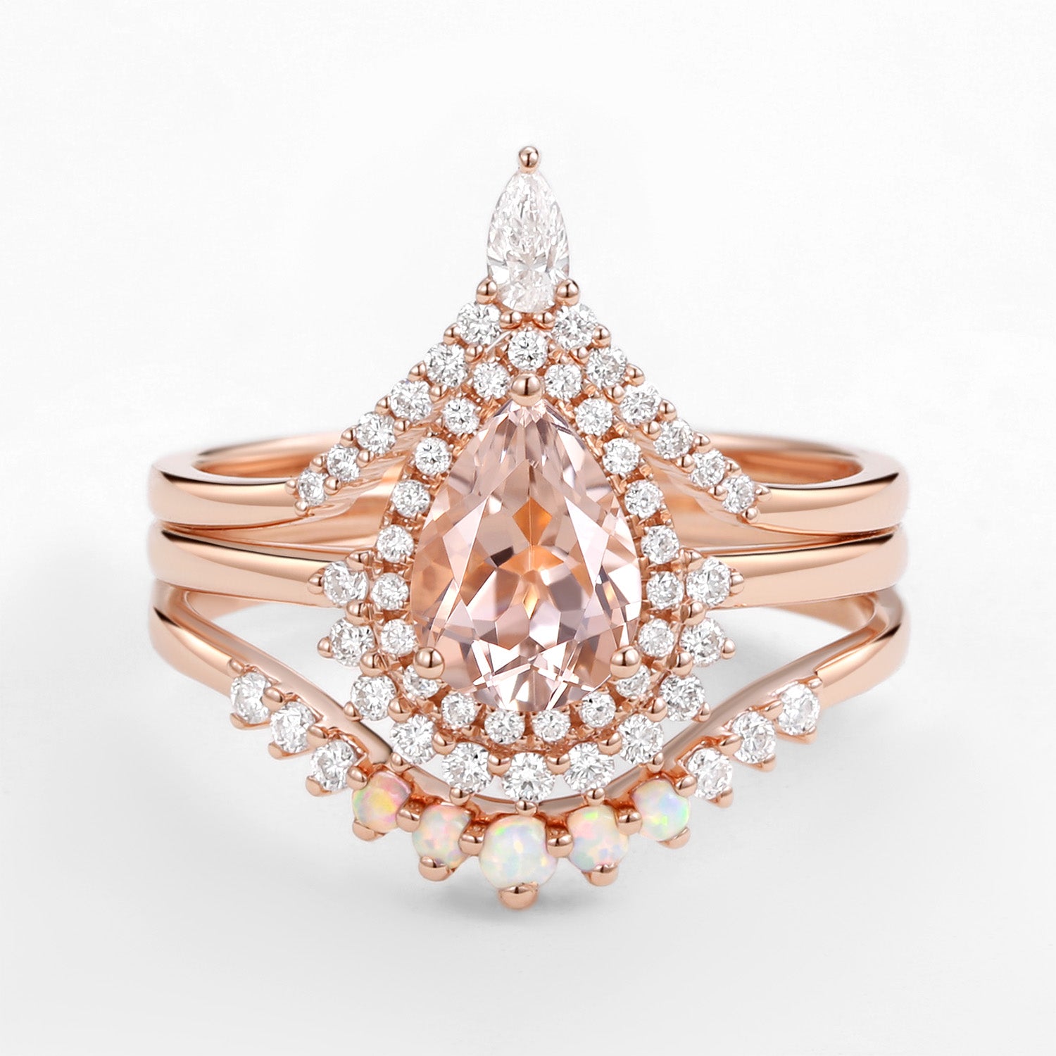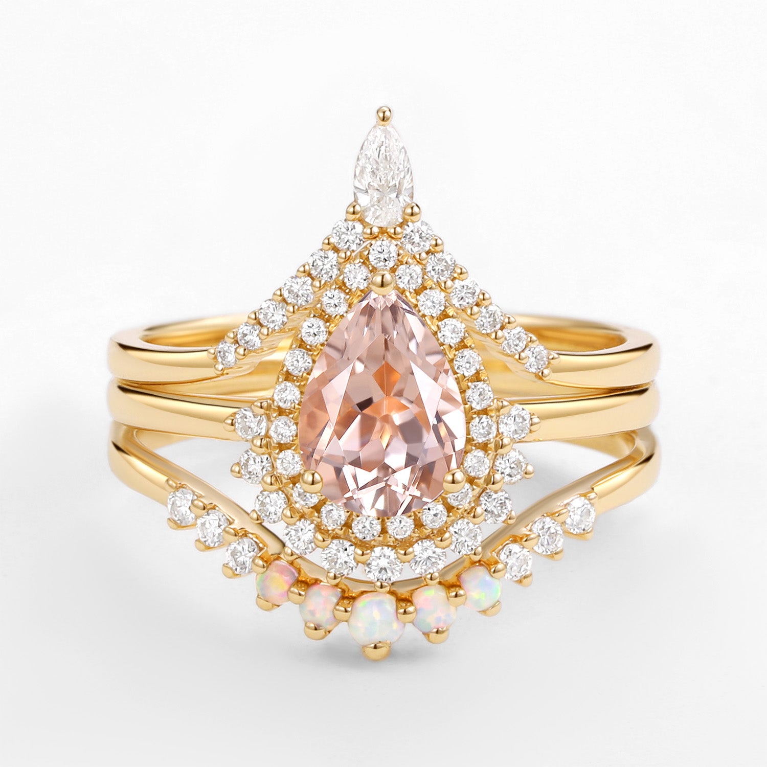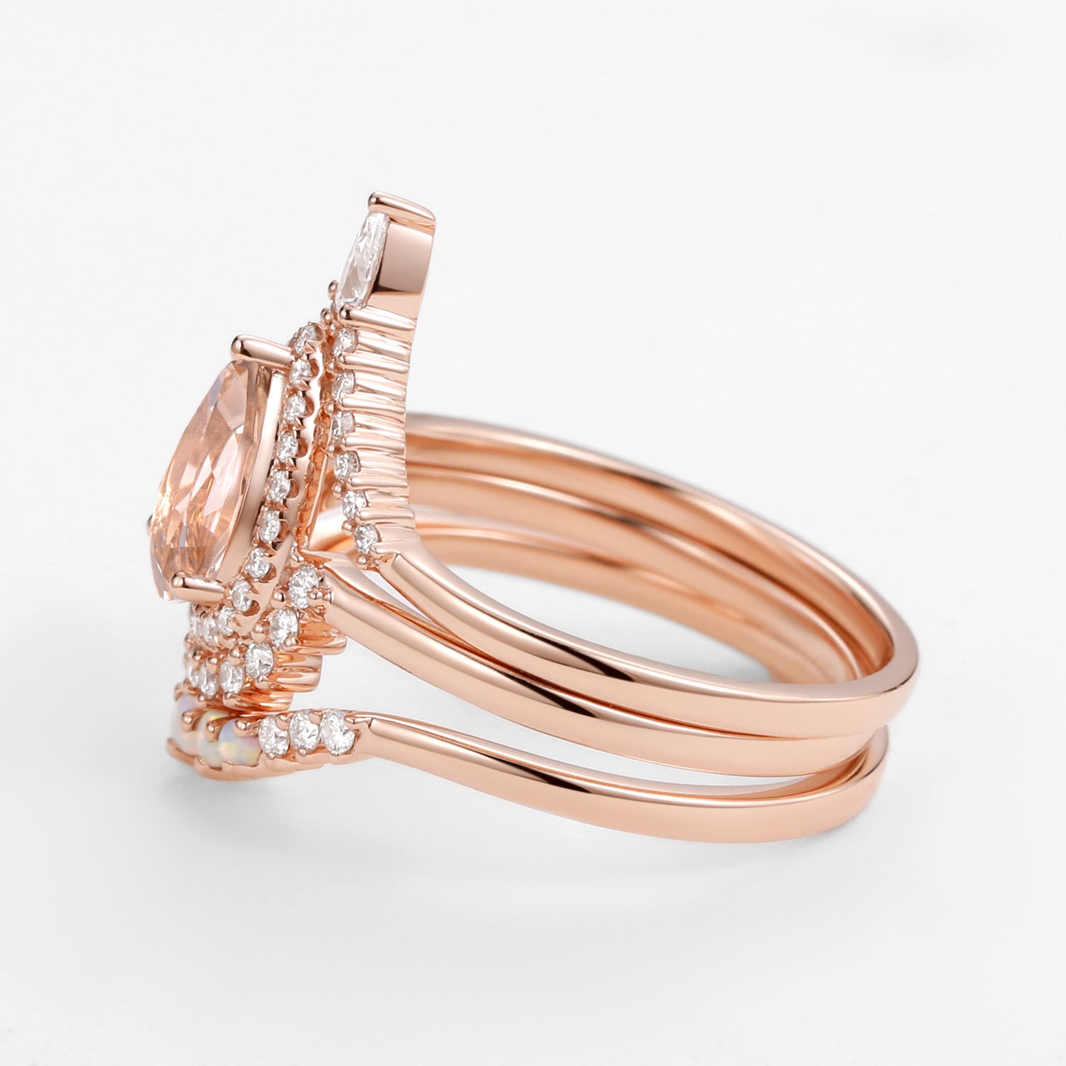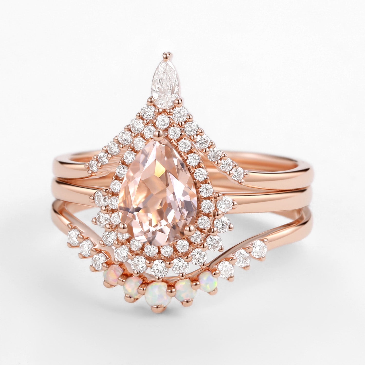 1.5ct Peachy Morganite & Natural Opal Halo Ring Set 3pcs