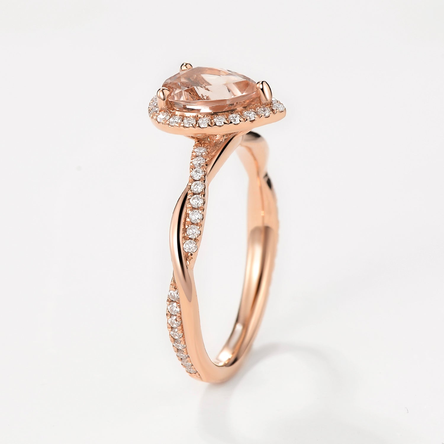 Felicegals Pear Shaped Morganite Ring Rose Gold Engagement Ring Peachy Morganite Ring Infinity Moissanite Band Halo Moissanite Ring Anniversary Gift