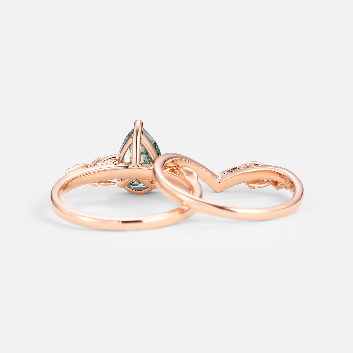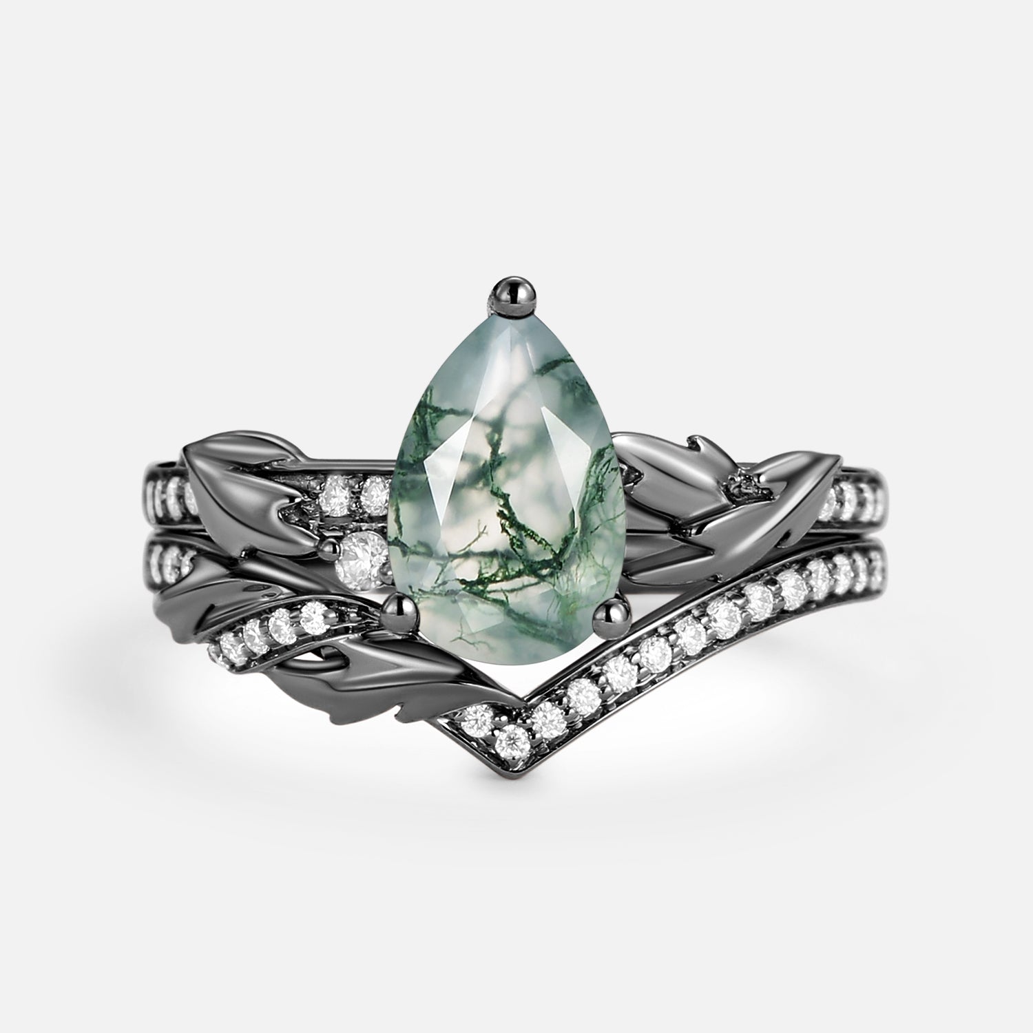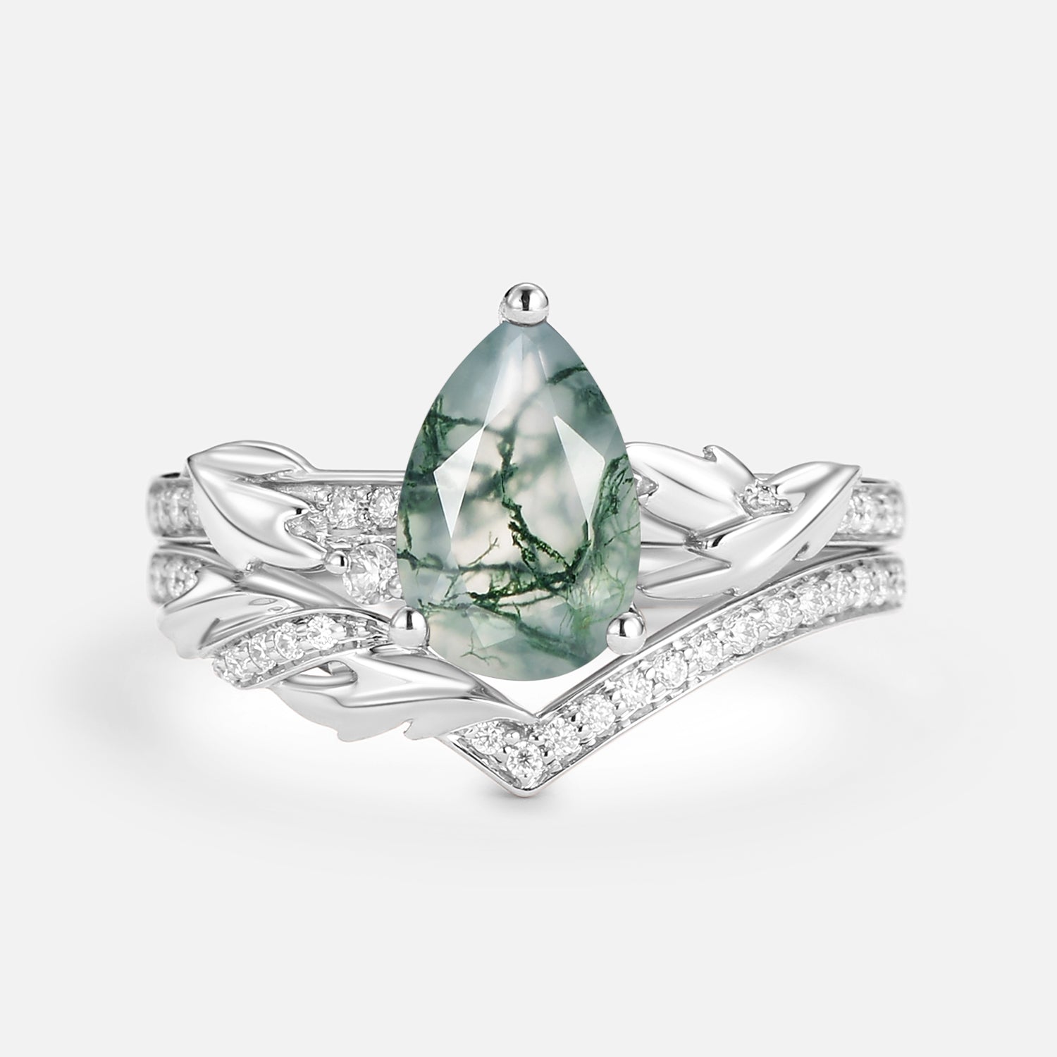 1.5ct Pear Cut Moss Agate Leafy Engagement Ring Set 2pcs