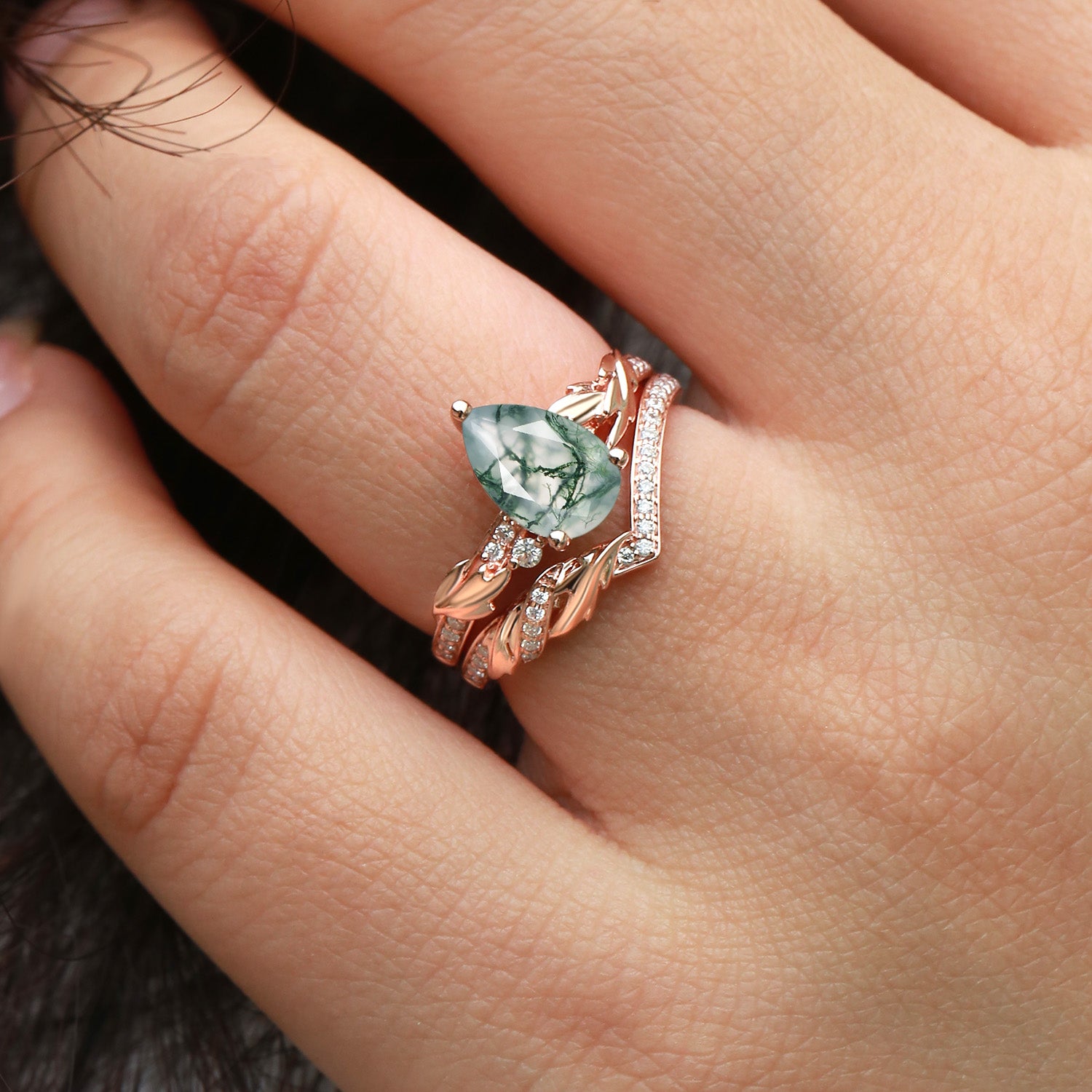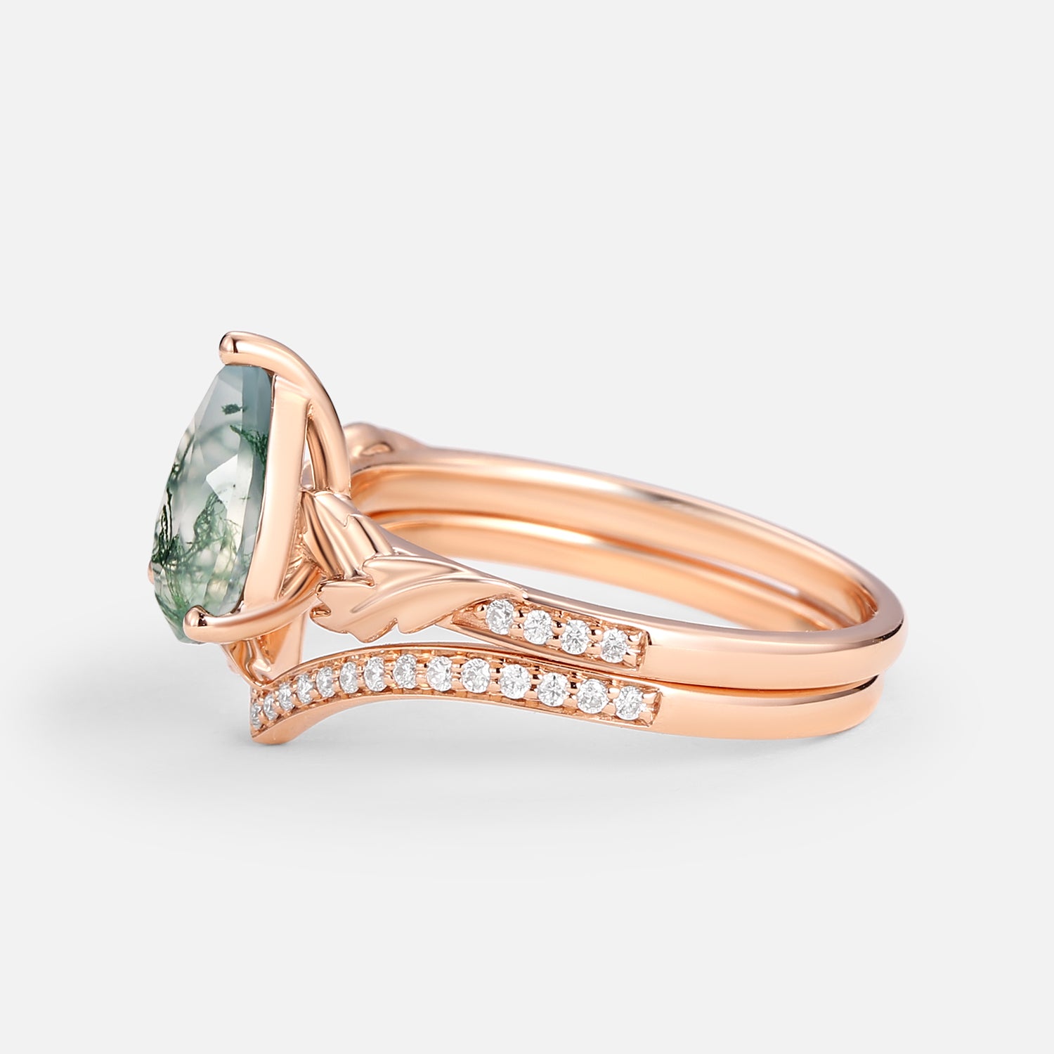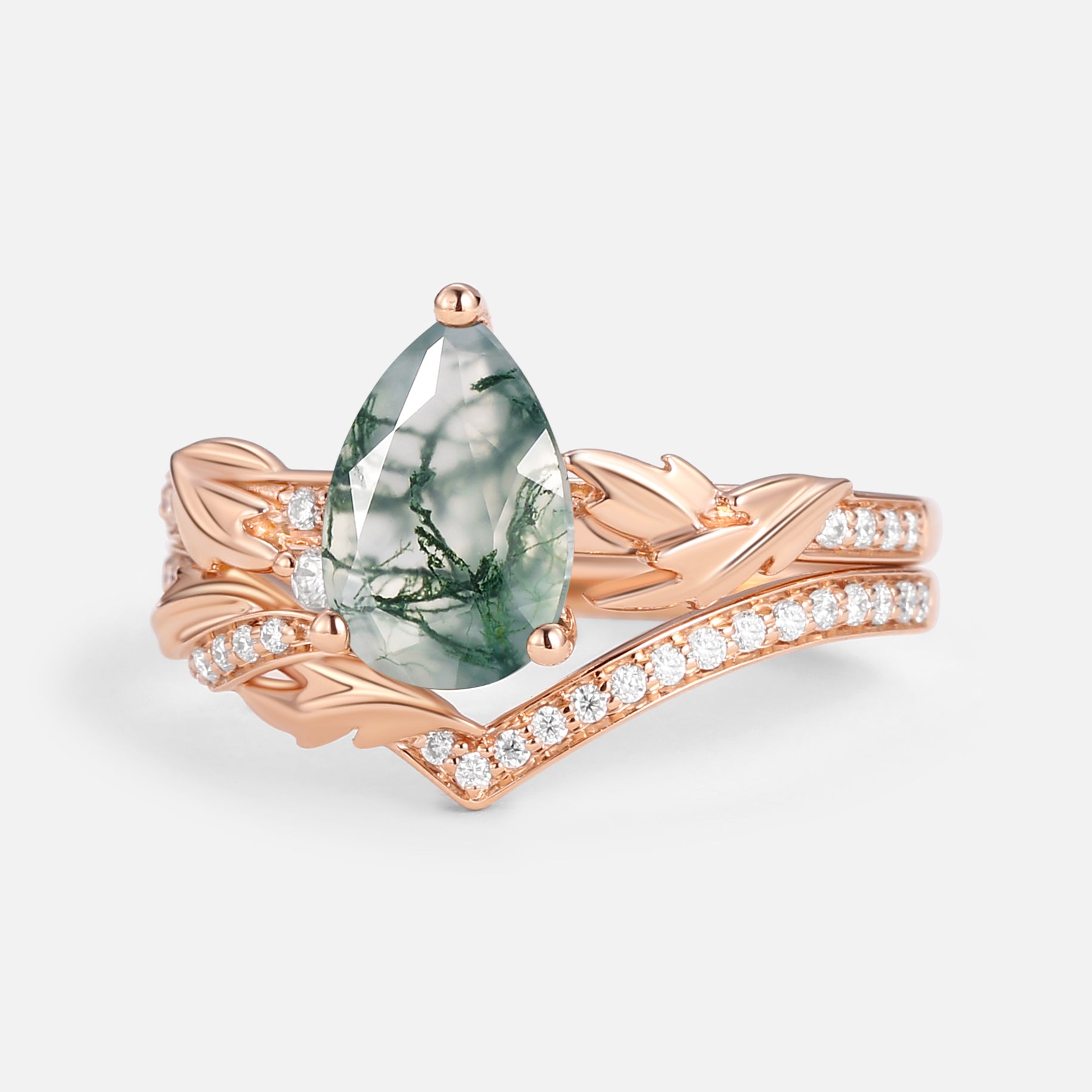 1.5ct Pear Cut Moss Agate Leafy Engagement Ring Set 2pcs