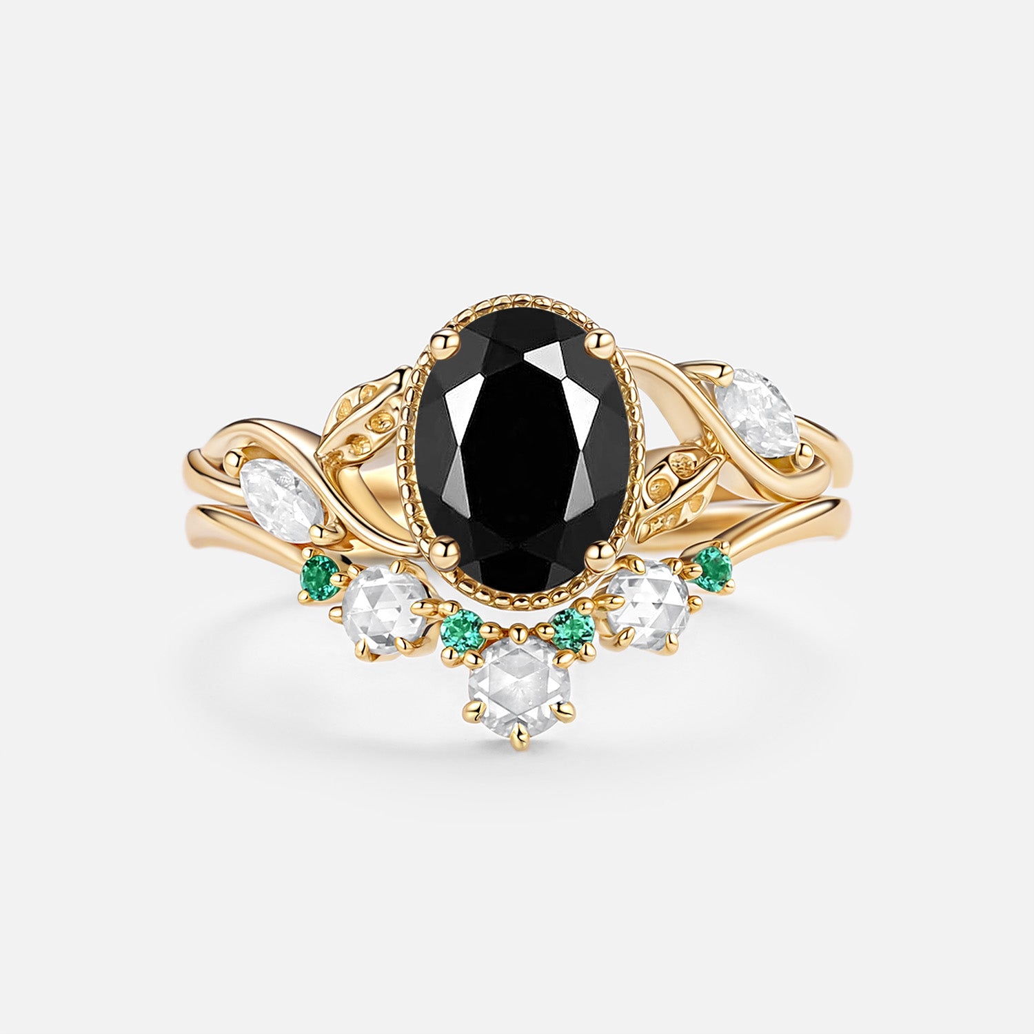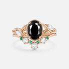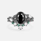 Black Moissanite & Lab Emerald Oval Cut Leaf Ring Set 2pcs - Lora