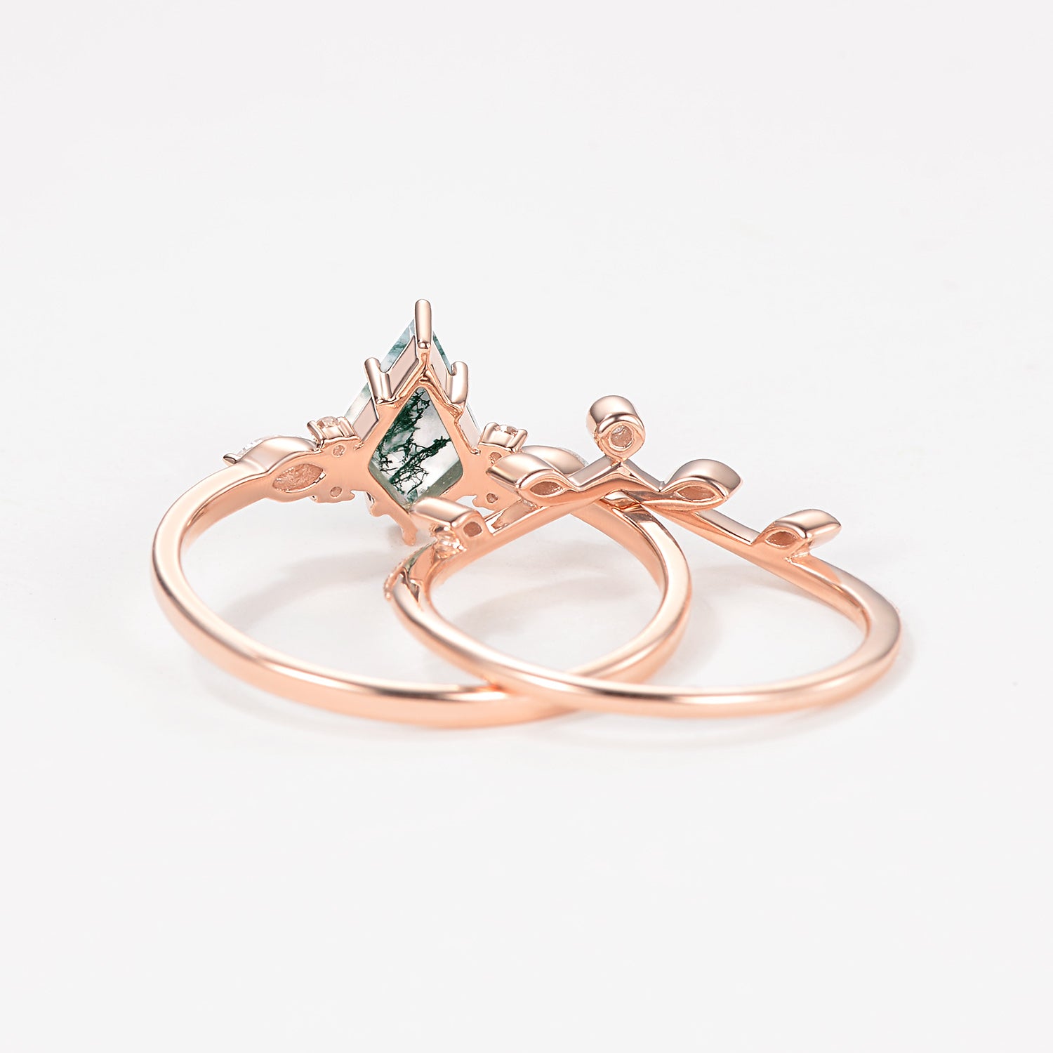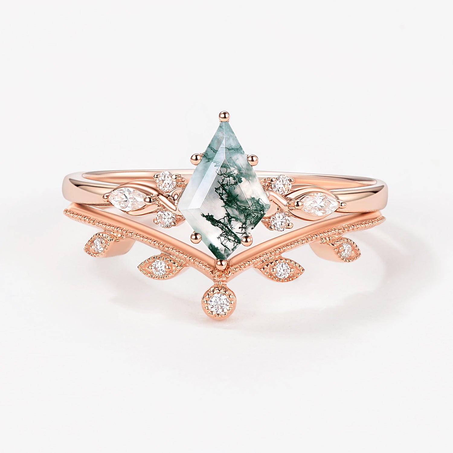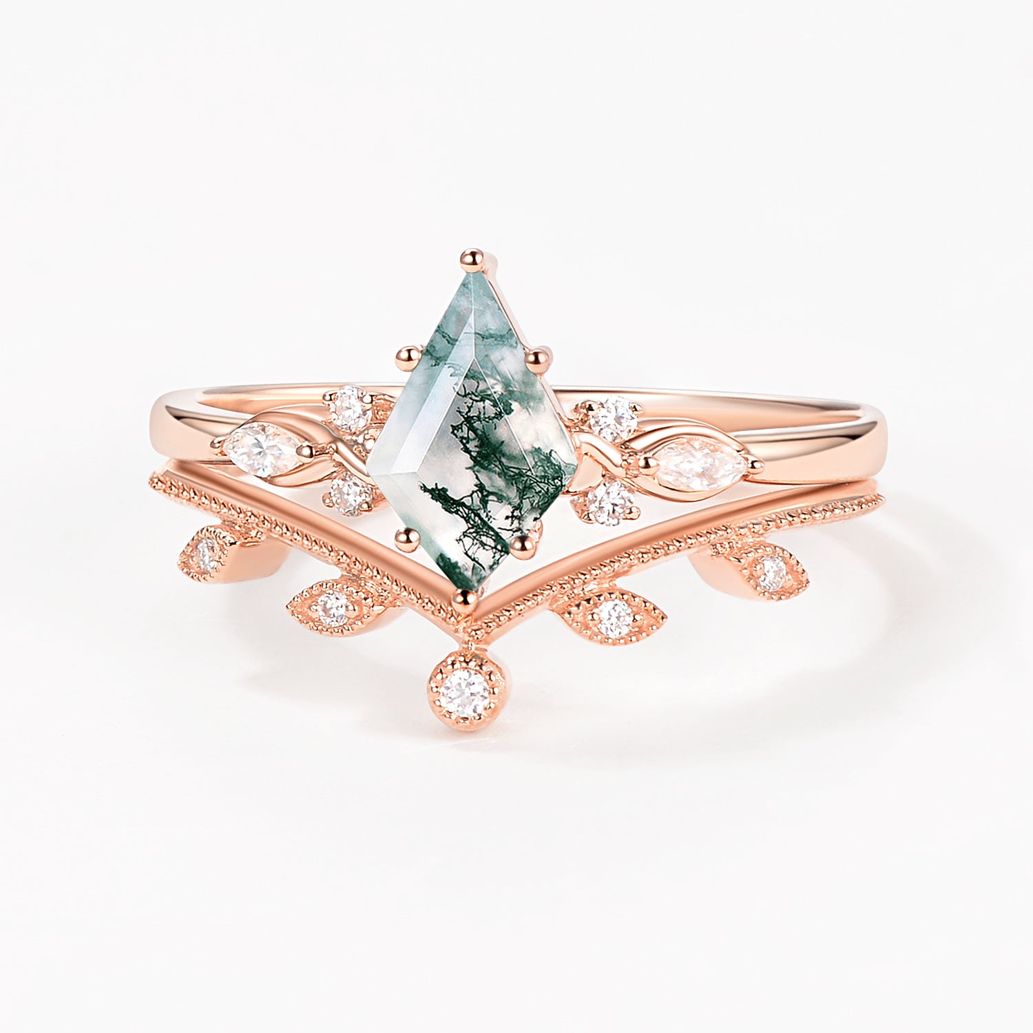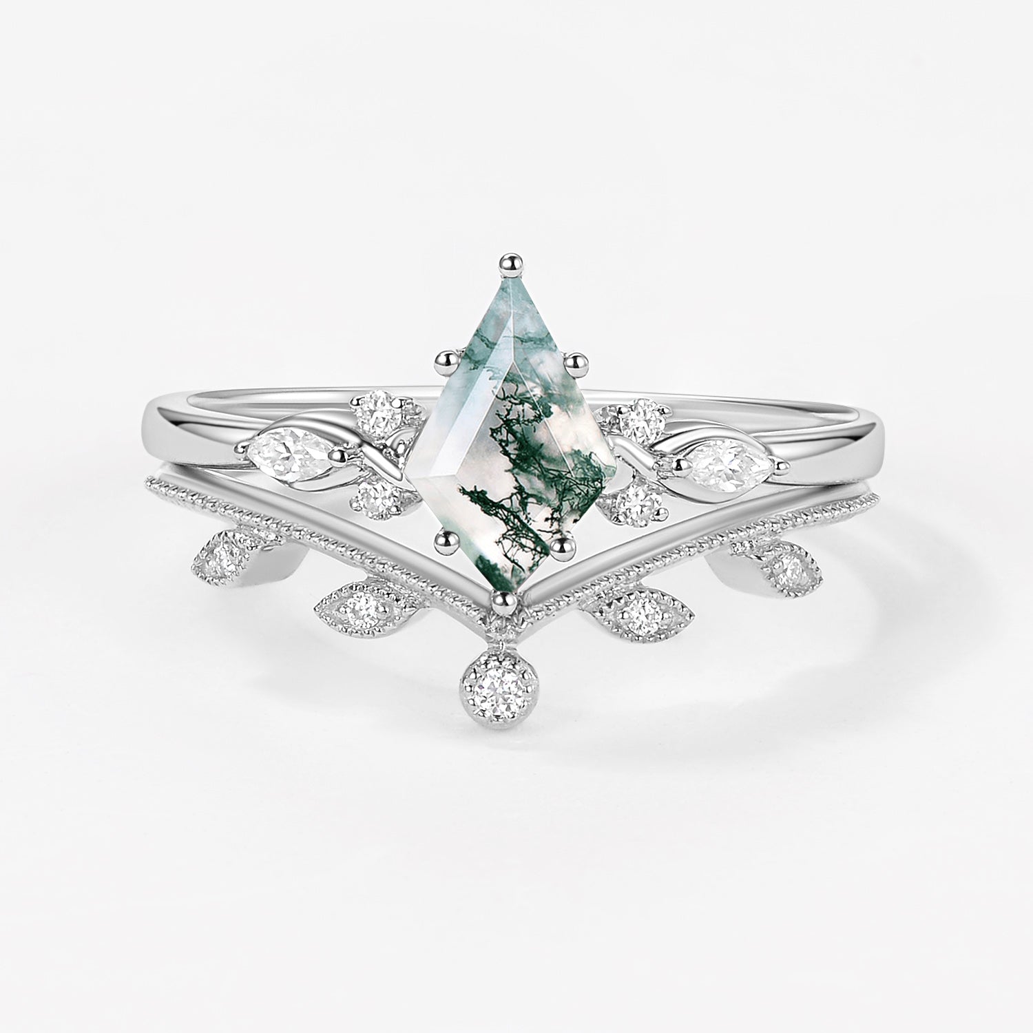 Green Leafy Unique Kite Moss Agate Engagement Ring Sets 2pcs