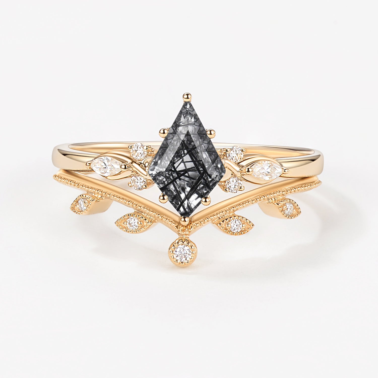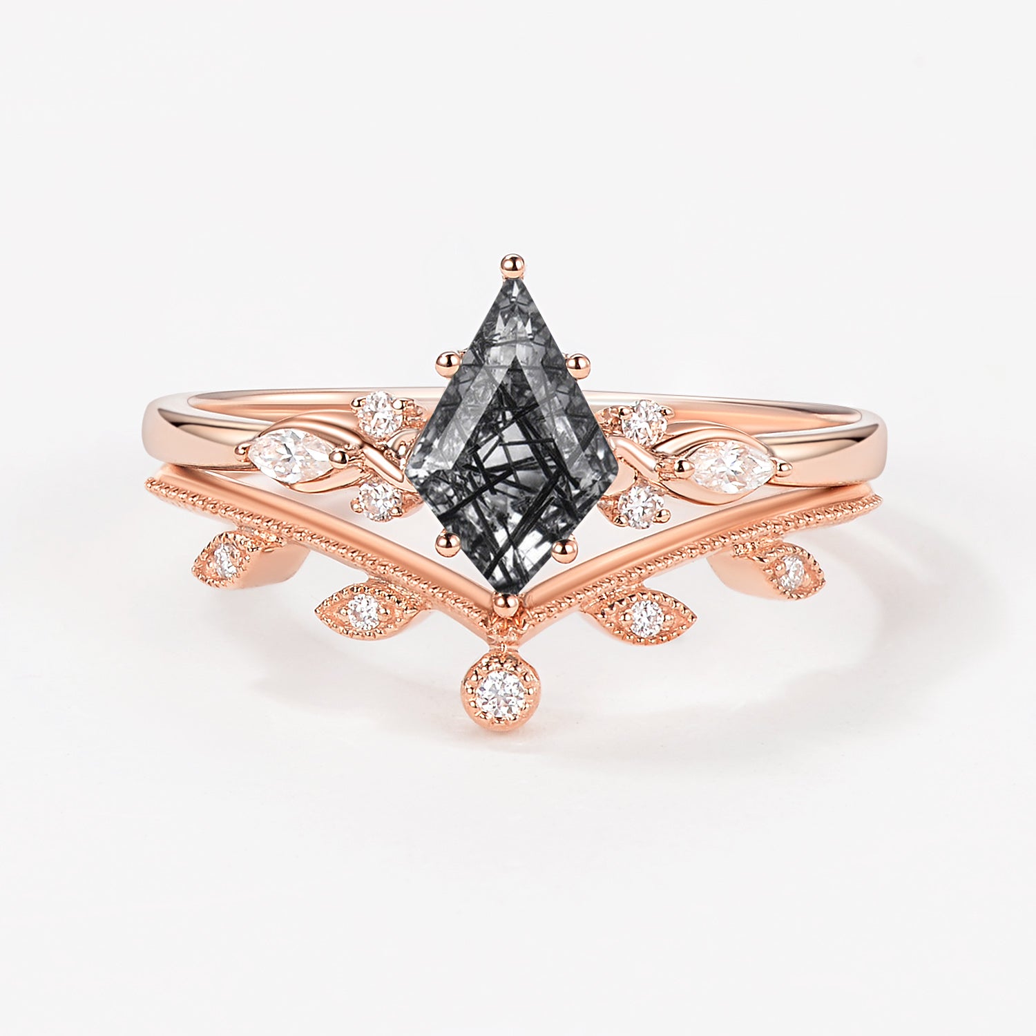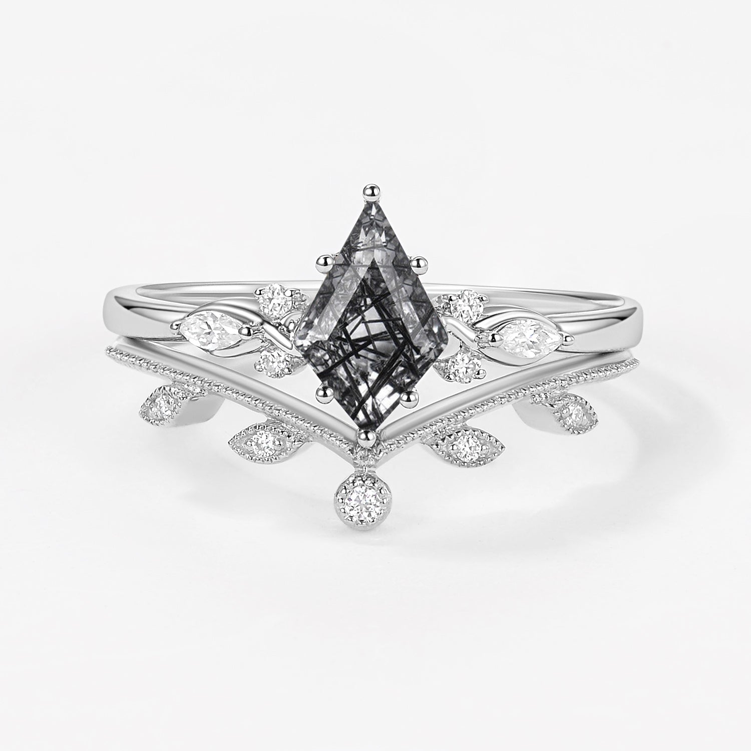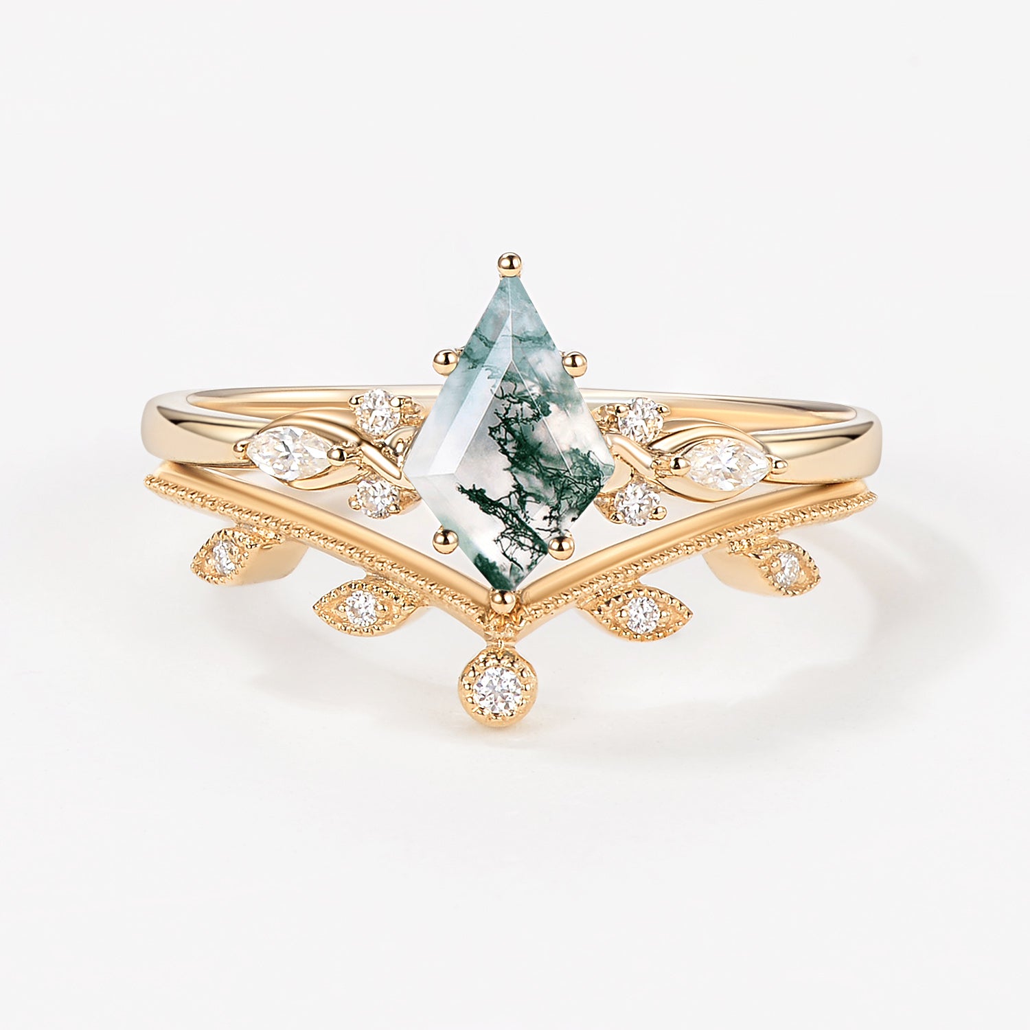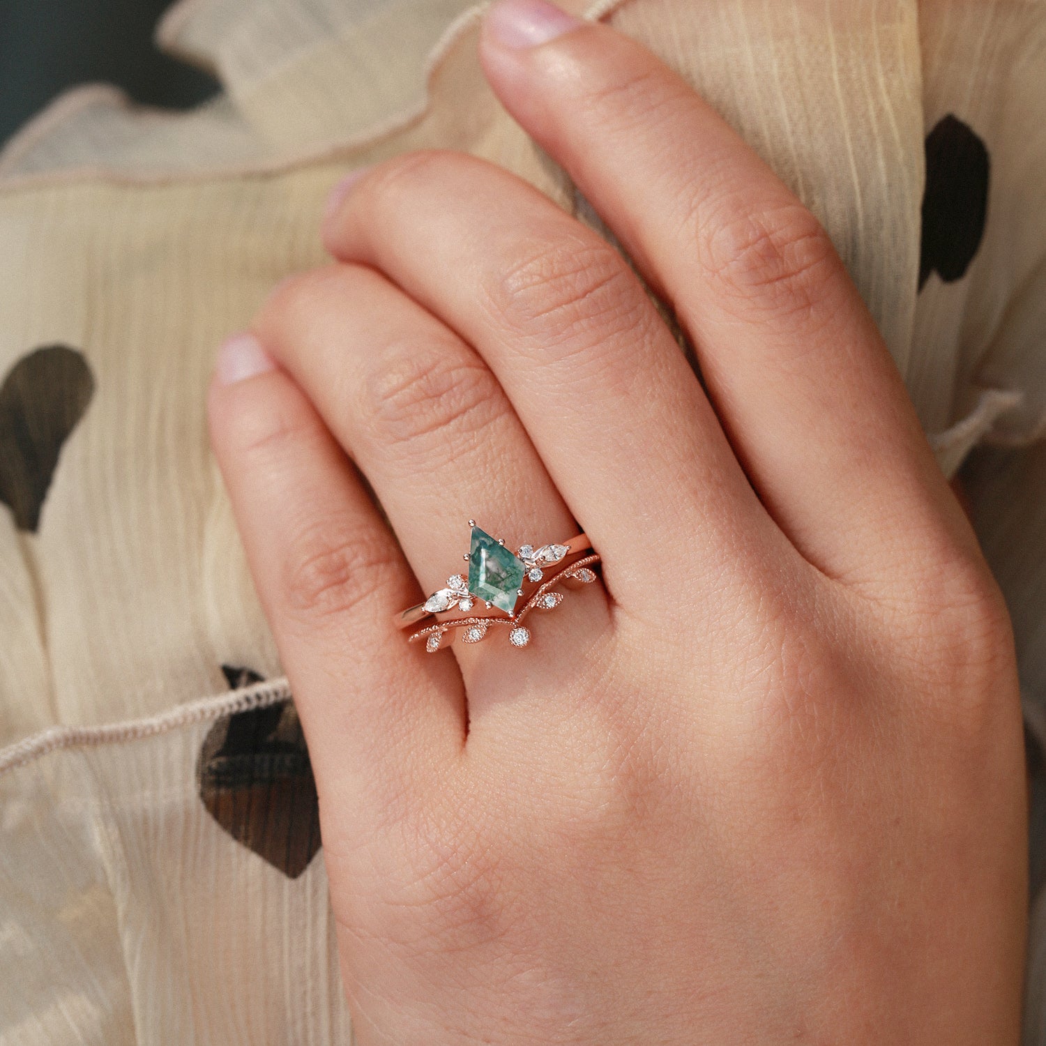 Green Leafy Unique Kite Moss Agate Engagement Ring Sets 2pcs