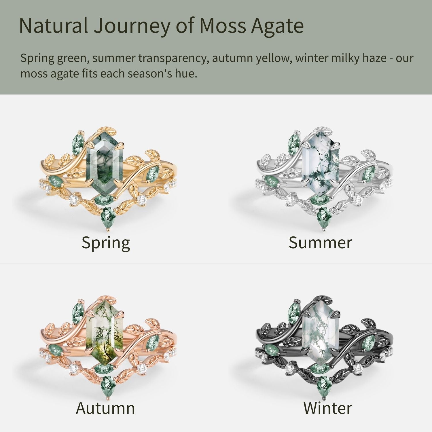 Green Moss Agate Long Hexagon Vine Engagement Ring Set 2pcs - Daphne