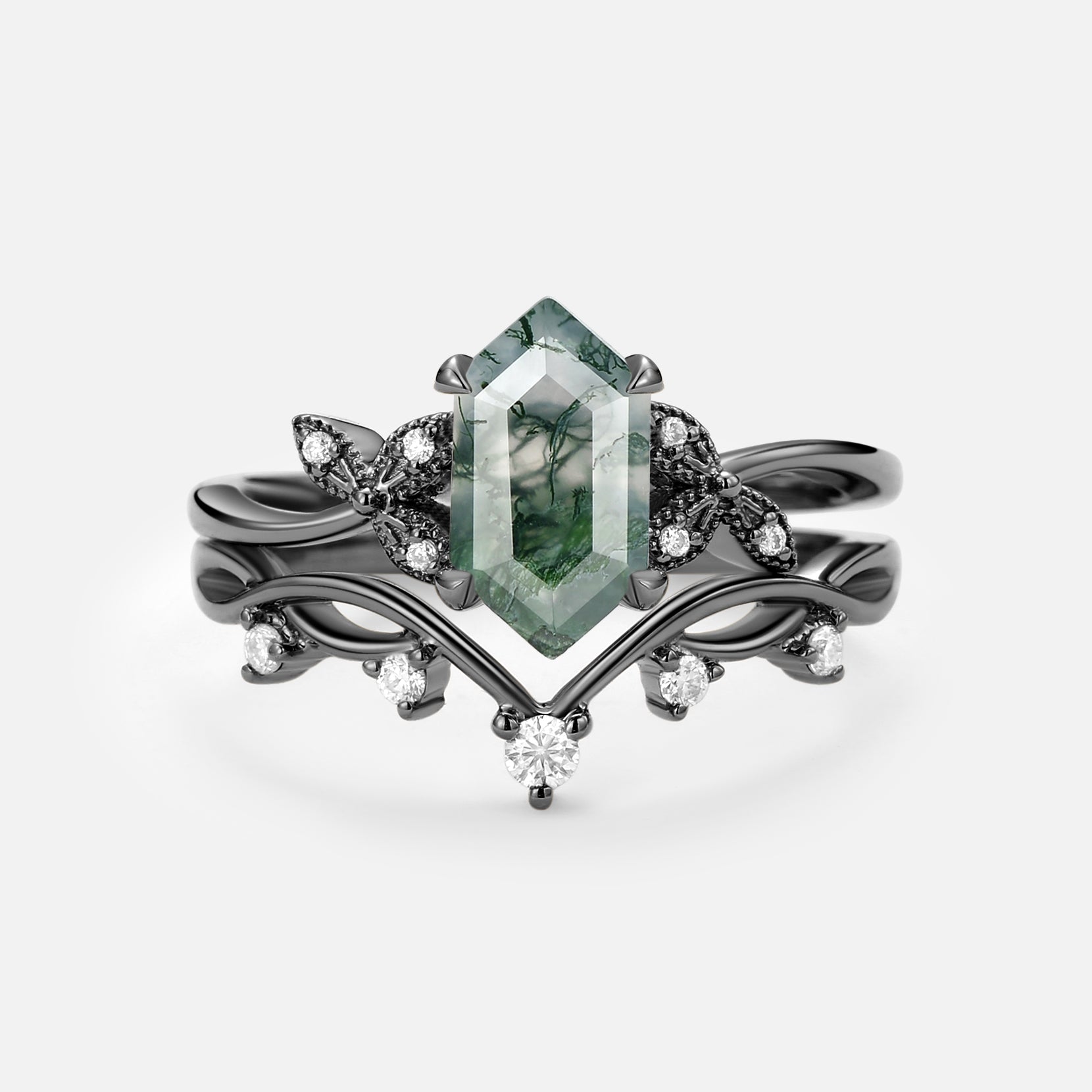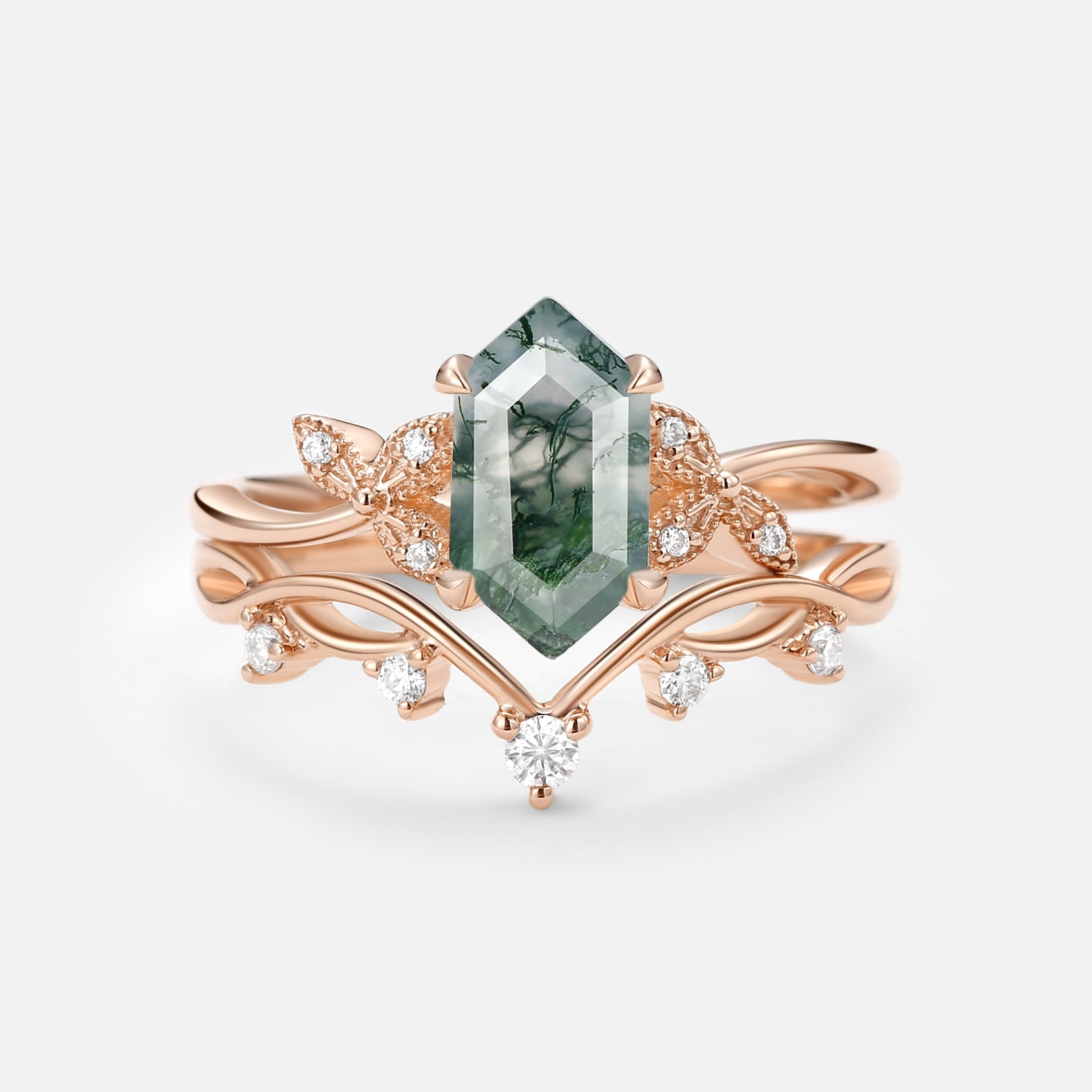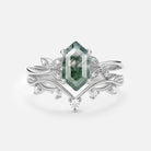 Elongated Hexagon Engagement Ring Moss Agate Leafy Ring Sets 2pcs - Lucy