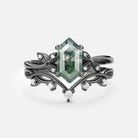 Hexagon Cut Unique Moss Agate Engagement Ring Set 2pcs - Lucy