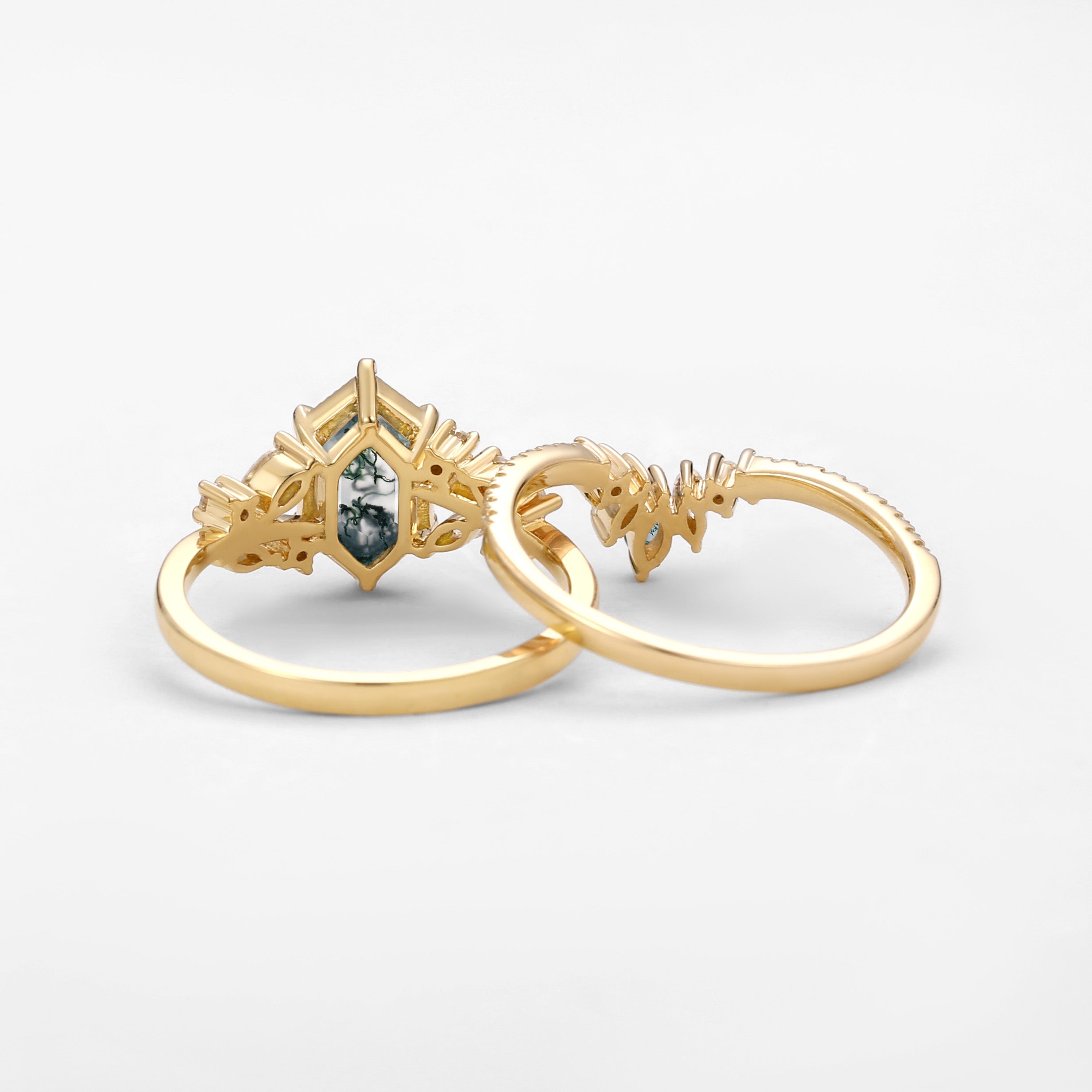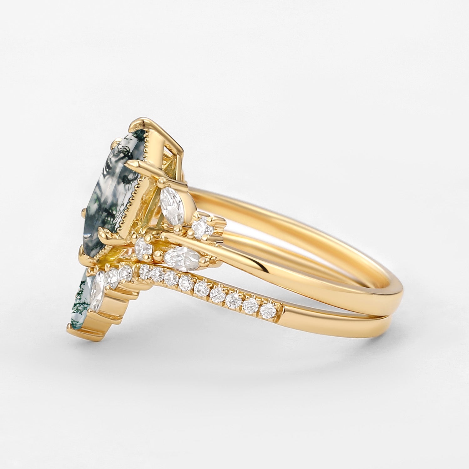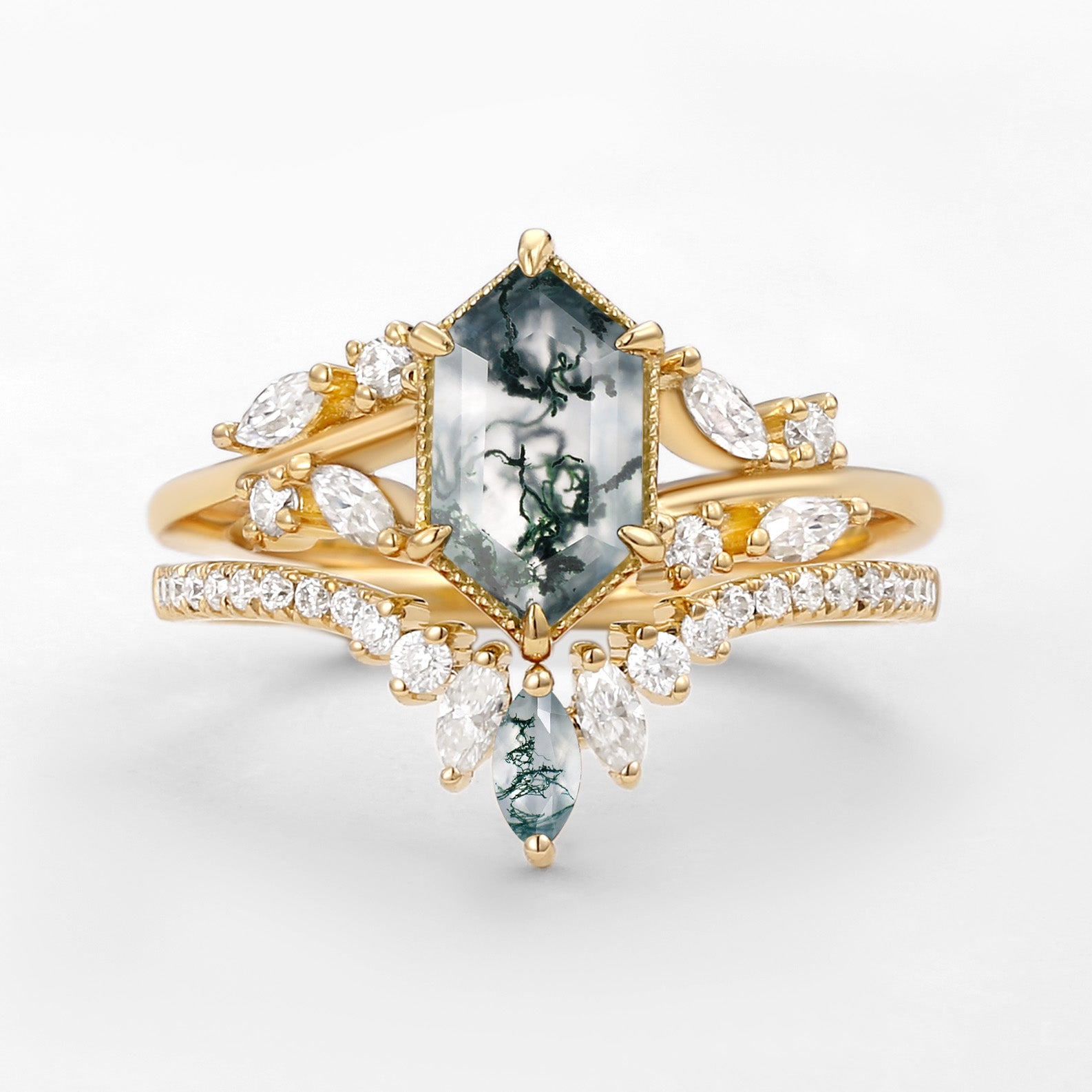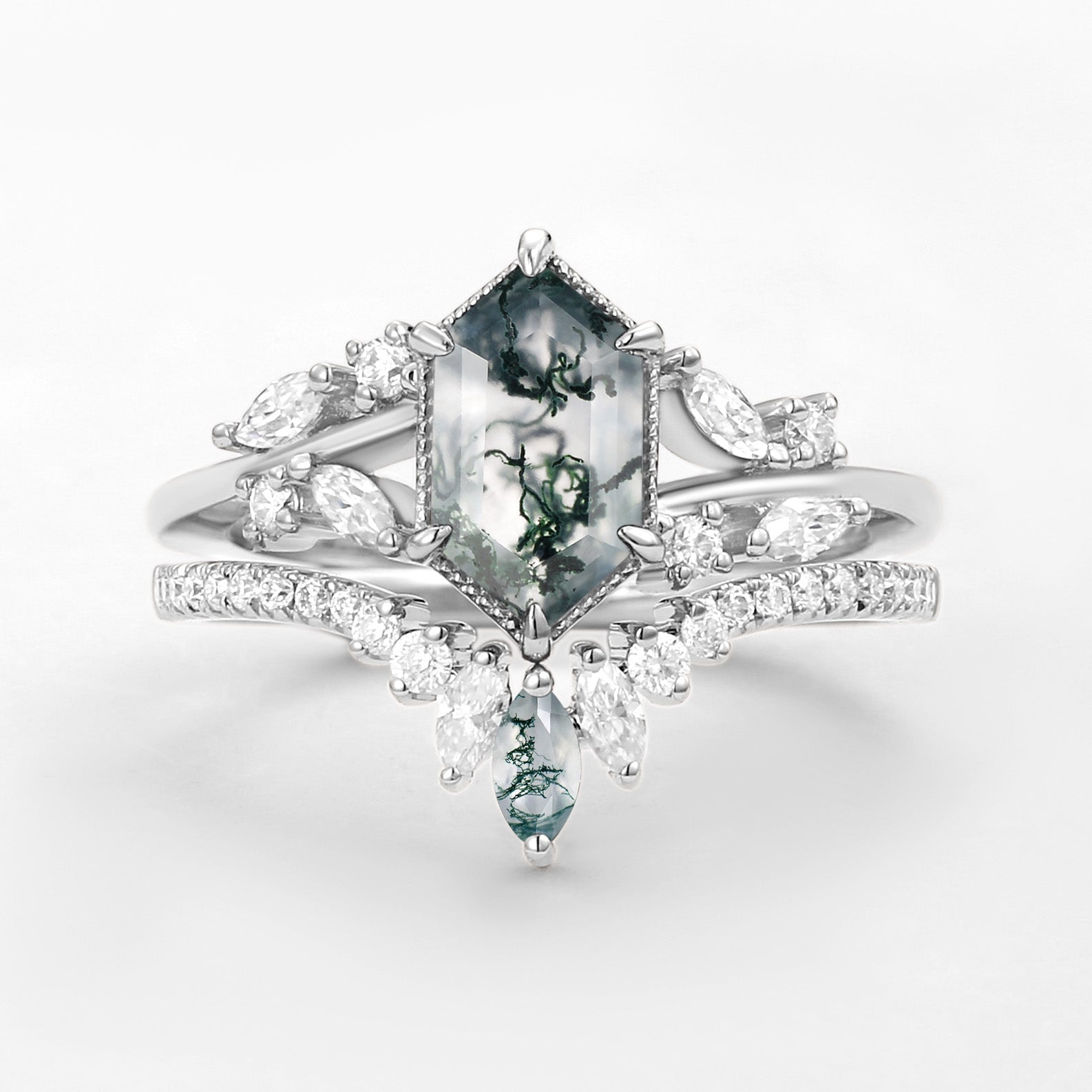Hexagon Green Moss Agate Leafy Engagement Ring 2PCS - Pine