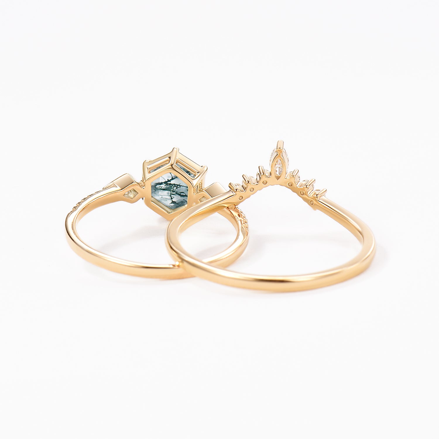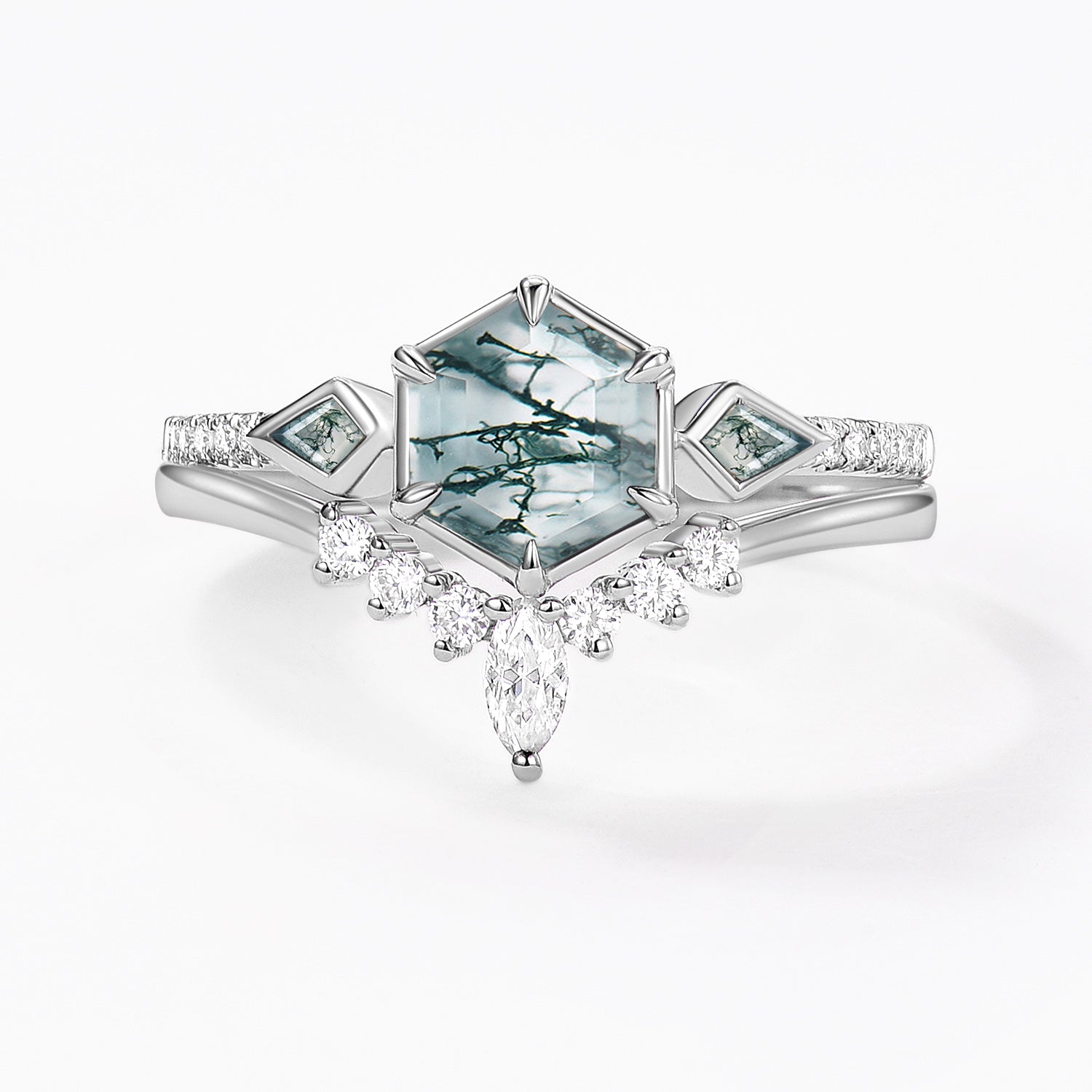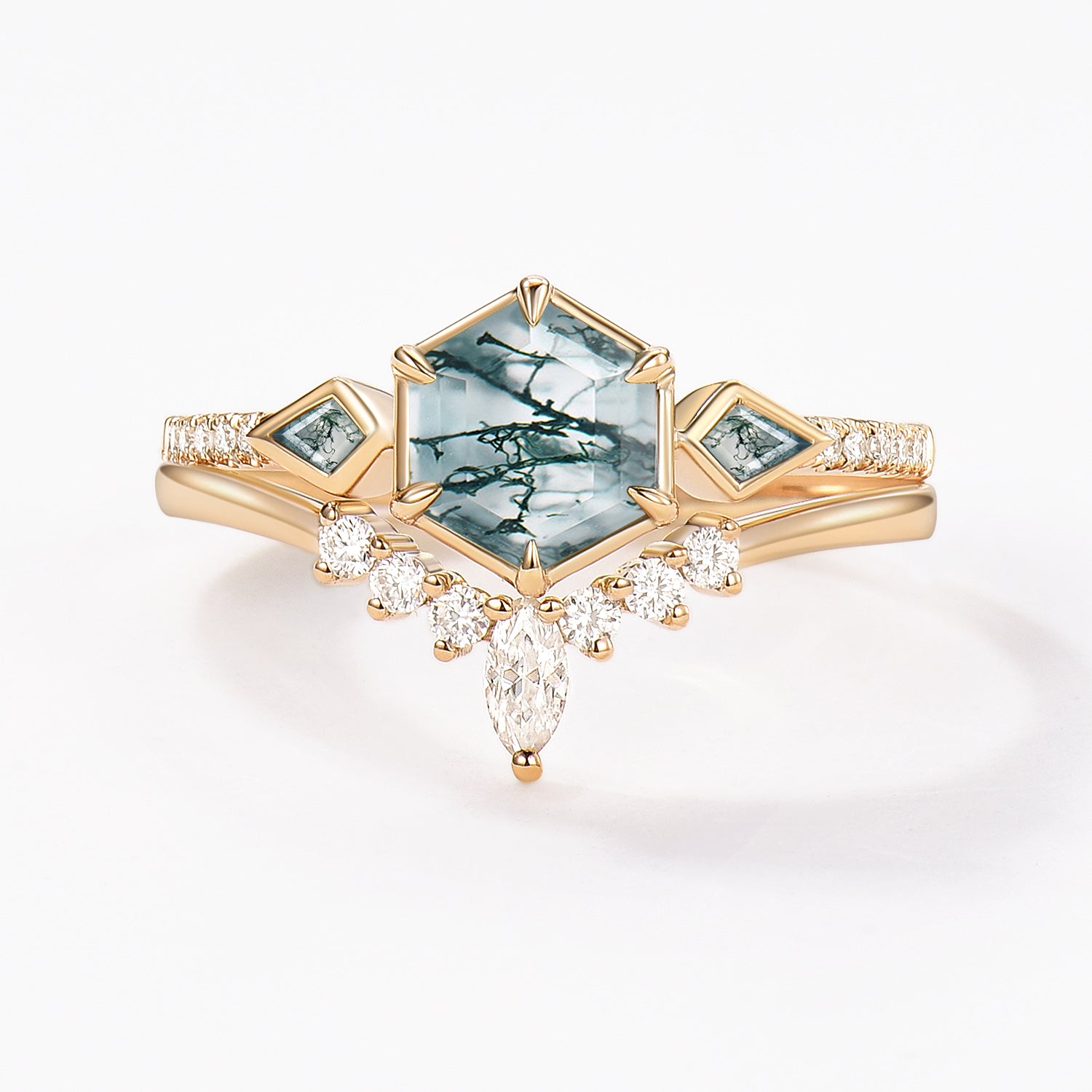 Hexagon Moss Agate Geometric Three Stone Cluster Engagement Ring Set 2pcs