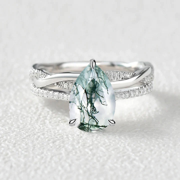 Infinity Pear Moss Agate Straight Ring Set 2pcs