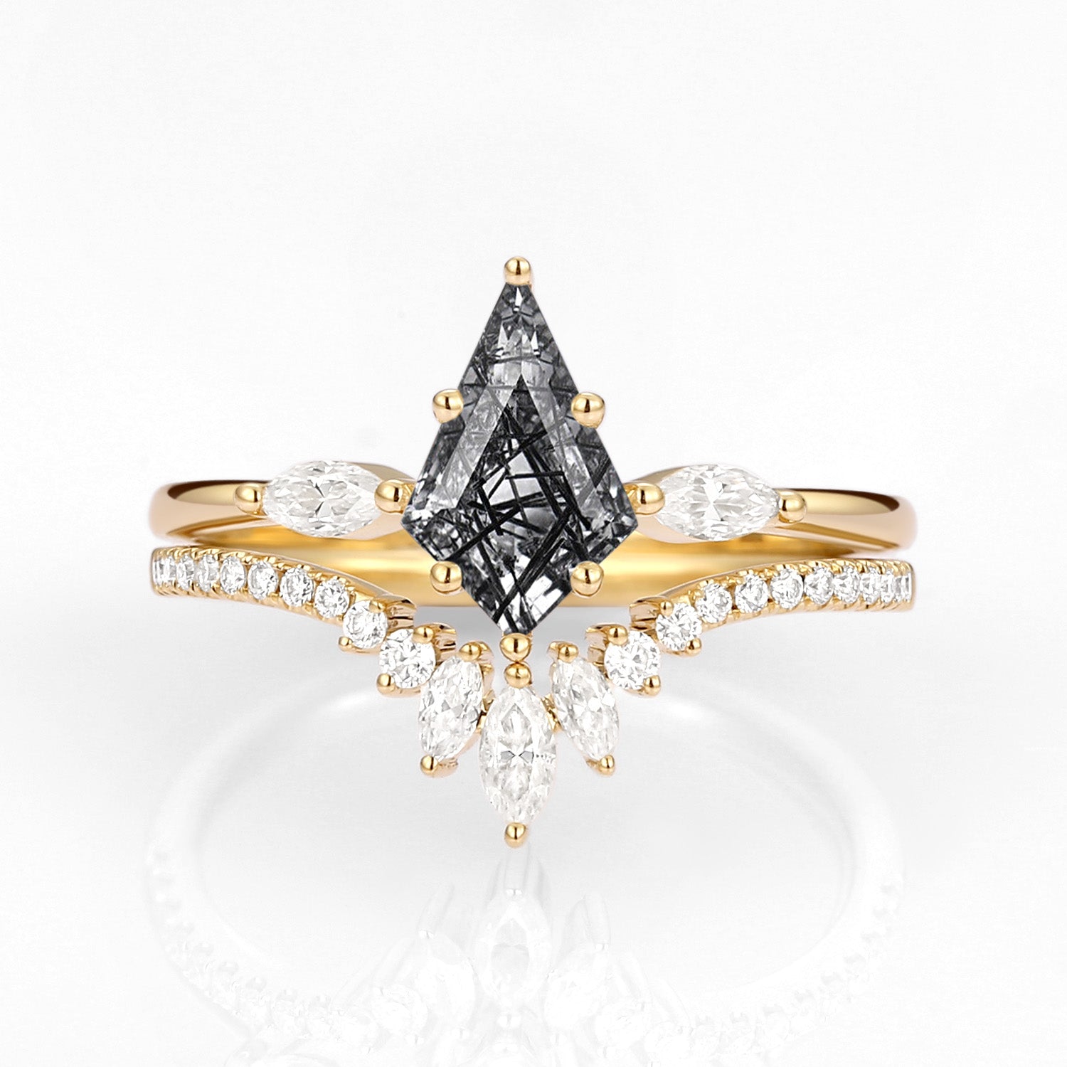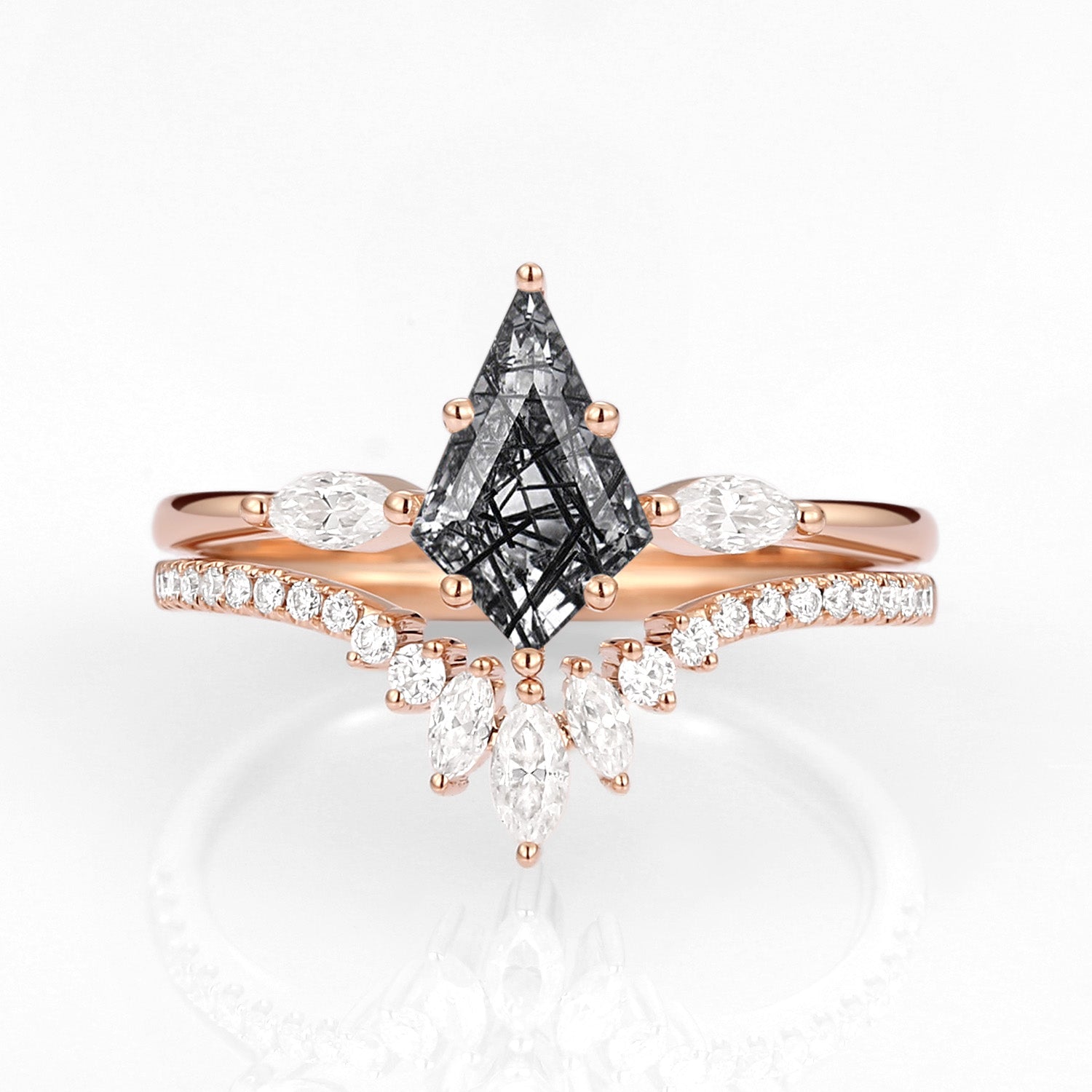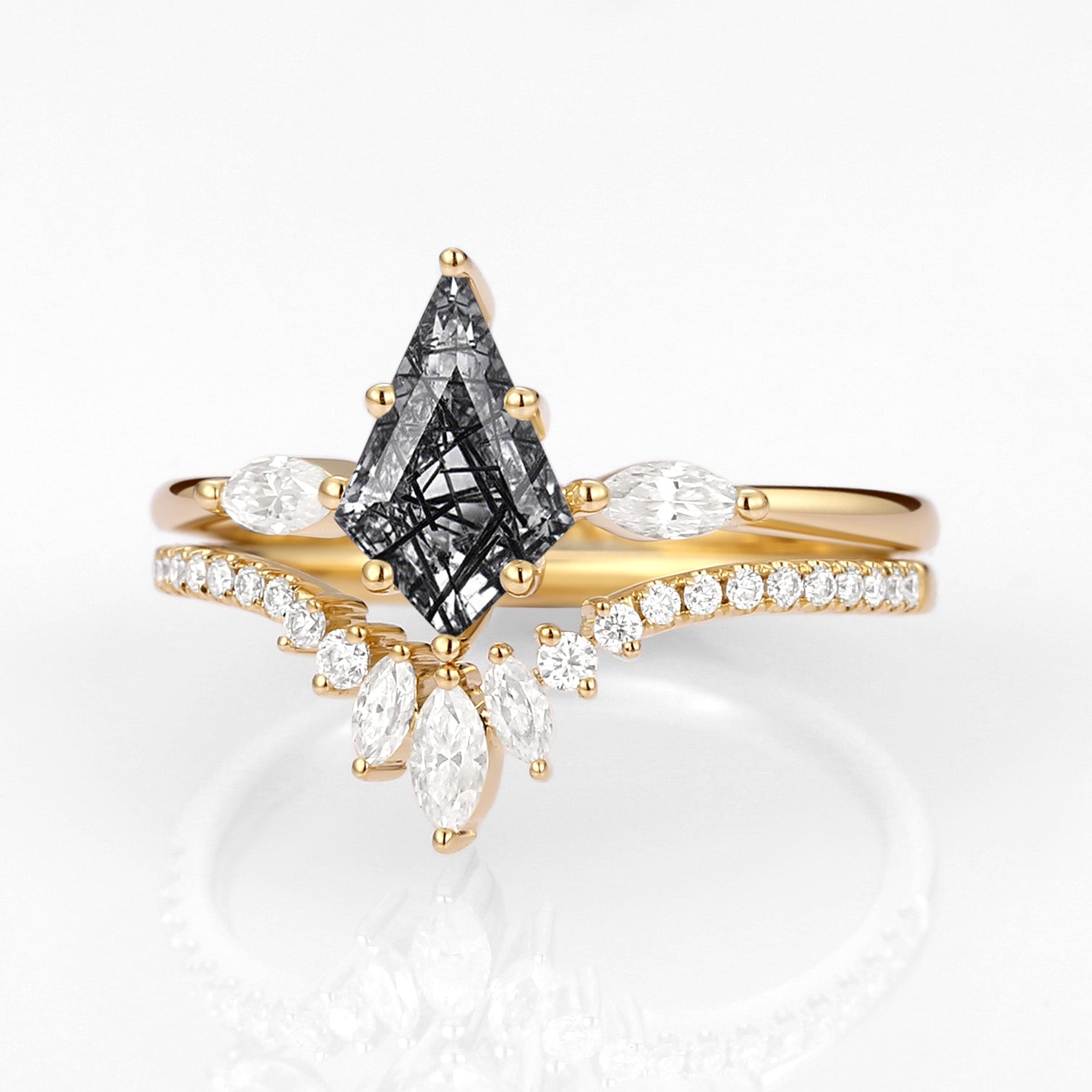 Kite Black Rutilated Quartz Engagement Ring Set 2pcs