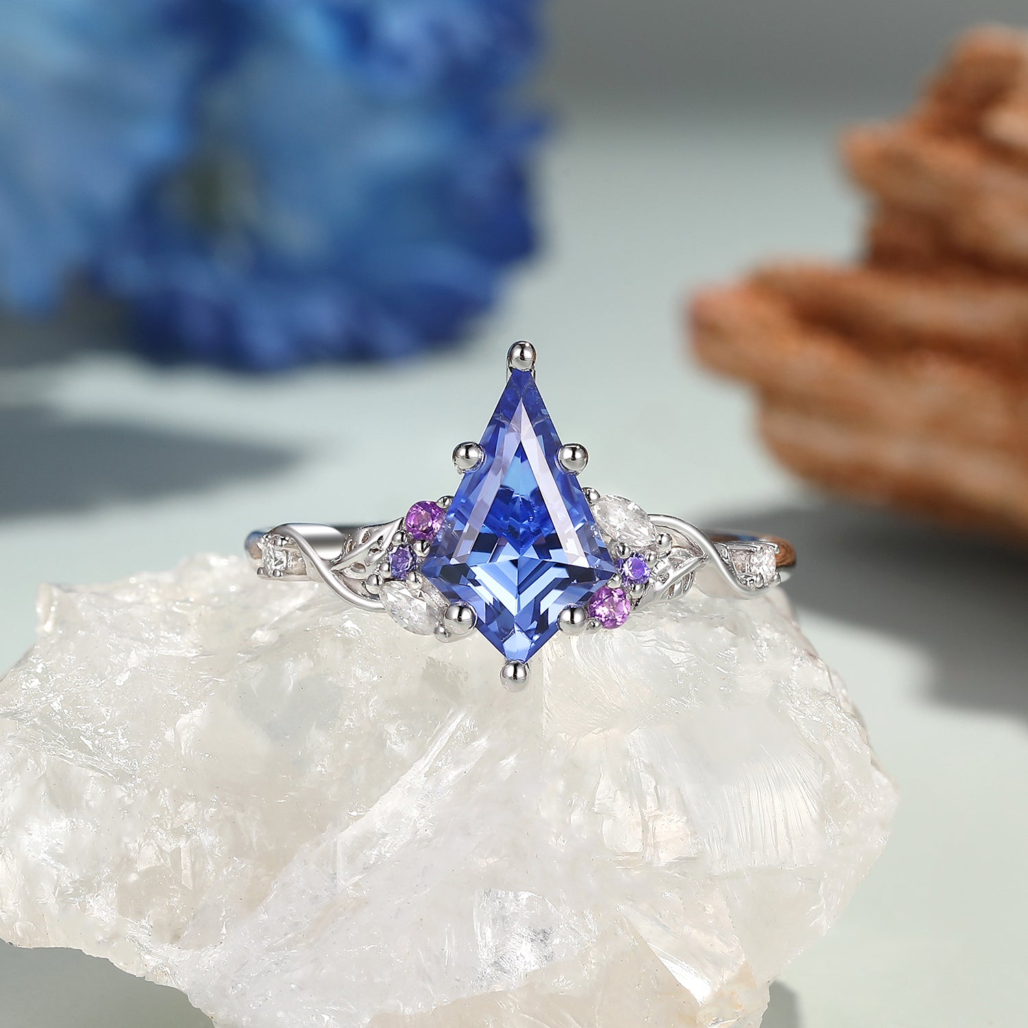 Kite Cut Lab Cornflower Sapphire Leafy Engagement Ring - Elowen