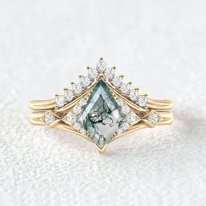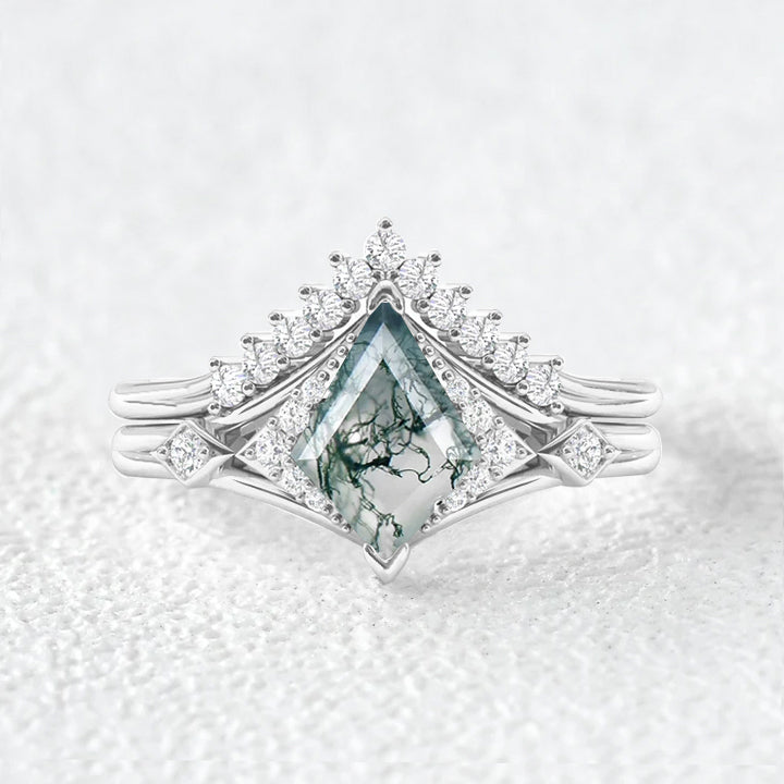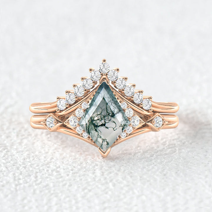 Kite Cut Moss Agate Art-Deco Gorgeous Engagement Ring Set 2pcs