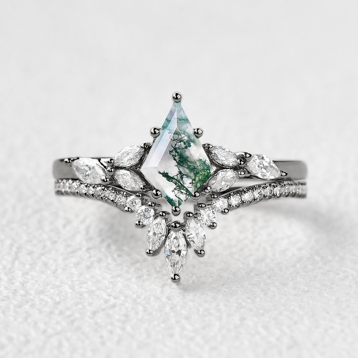 Kite Cut Moss Agate Cluster Engagement Ring Set 2pcs Prong Wedding Bridal Set Women Anniversary Gift