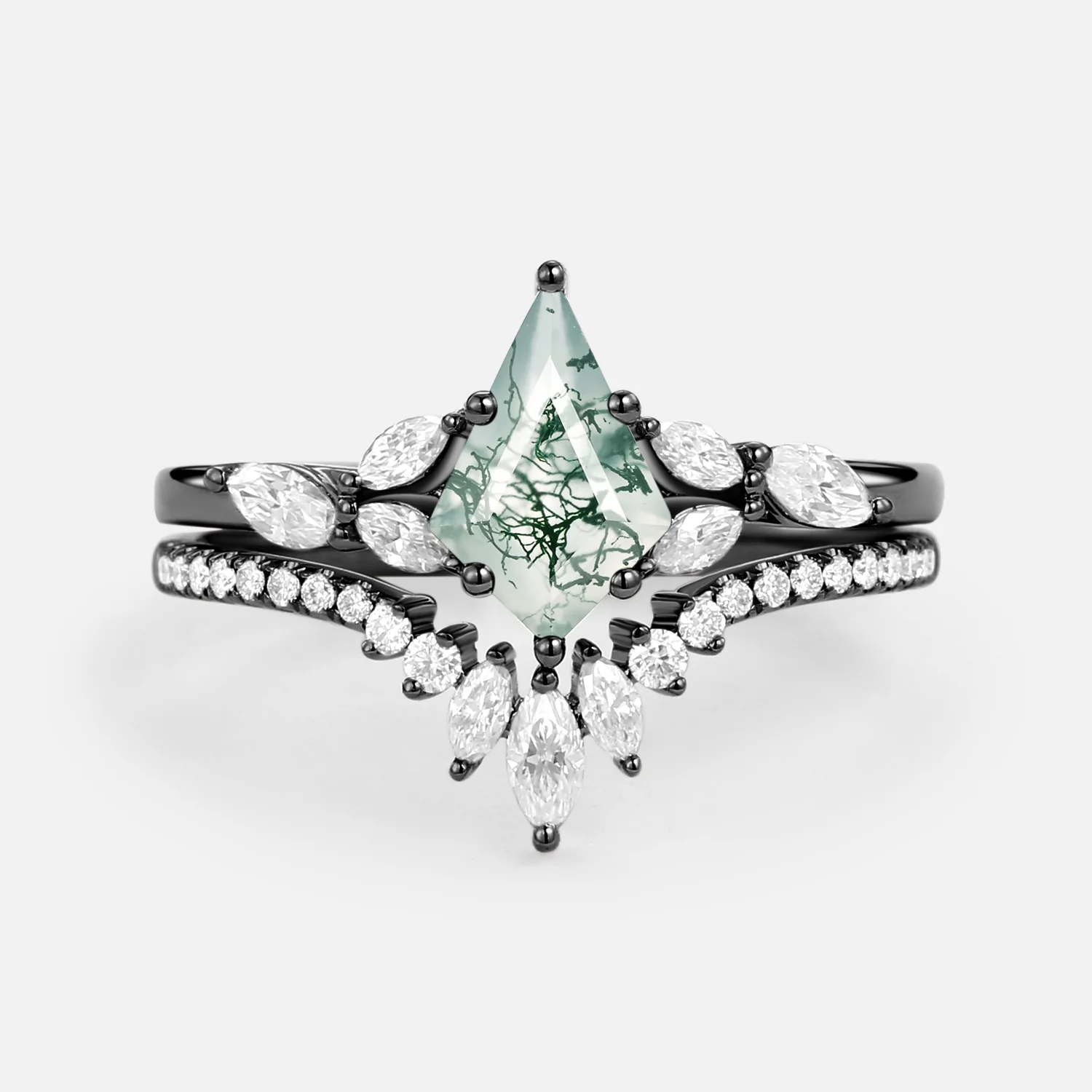 Kite Cut Moss Agate Black Gold Engagement Ring Set 2pcs - July