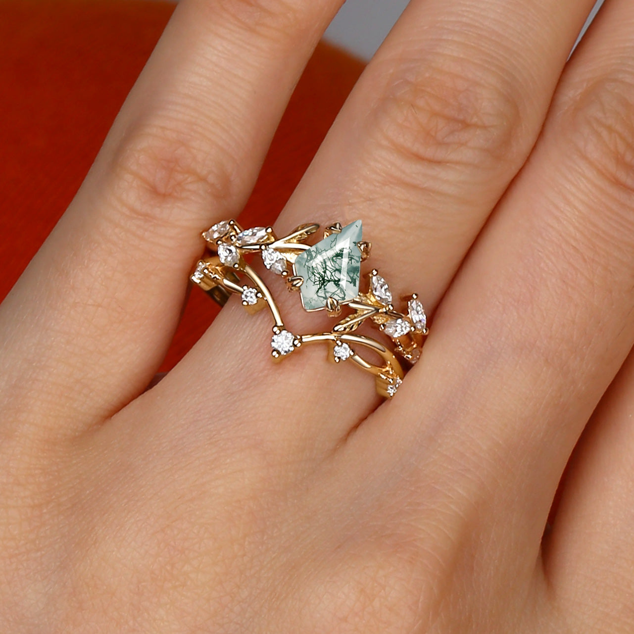 Kite Cut Moss Agate Leafy Cluster Engagement Ring Sets 2pcs