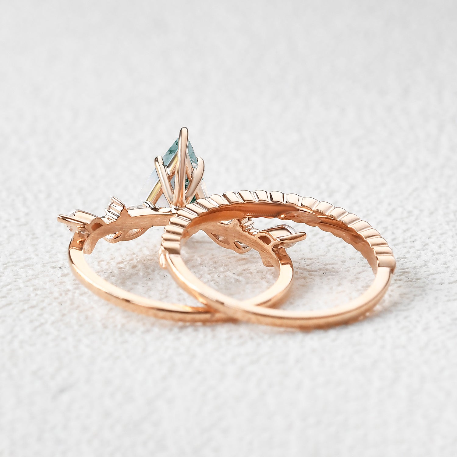 Kite Cut Moss Agate Leafy Vintage Engagement Ring Set 2pcs - Kelp