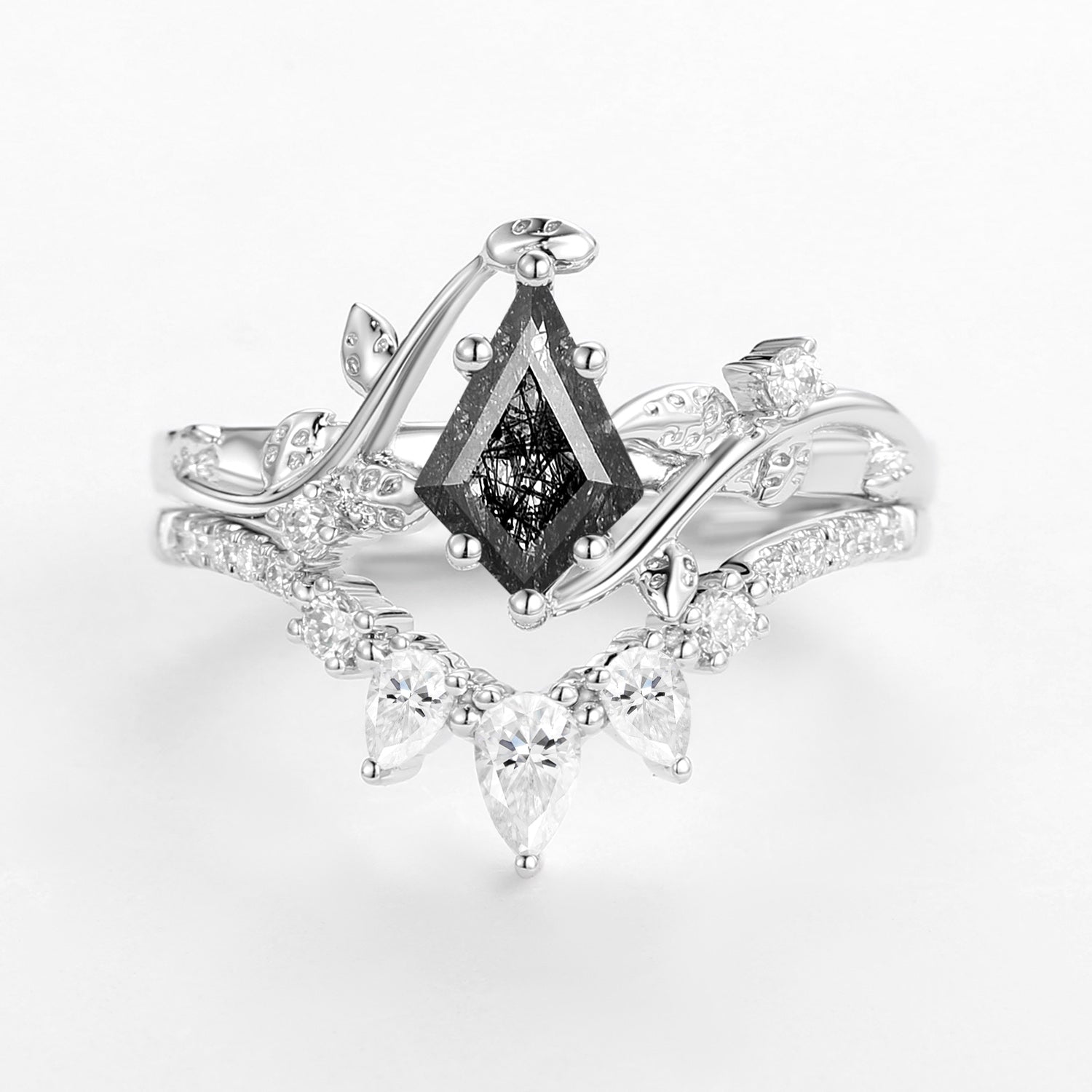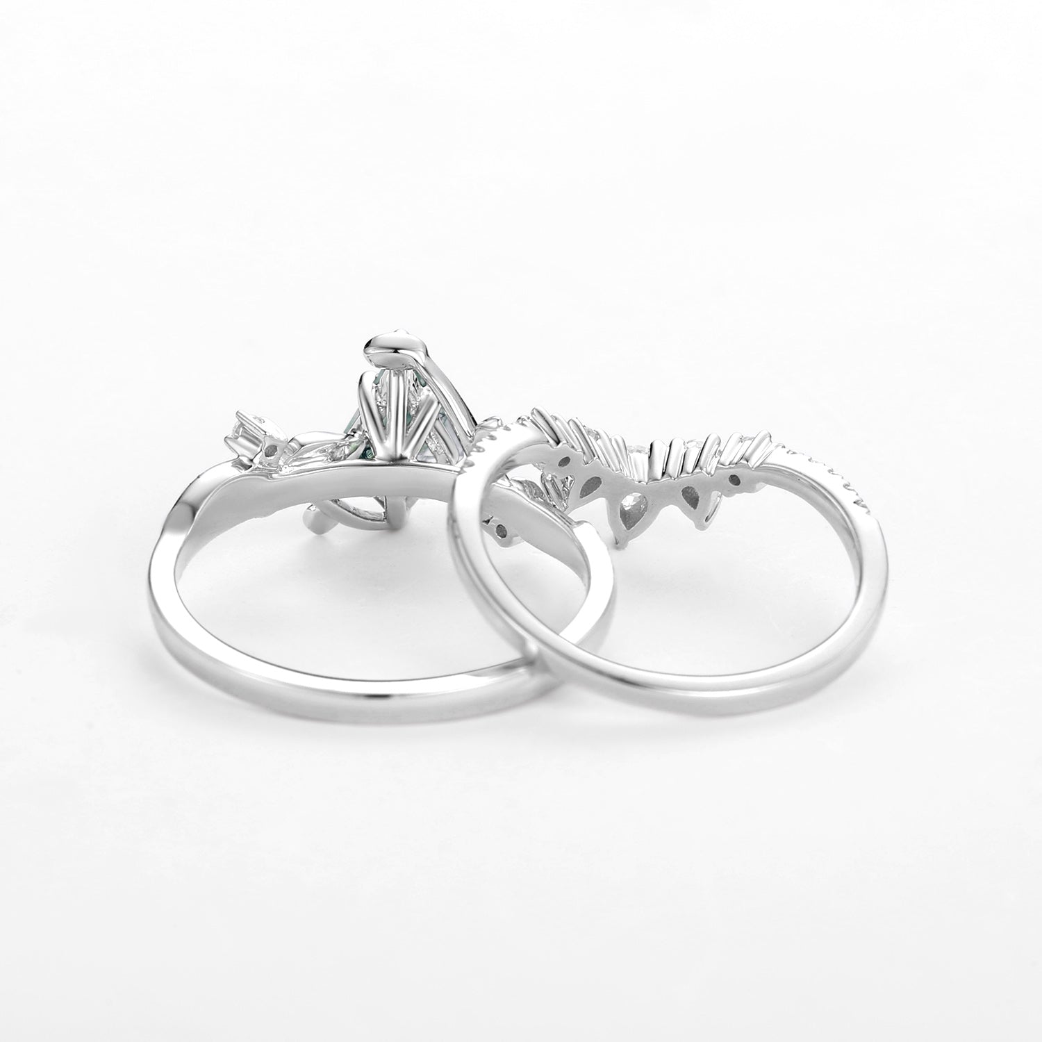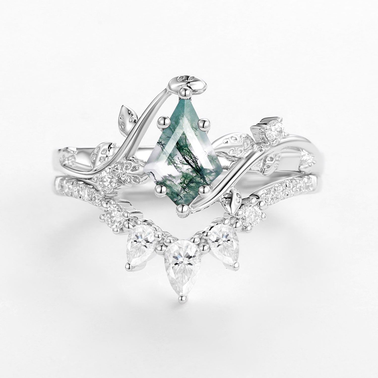 Kite Cut Moss Agate Leafy White Gold Engagement Ring Sets 2pcs