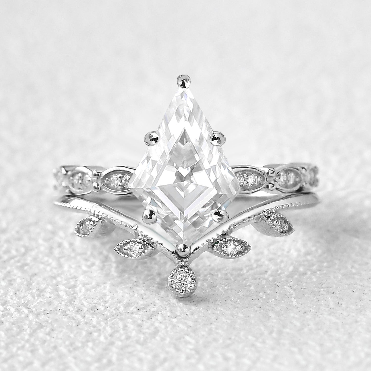 Kite Cut Moss Agate White Gold Leafy Engagement Ring Set 2pcs