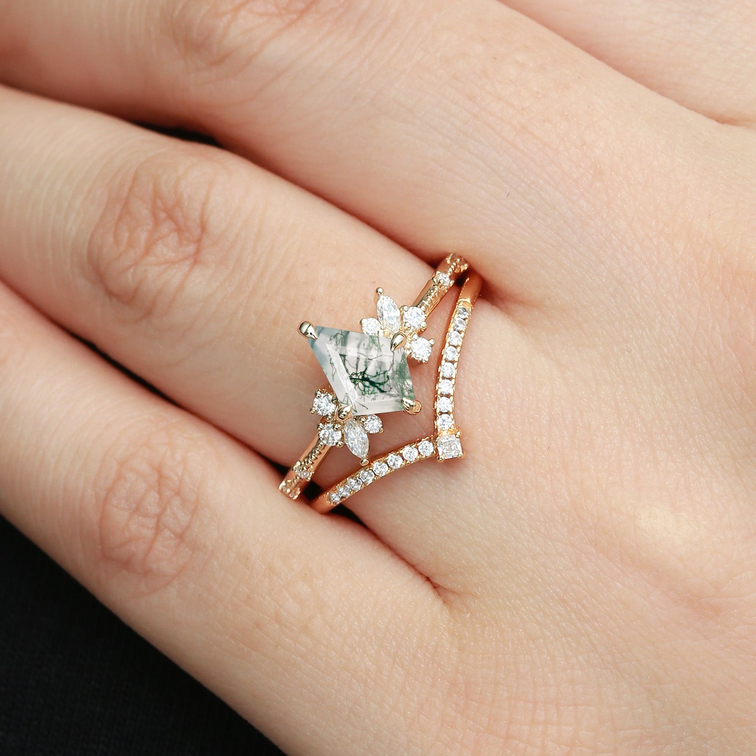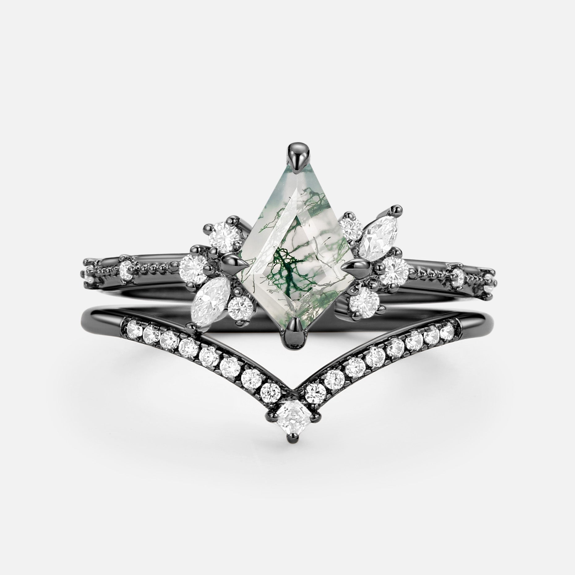 Kite Cut Unique Moss Agate & Moissanite Engagement Ring Set 2pcs