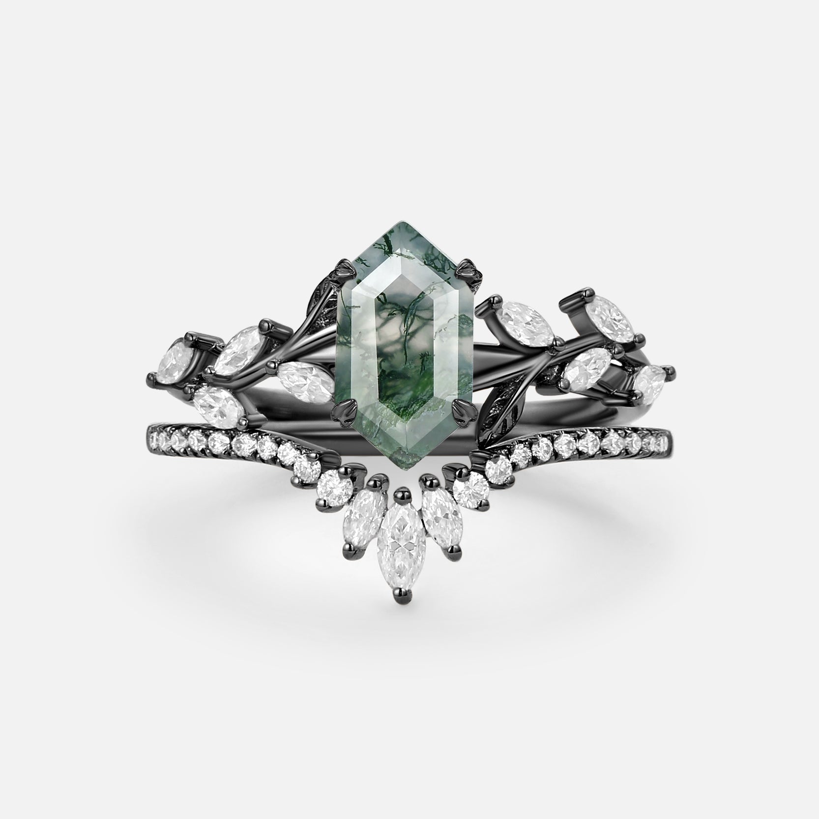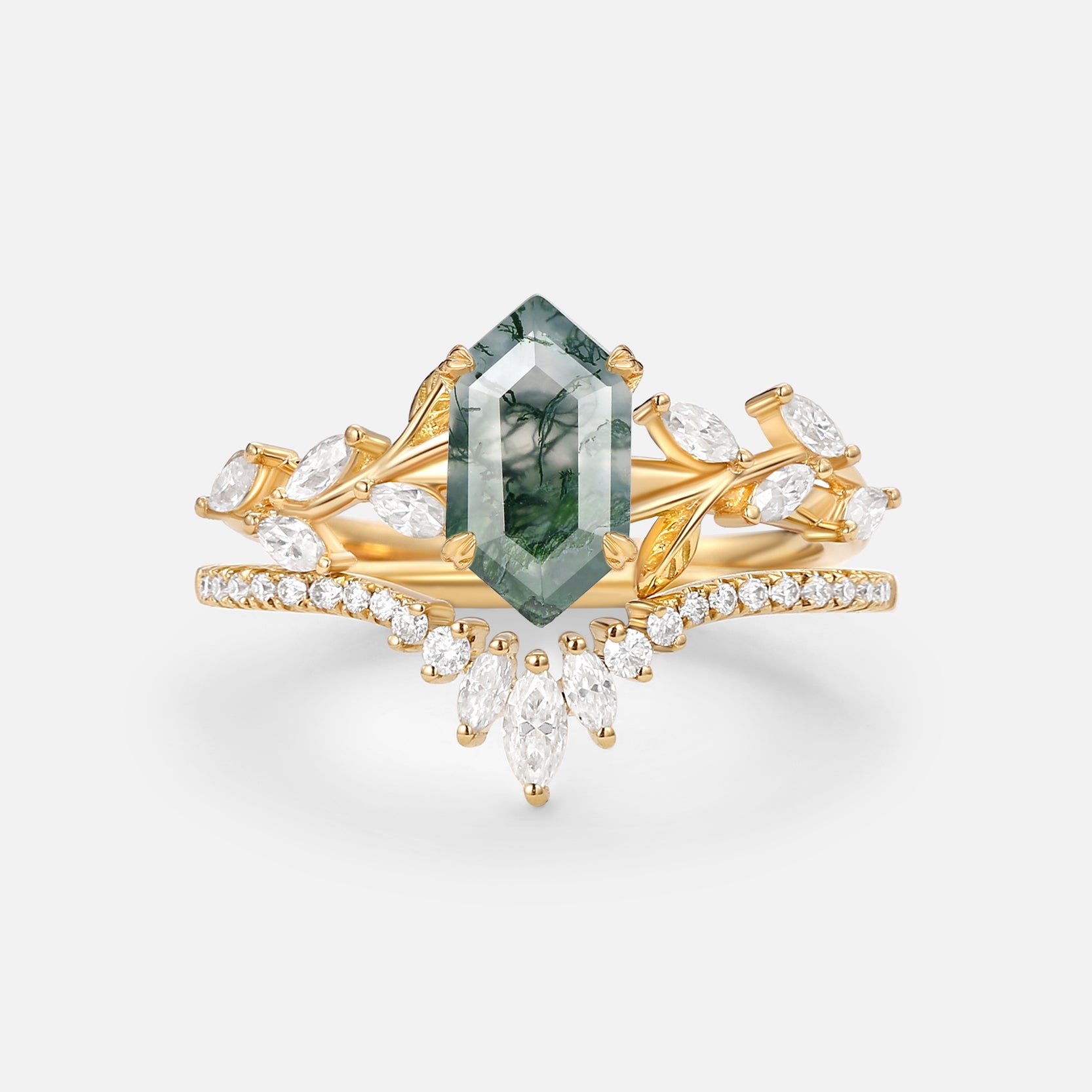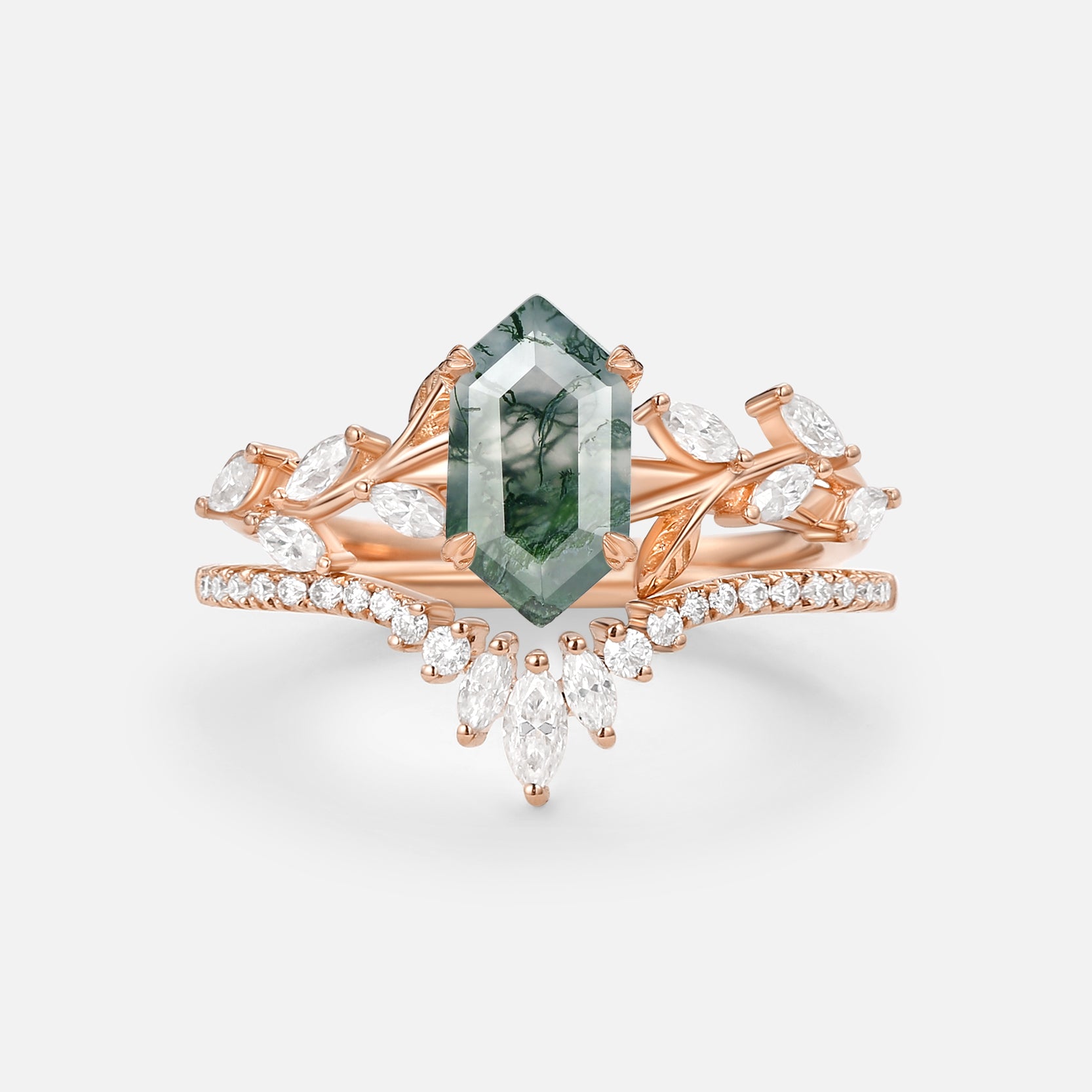 Long Hexagon Cut Moss Agate Leafy Engagement Ring Sets 2pcs - Dart
