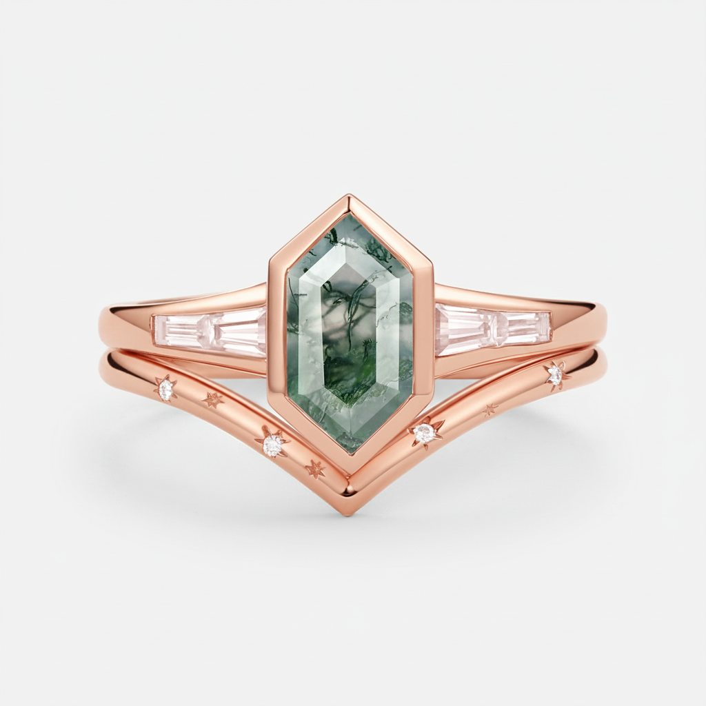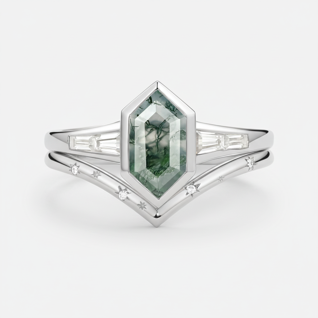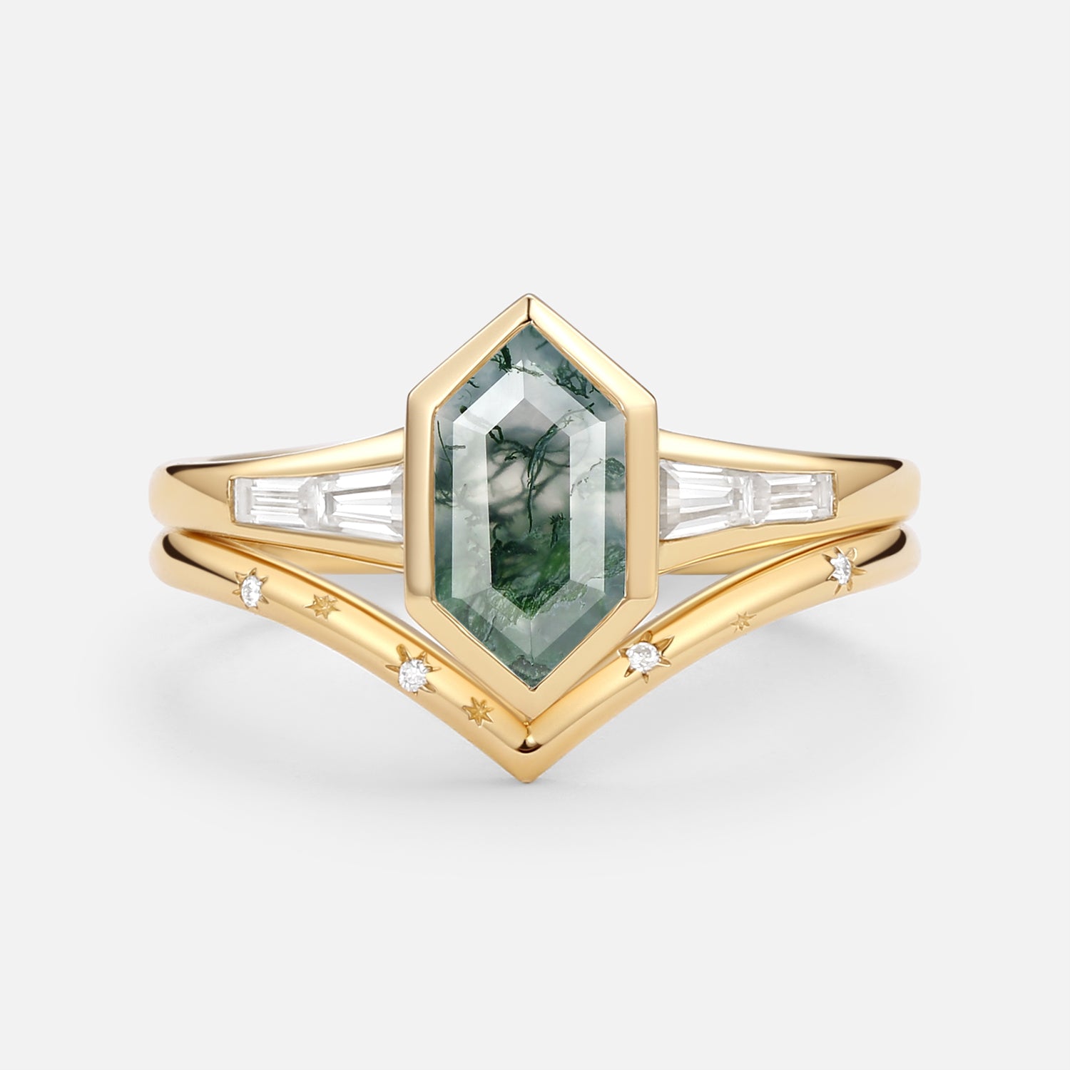 Long Hexagon Moss Agate Minimalist Bridal Ring Set 2pcs
