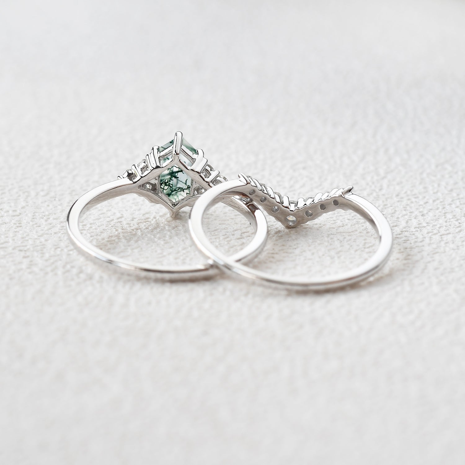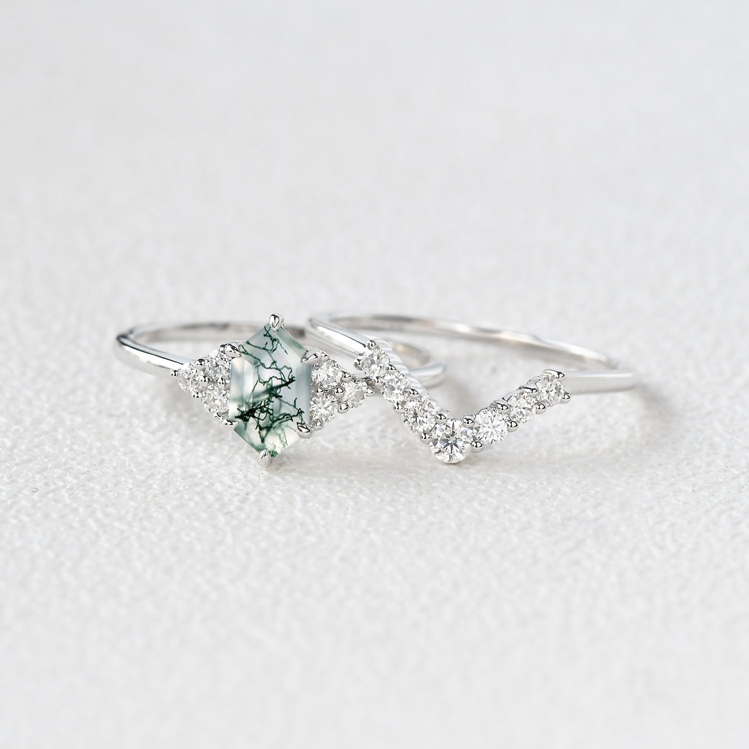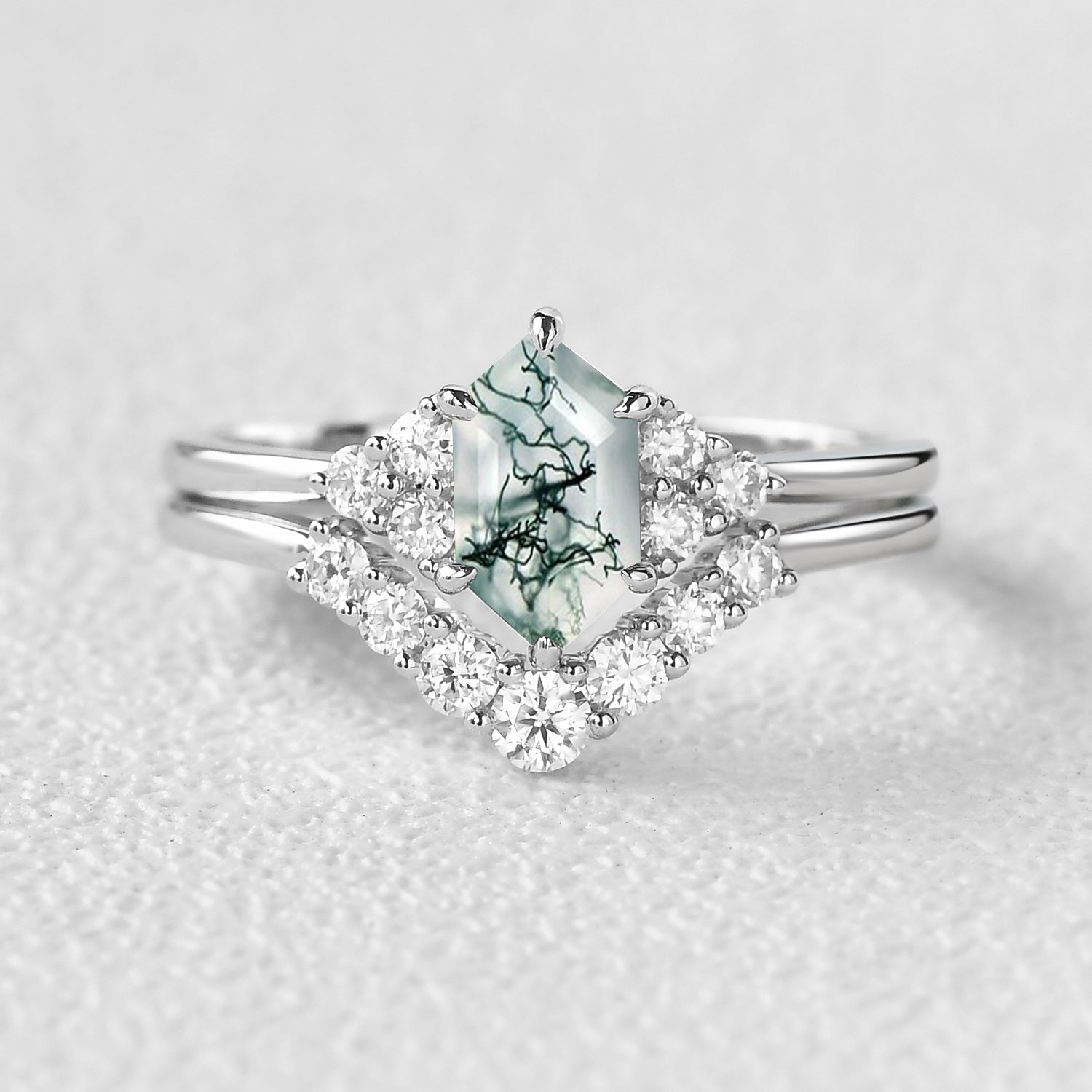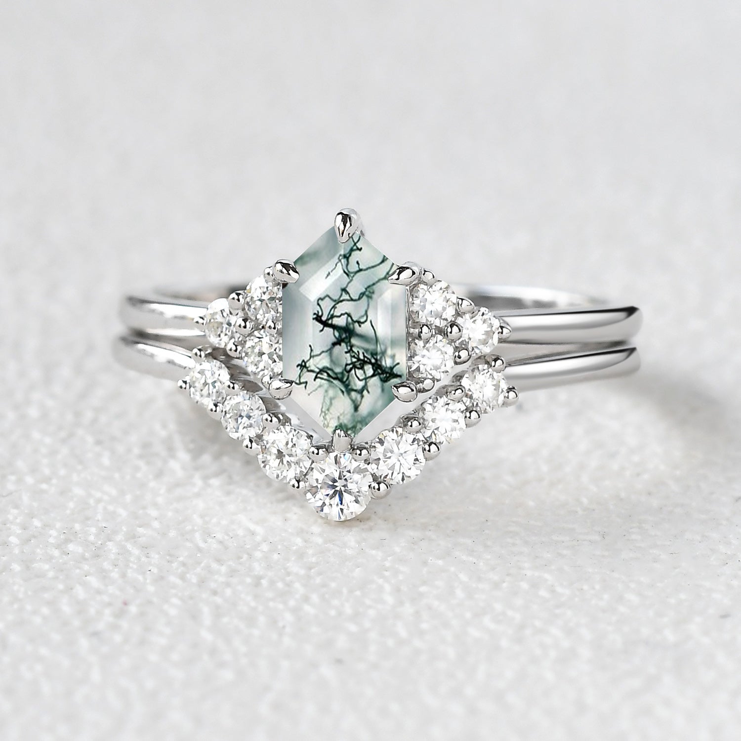 Long Hexagon Moss Agate Stacking Ring Set 2pcs