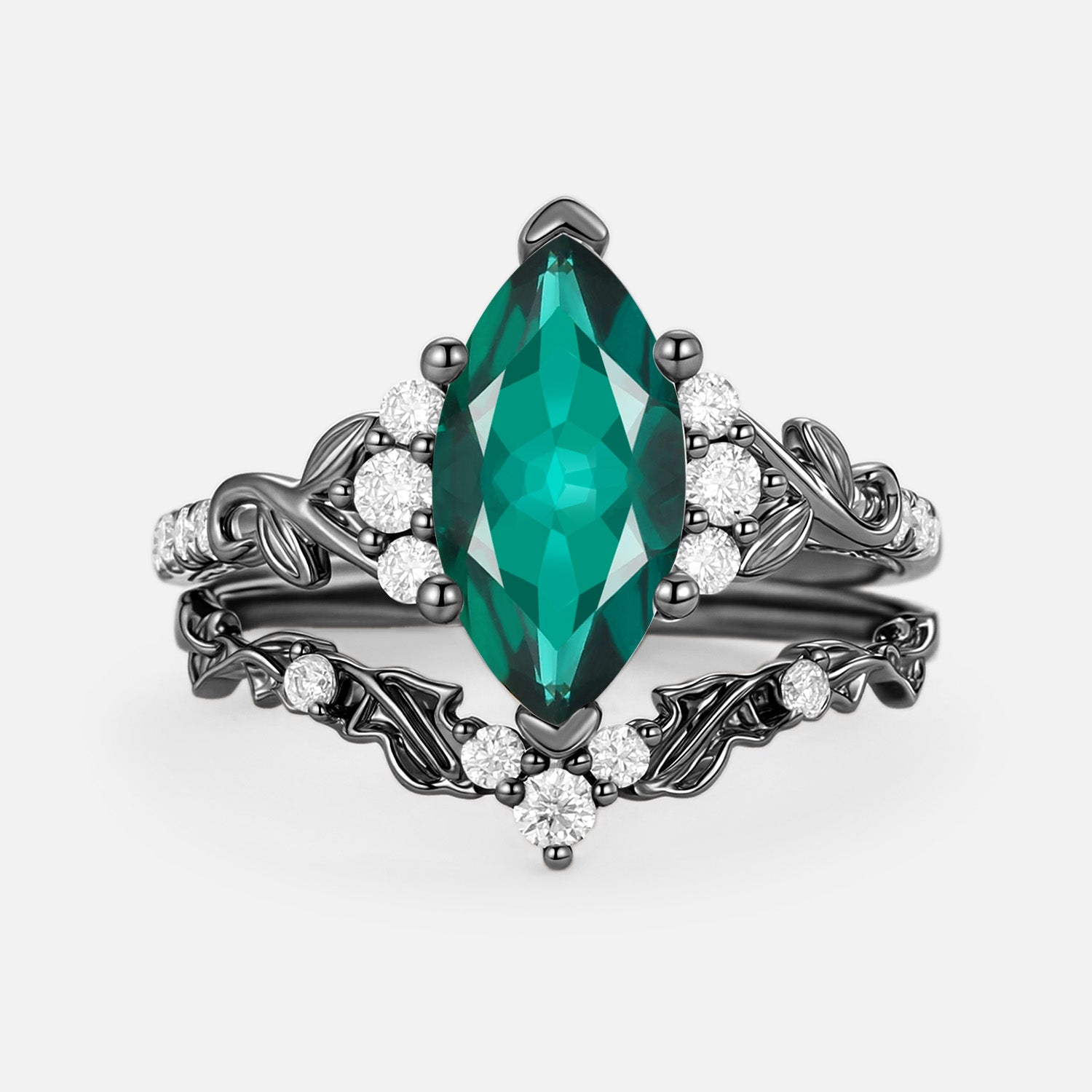 Marquise Cut Lab Emerald Leafy Engagement Ring Sets 2pcs