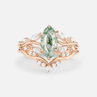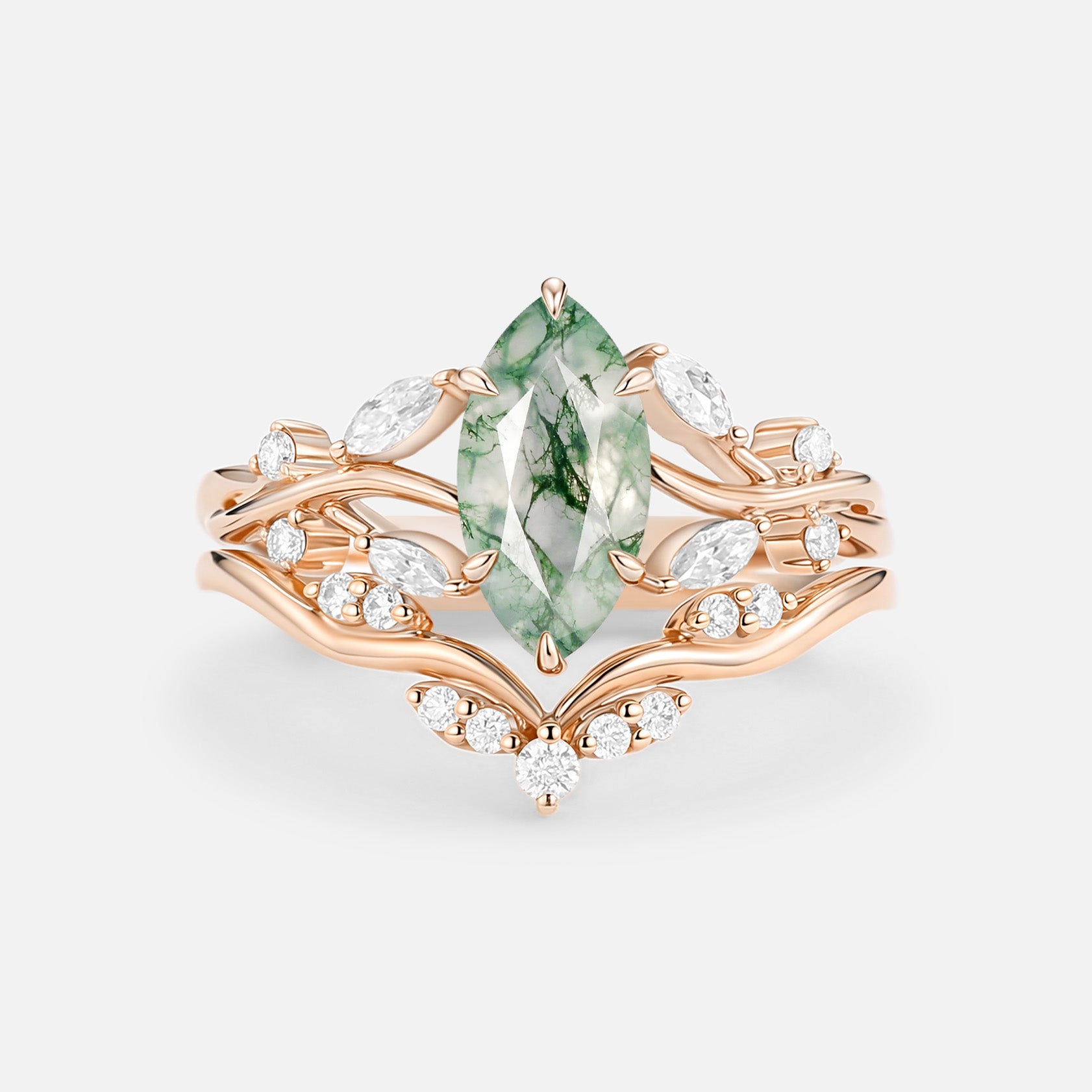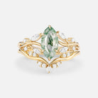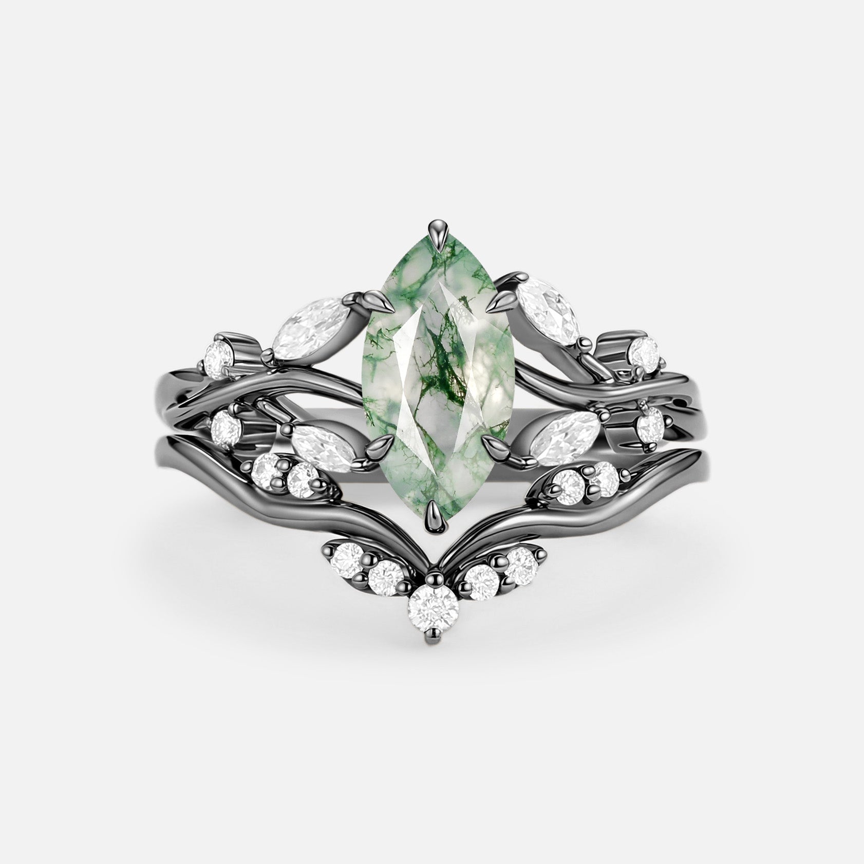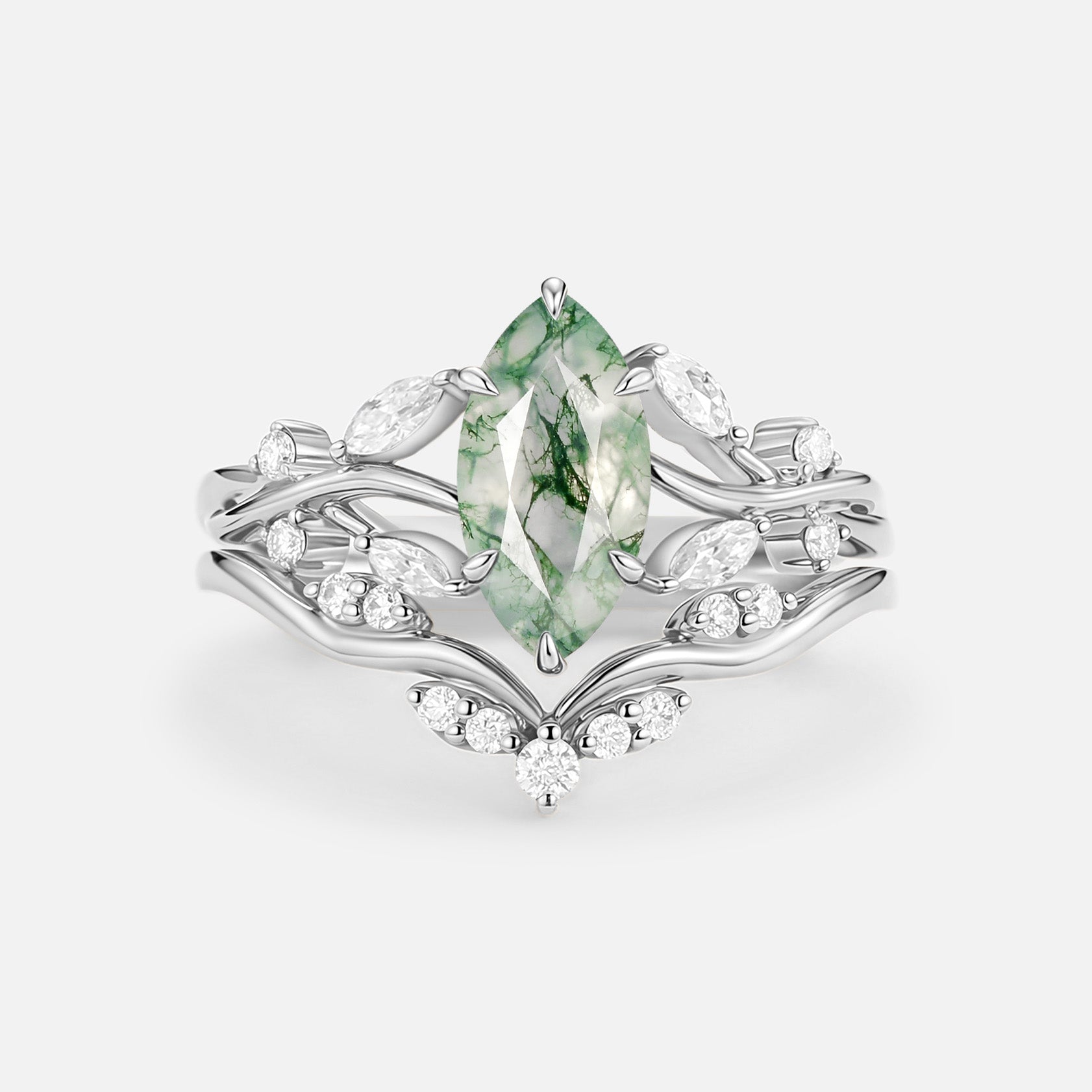 Marquise Cut Moss Agate Engagement Ring Set 2pcs - Mabel