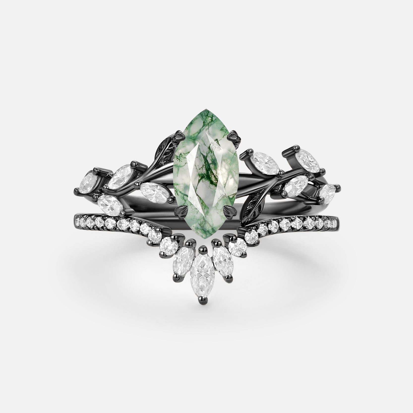Fall for forever with our Dart Marquise Cut Moss Agate Leafy Engagement Ring Set—a 2-piece pair where romance meets artistry.