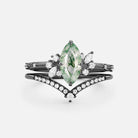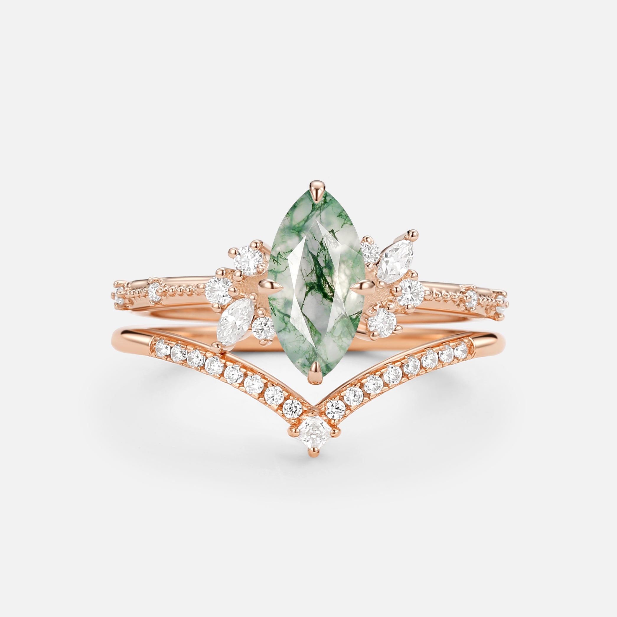 Marquise Cut Unique Moss Agate Engagement Ring Set 2pcs - Lucy