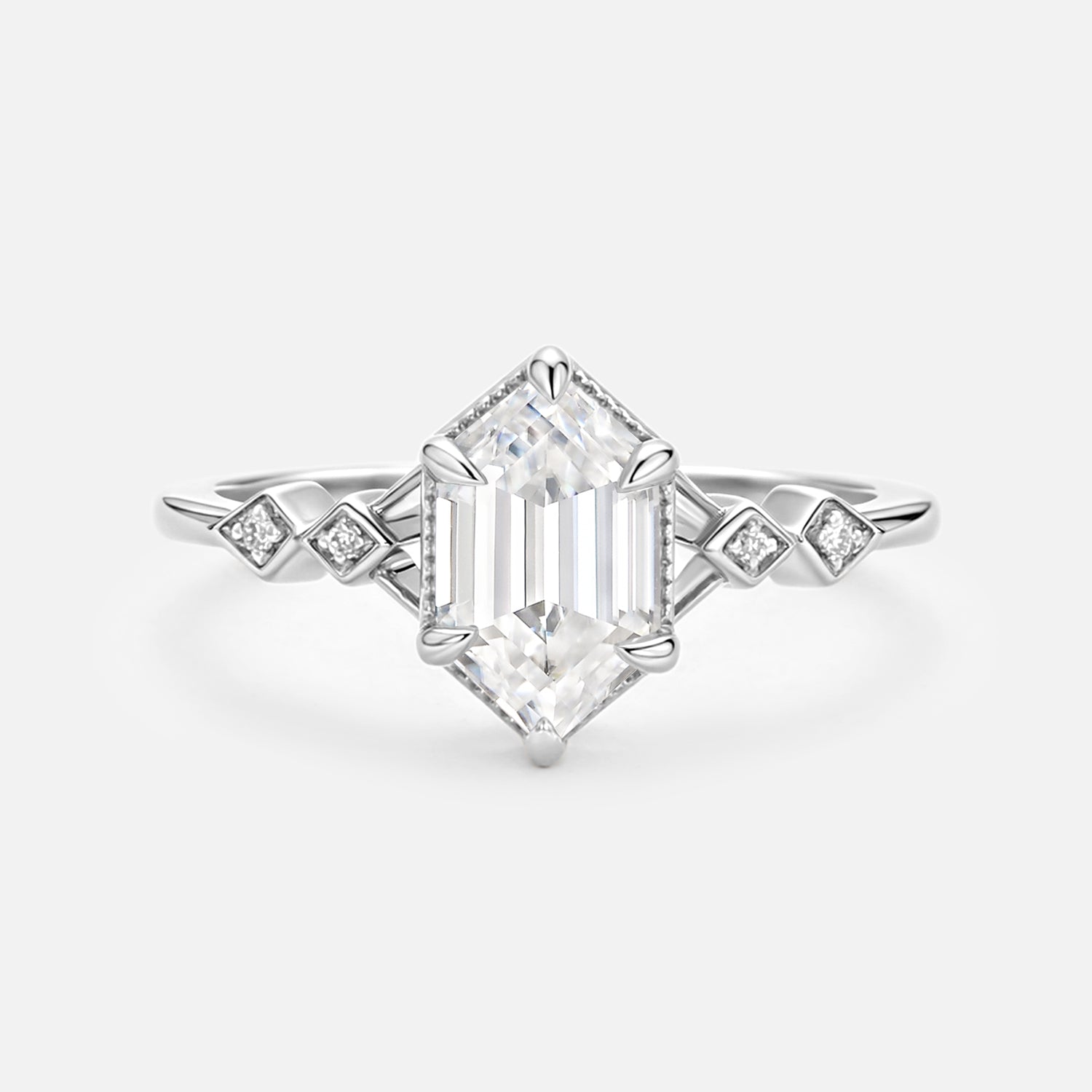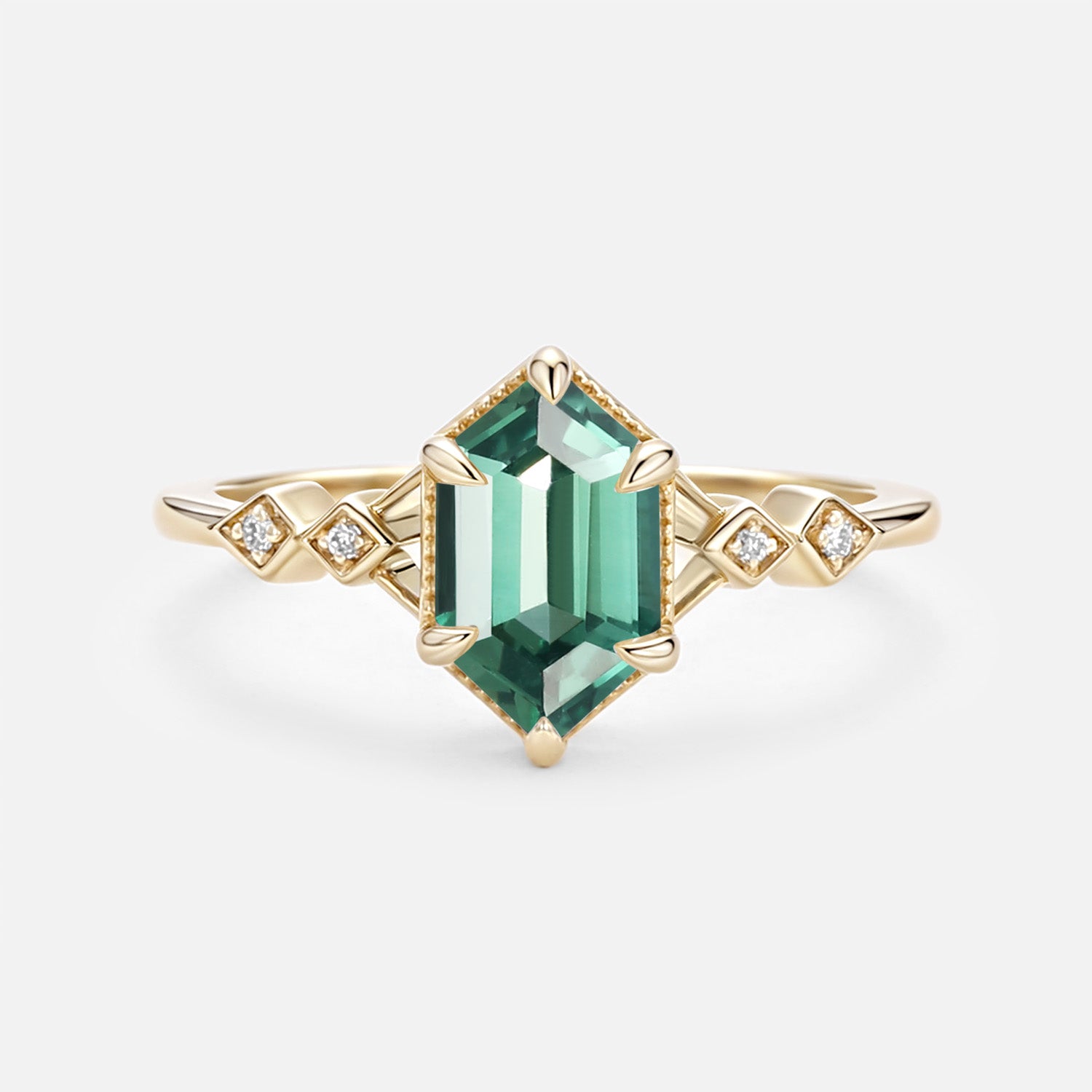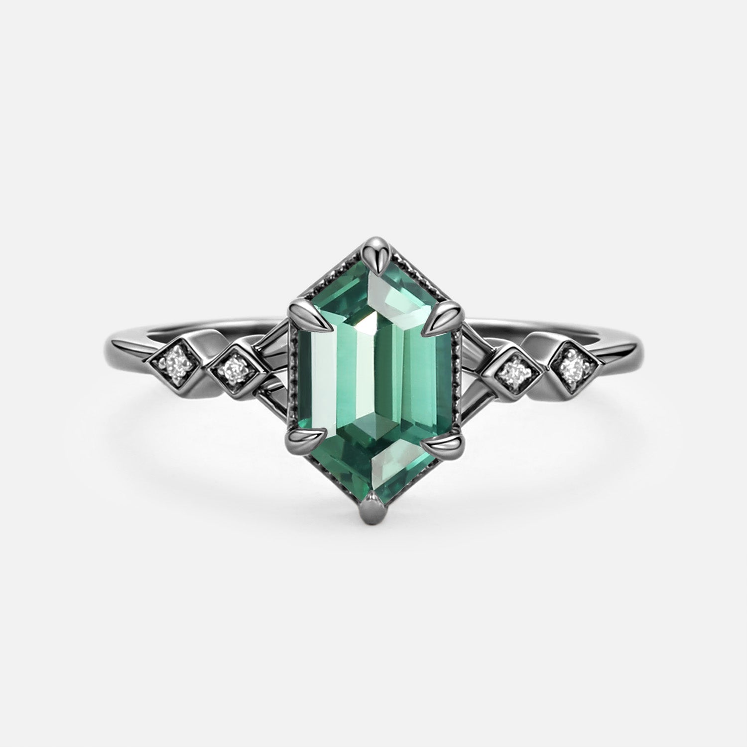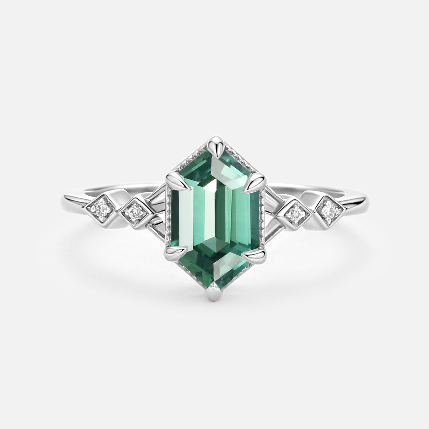 Minimalist Long Hexagon Lab Emerald Engagement Ring