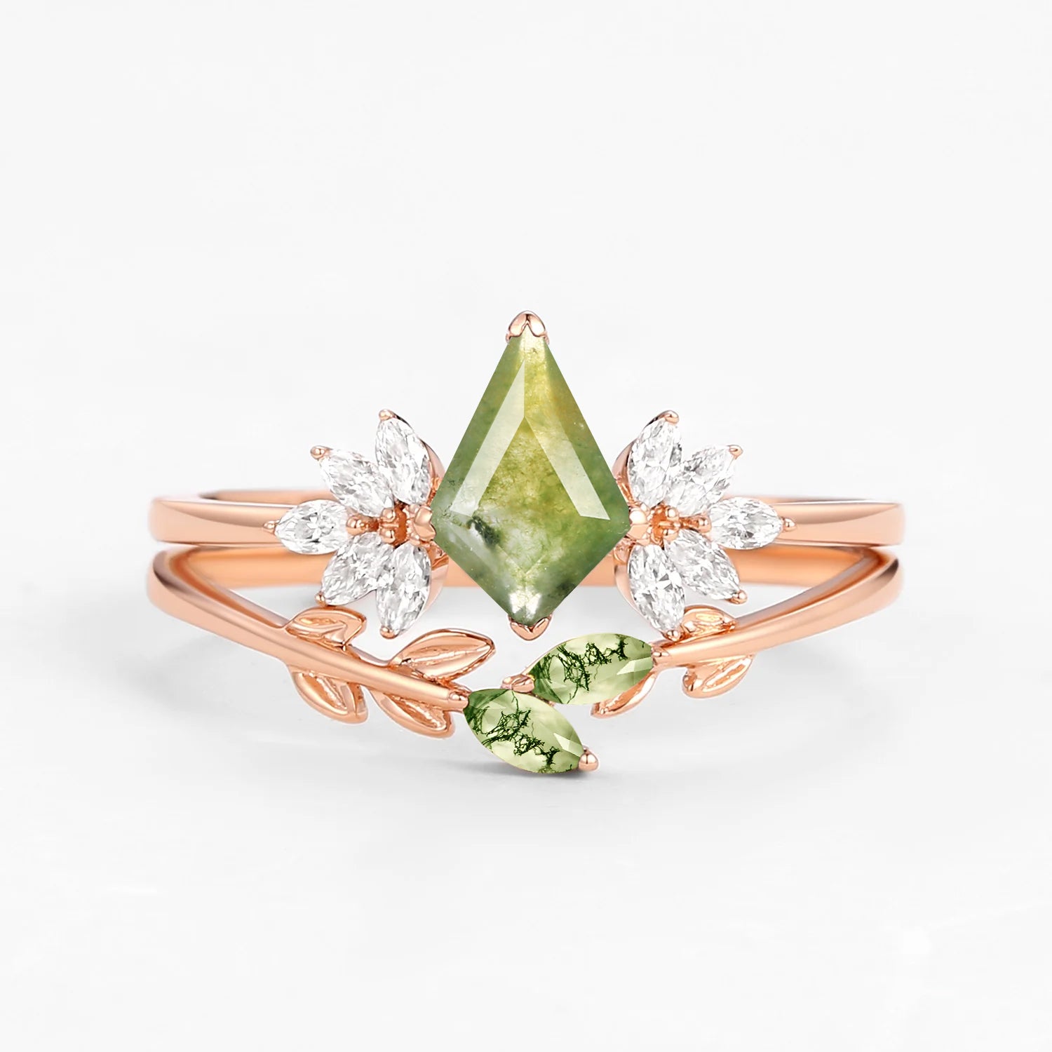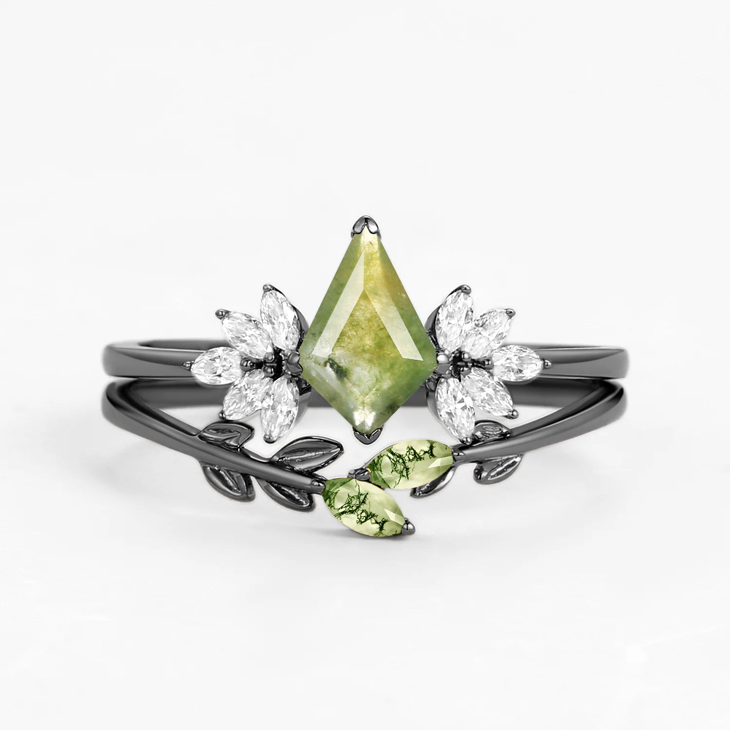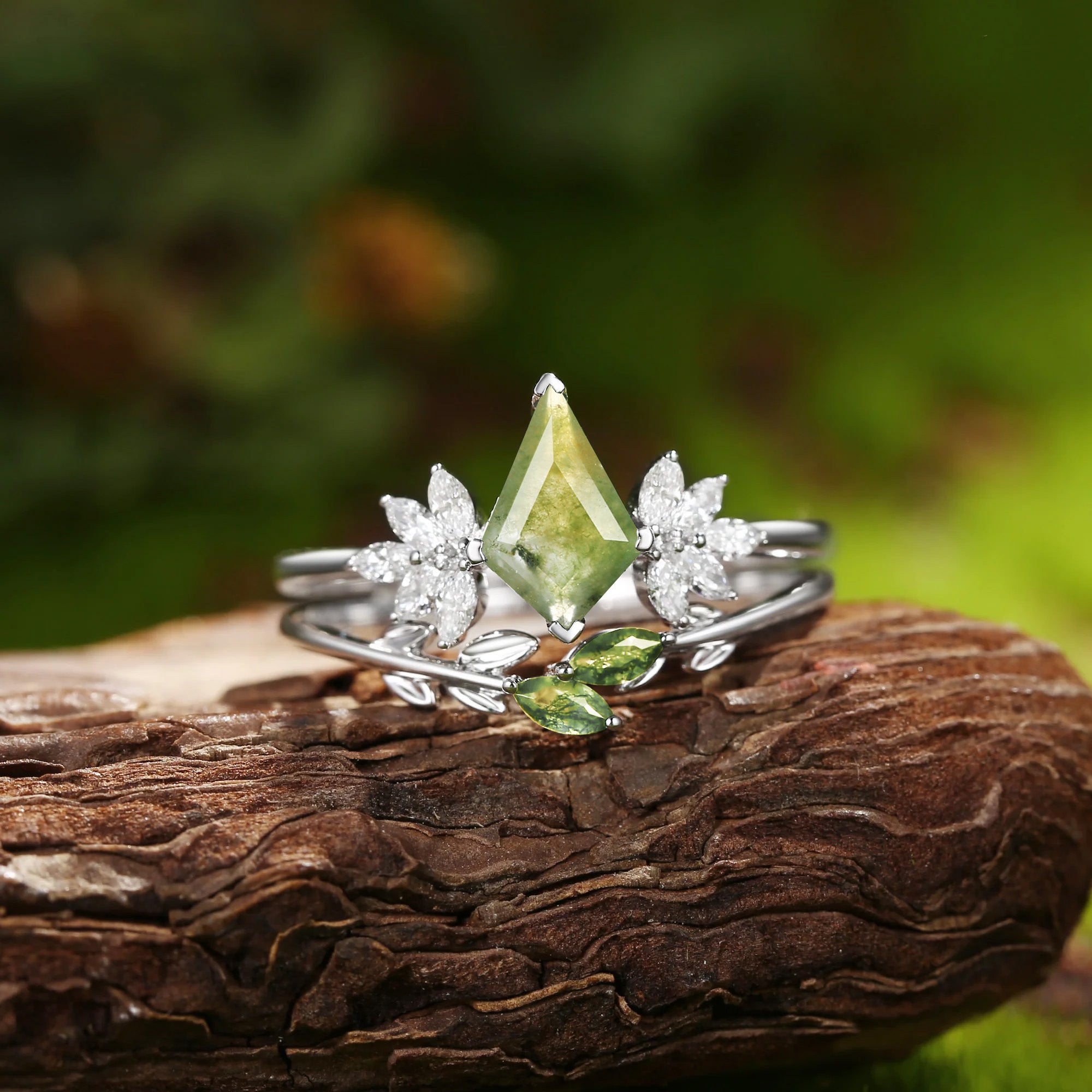 Moss Agate Leafy Forest Elves Engagement Ring Set 2pcs - Amayah