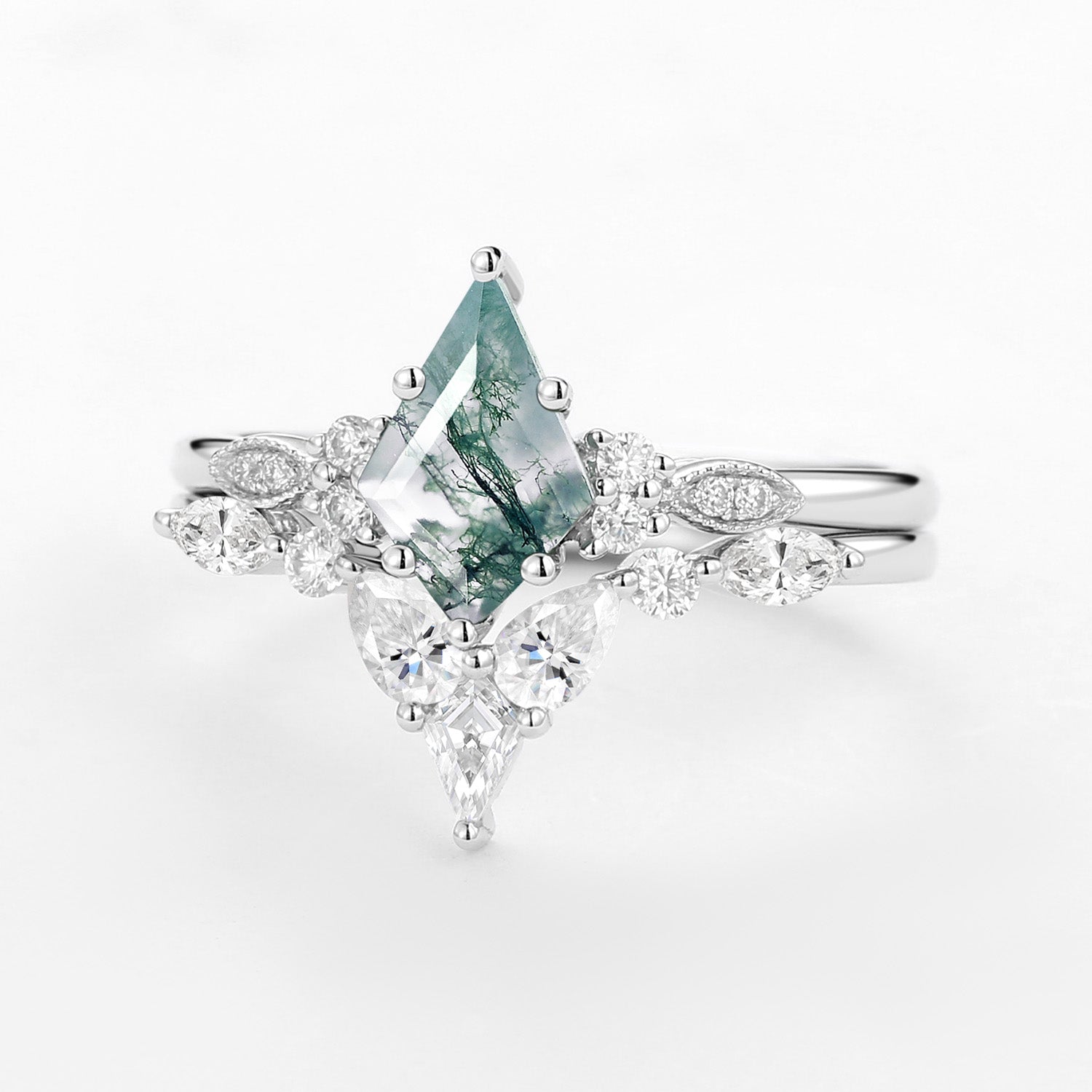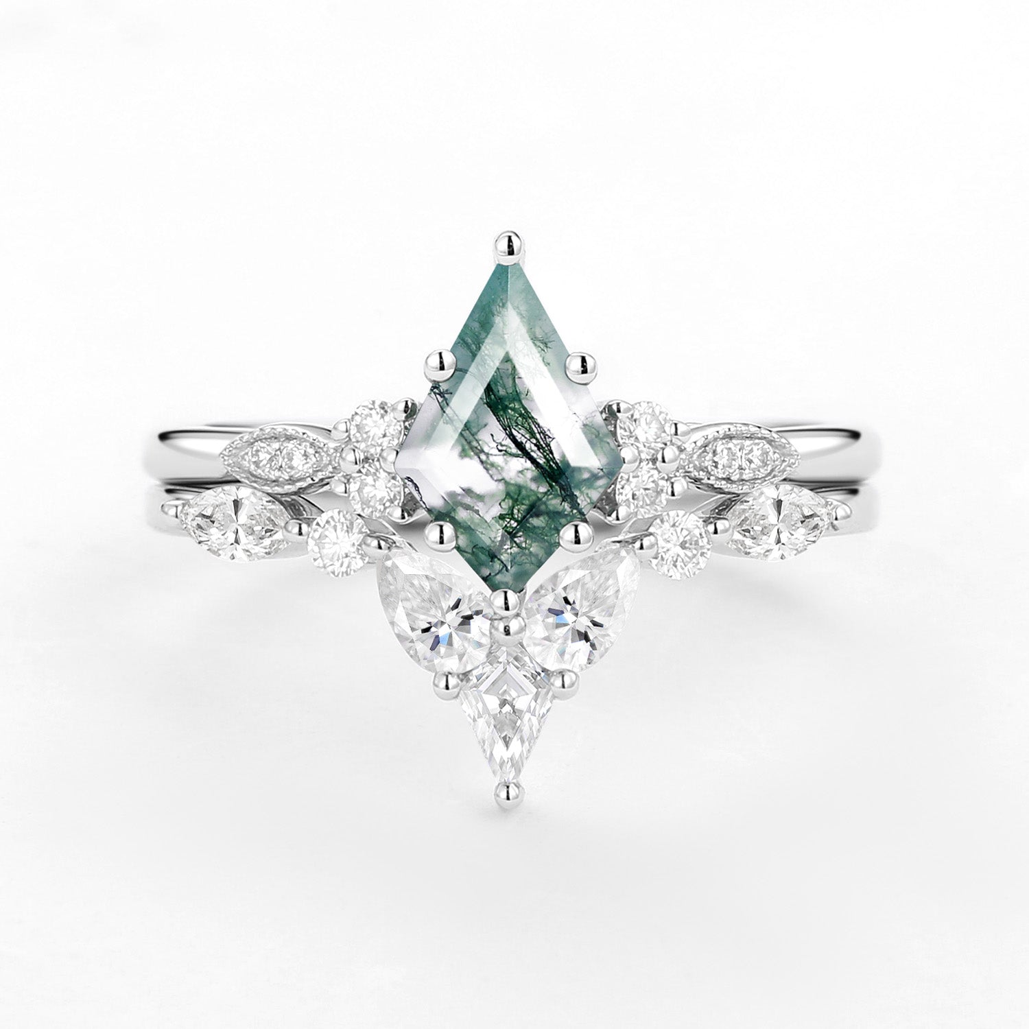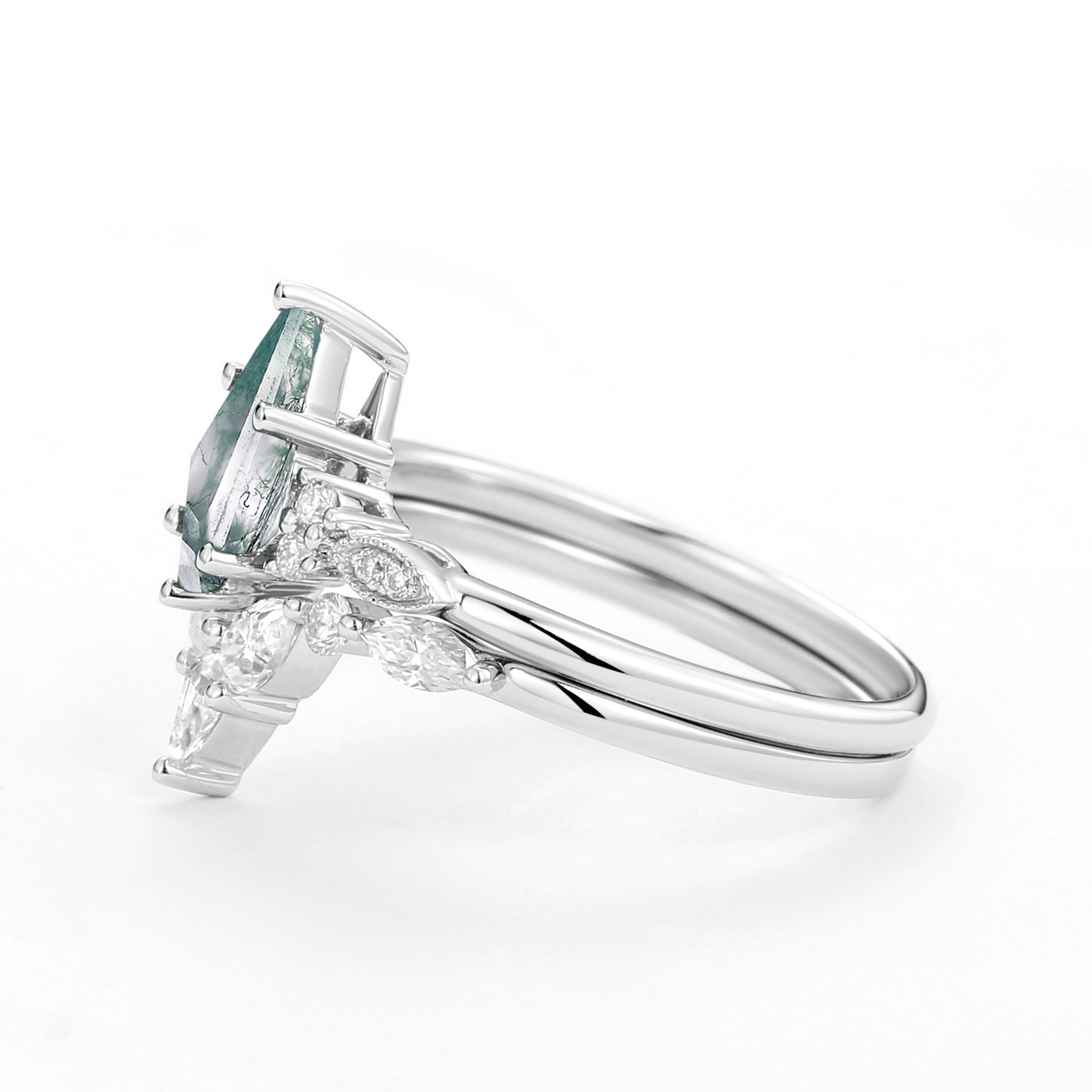 Moss Agate White Gold Engagement Ring Set 2pcs