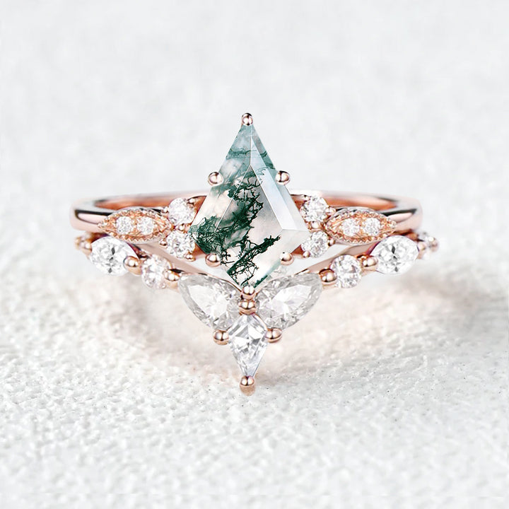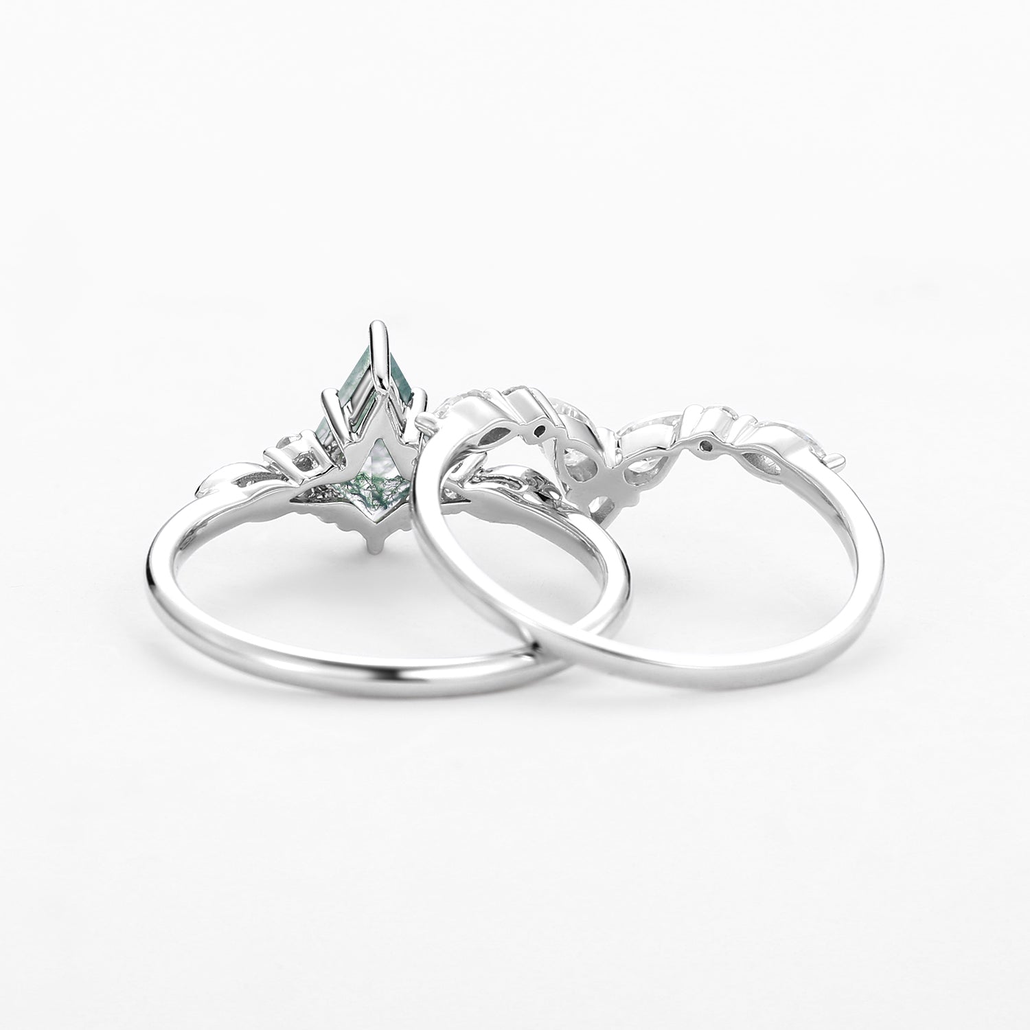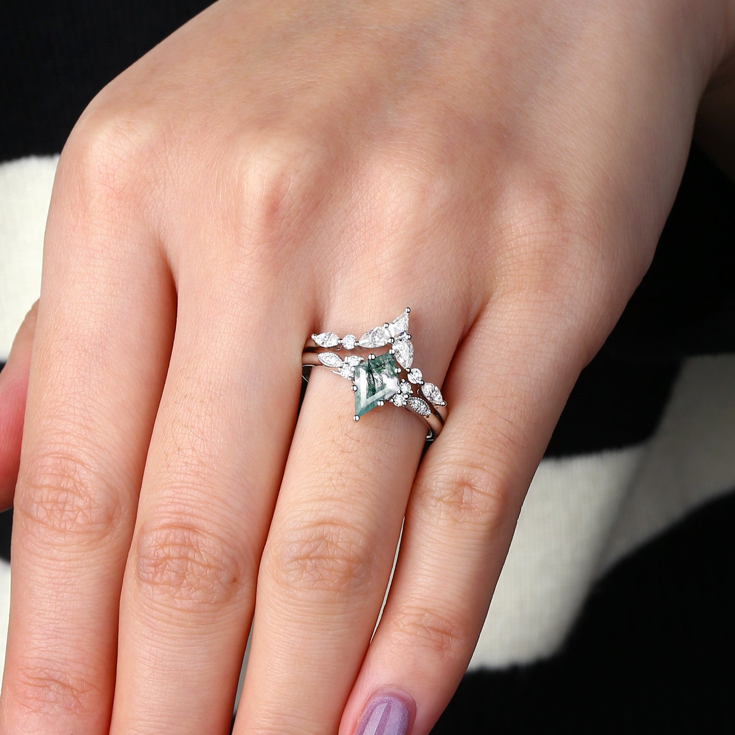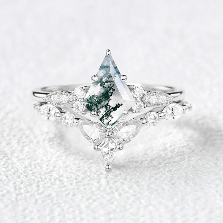 Moss Agate White Gold Engagement Ring Set 2pcs