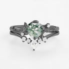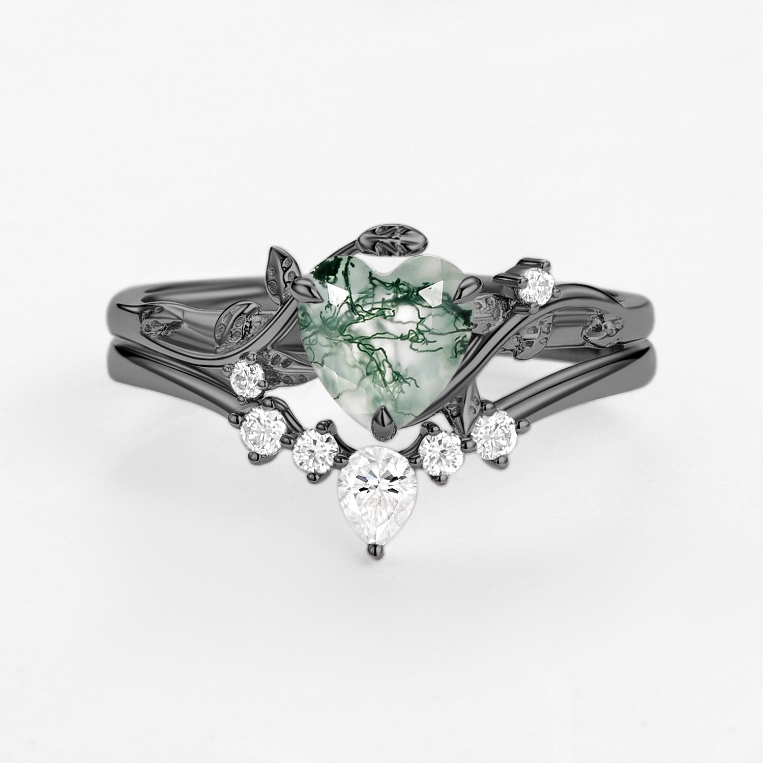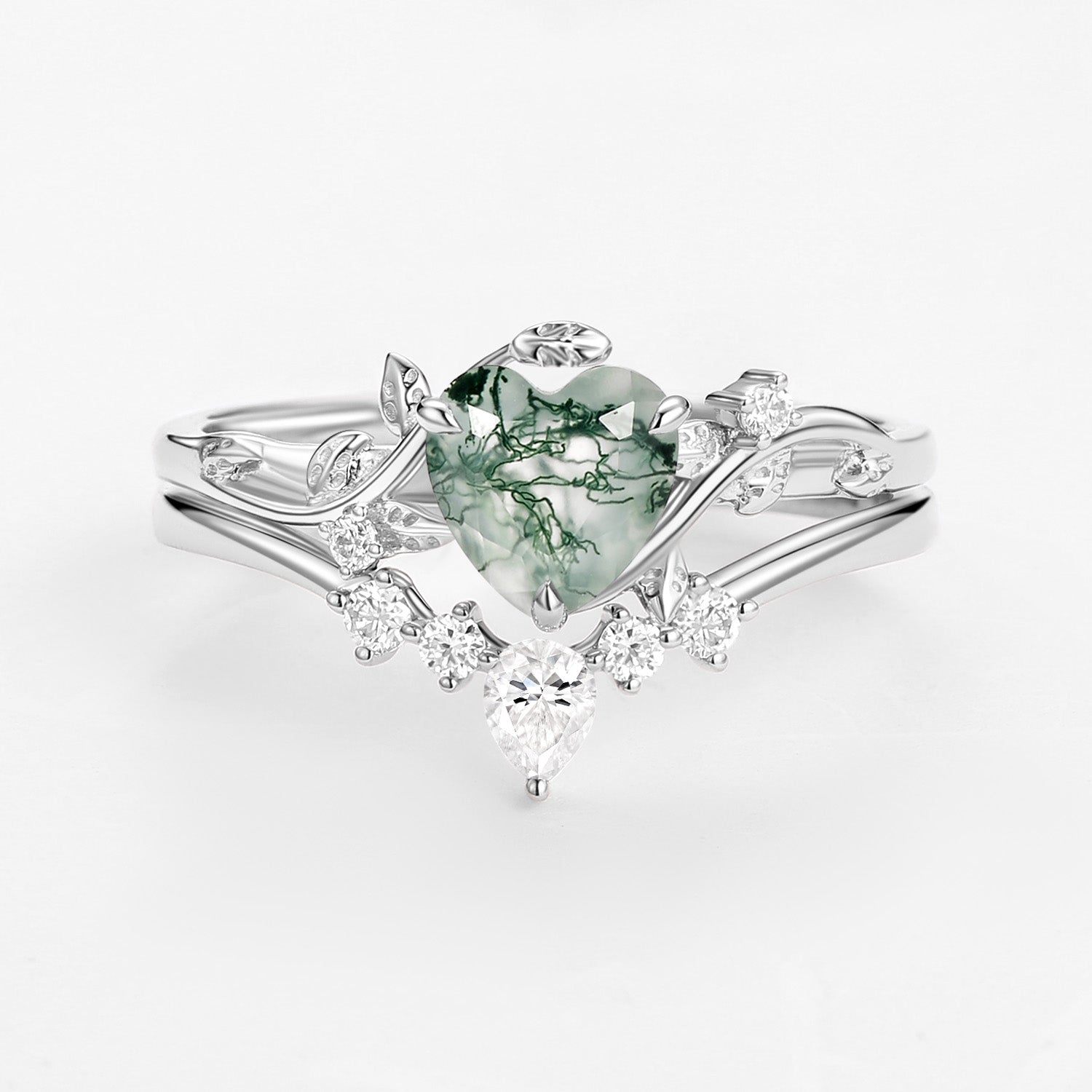 Nature Inspired Heart Shaped Moss Agate Leafy Ring Set 2pcs - Willow