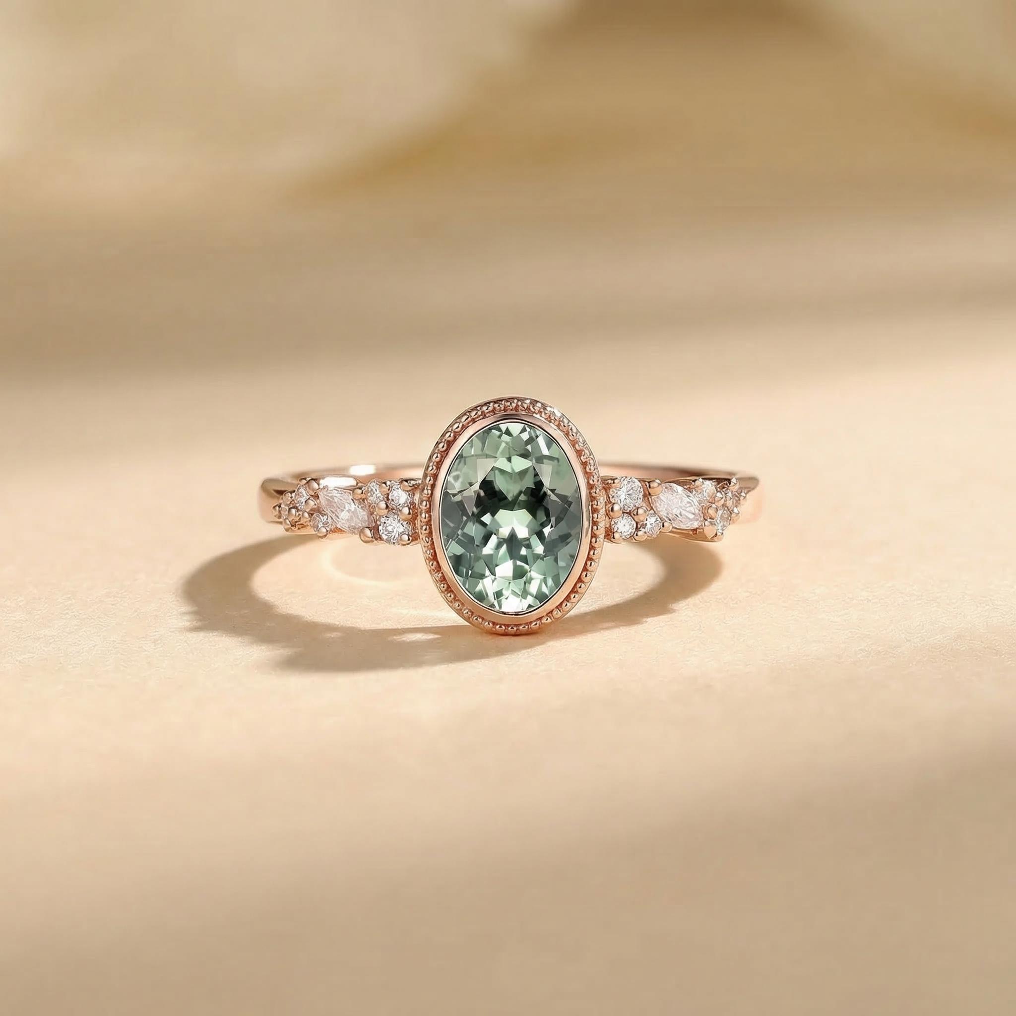 Oval Cut Lab Green Sapphire Cluster Engagement Ring - Nina