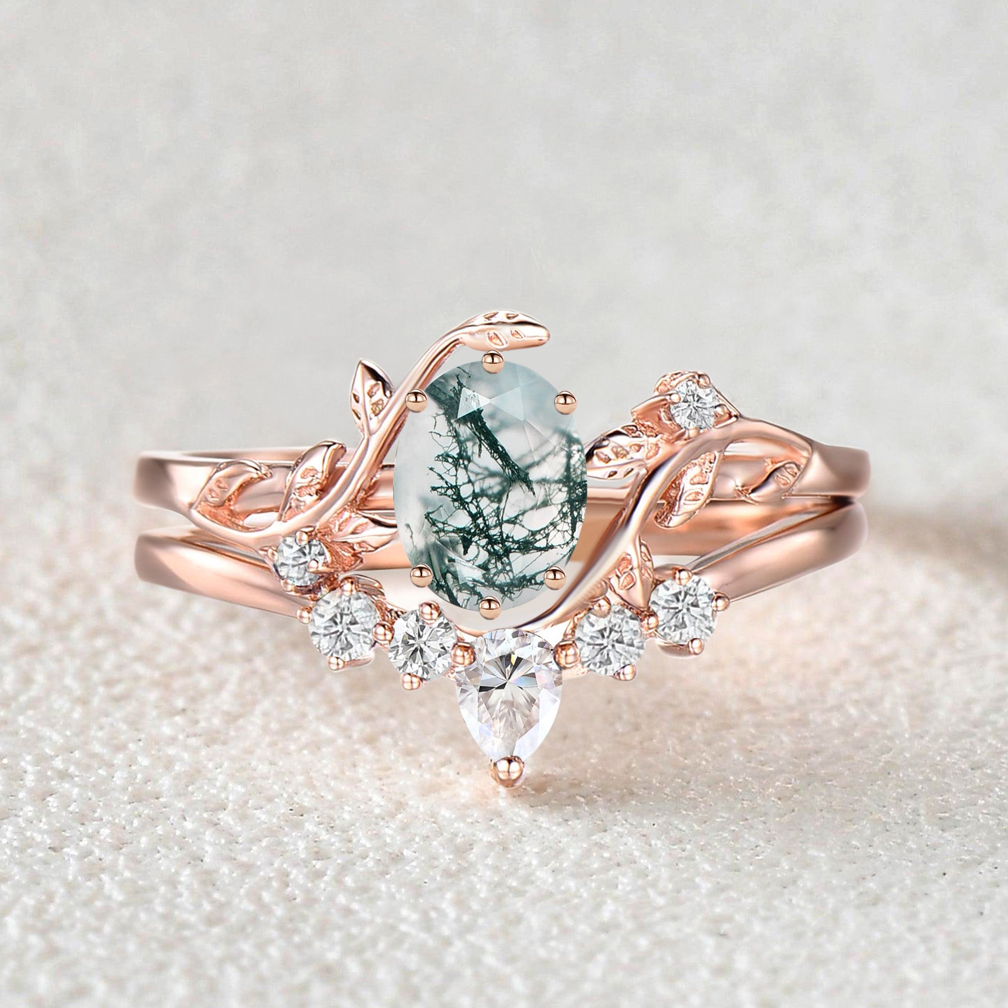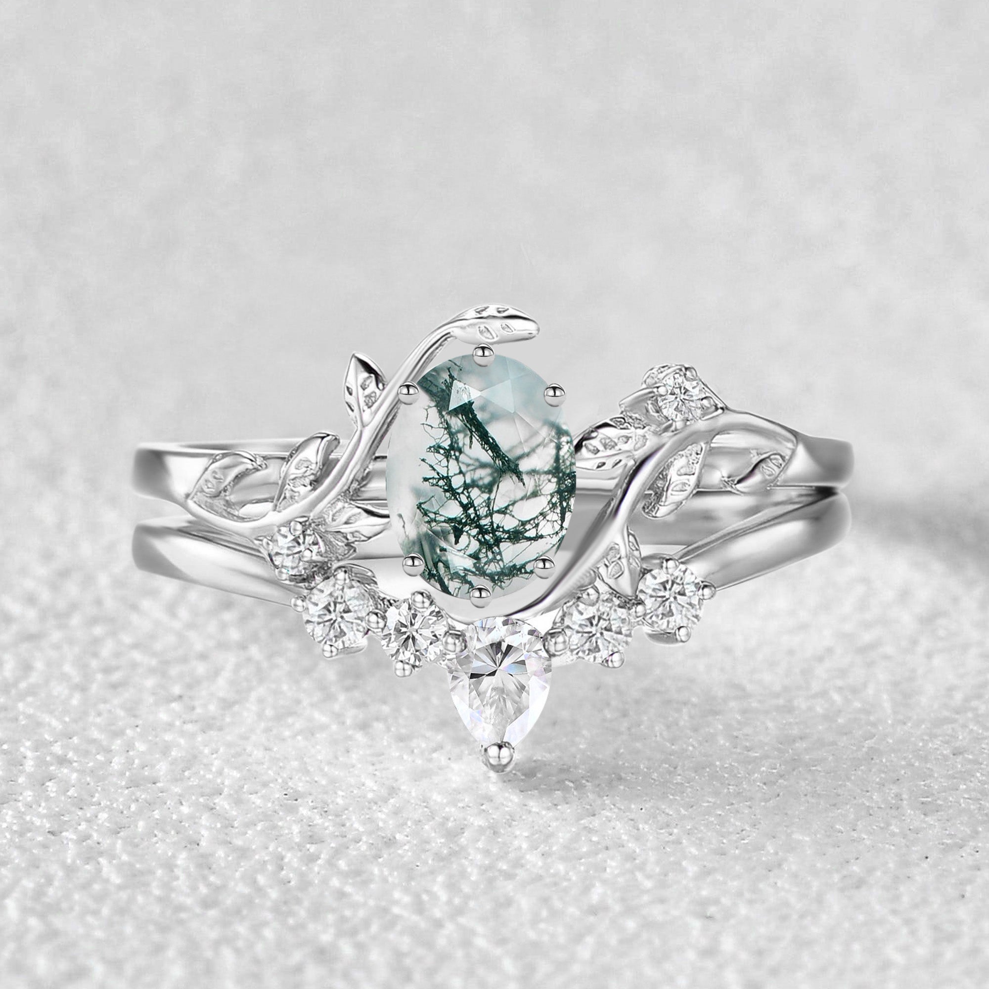 Felicegals 1.5ct Oval Moss Agate White Gold Leafy Ring Set 2pcs Moss Agate Engagement Ring Stacking Wedding Ring Anniversary Promise Women Gift