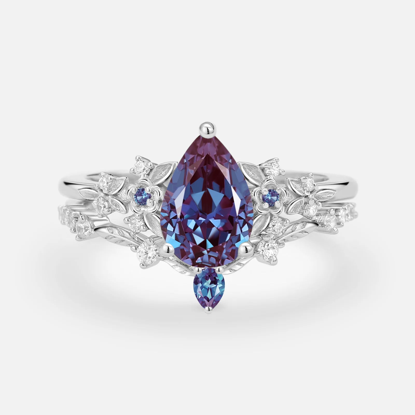 Pear Shaped Lab Alexandrite Flower Bridal Ring Set 2pcs - Loretta