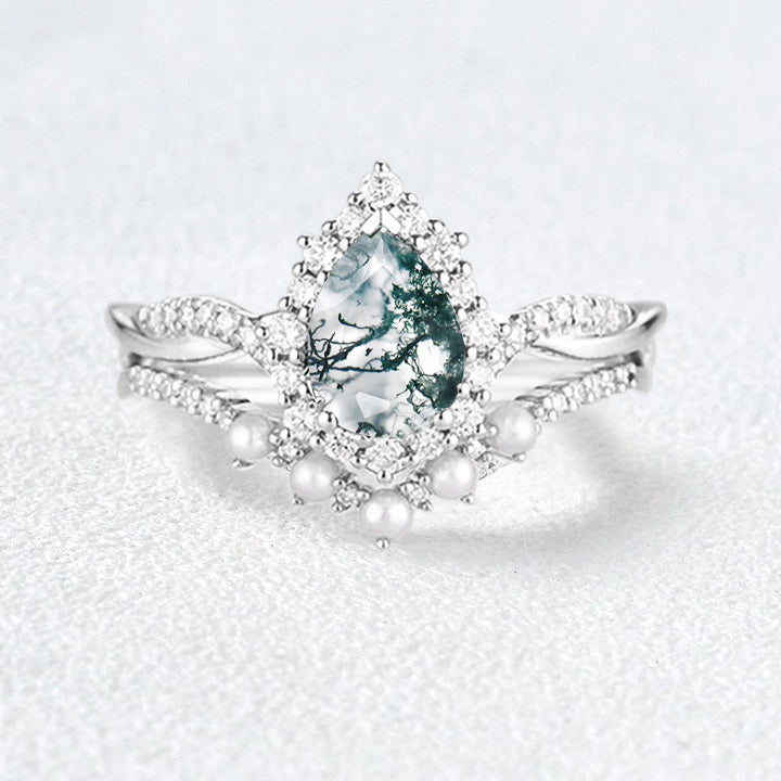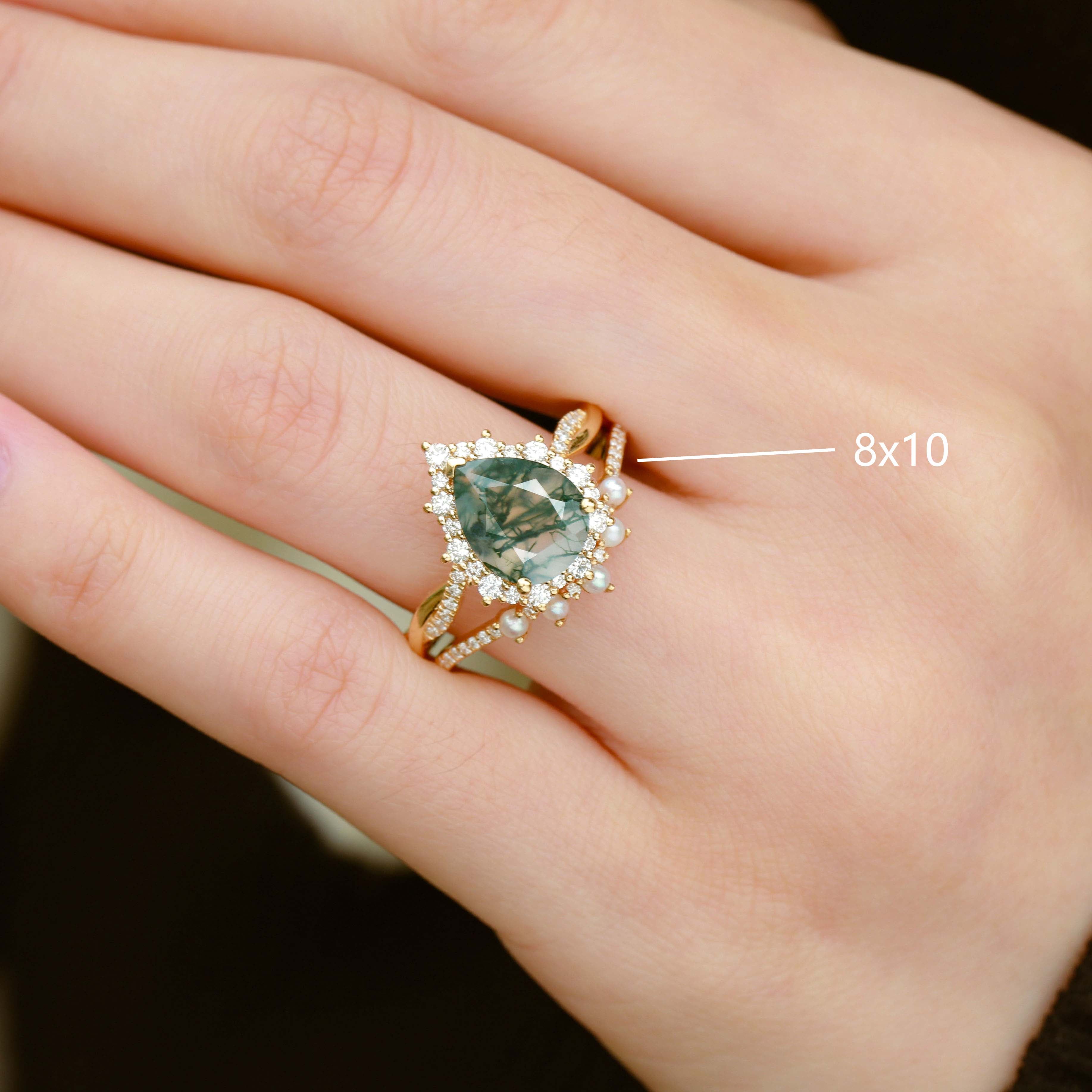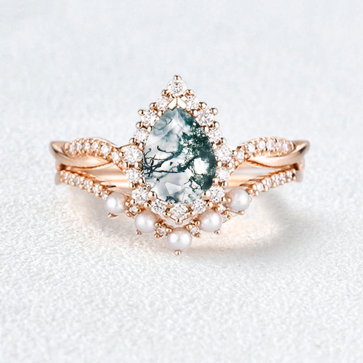 Felicegals Moss Agate Rings Pear Shaped Engagement Ring Pear Moss Agate Ring Vine Band Pearl Band Infinity Ring Bridal Set 2pc Rose Gold Ring