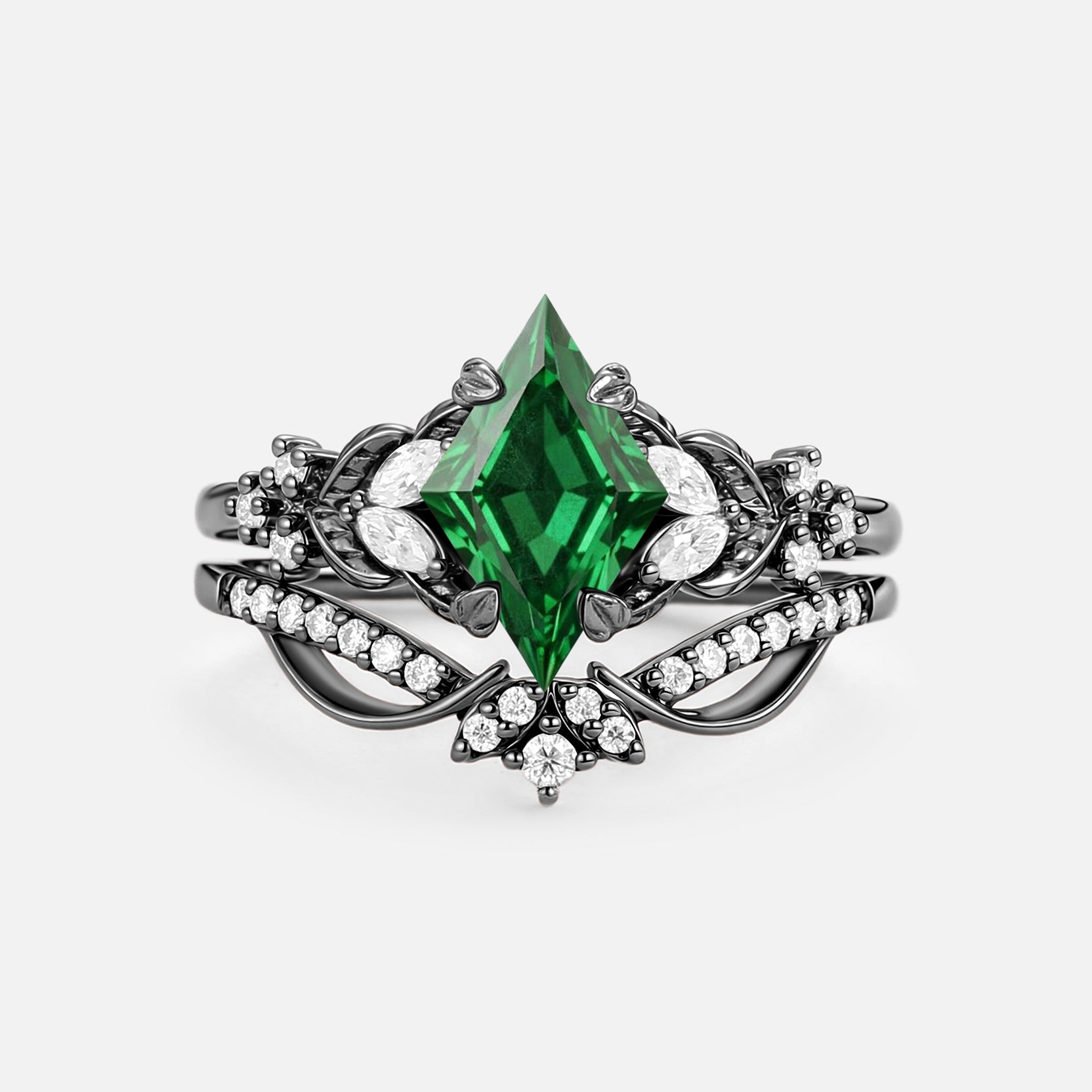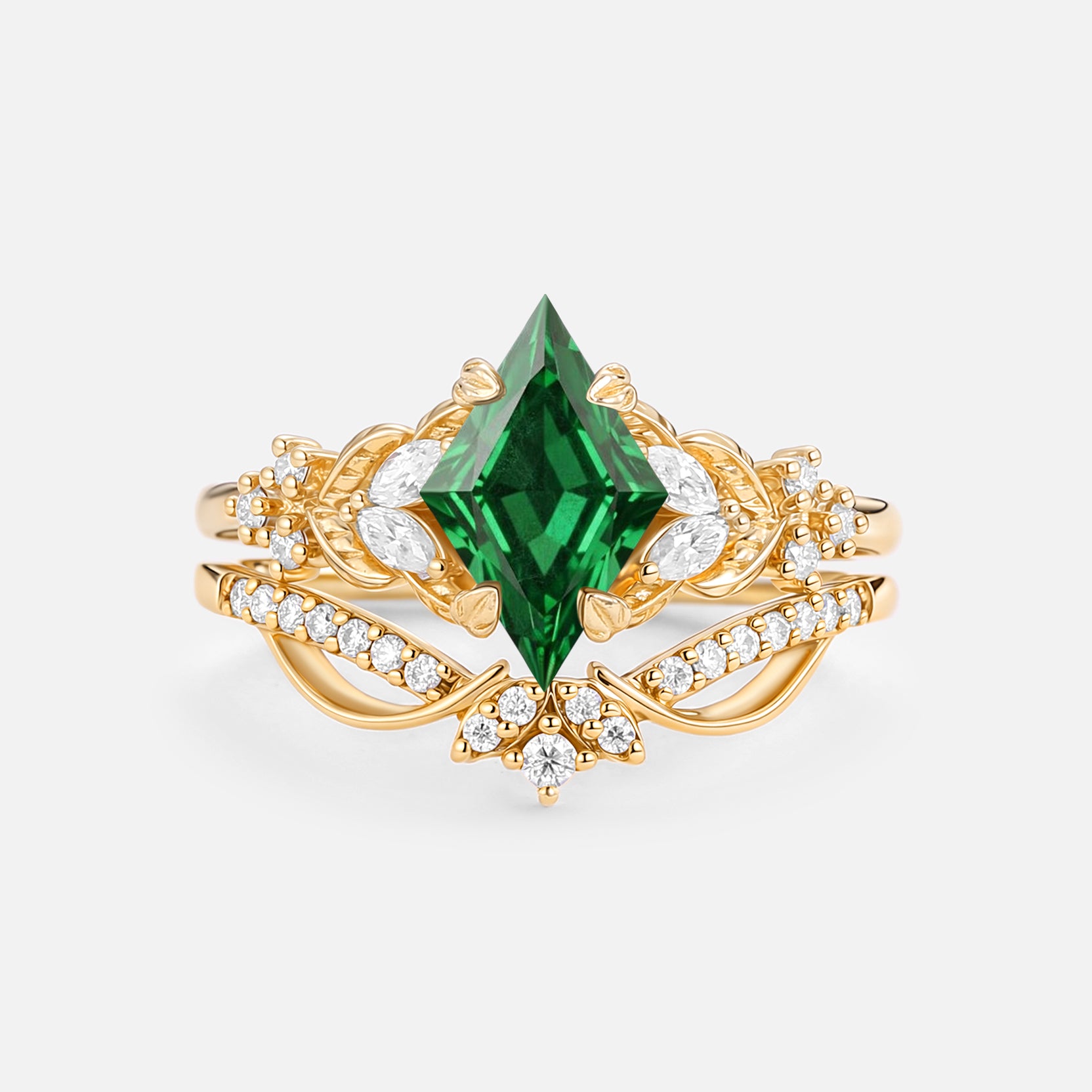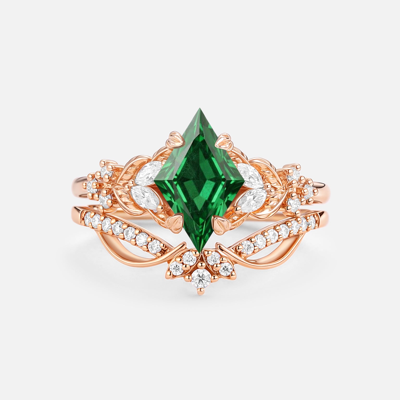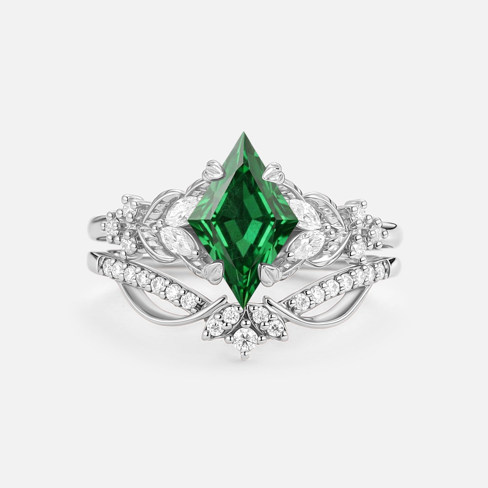 Rhombus Cut Lab Emerald Leafy Engagement Ring Set 2pcs - Beatrice